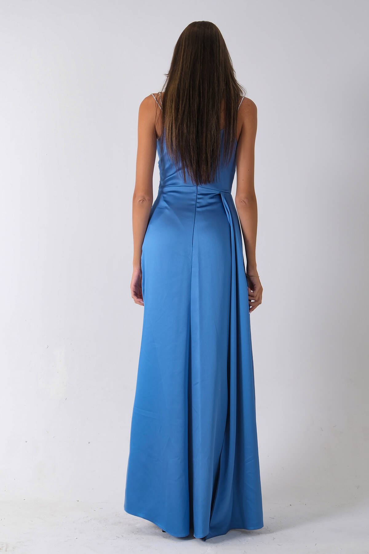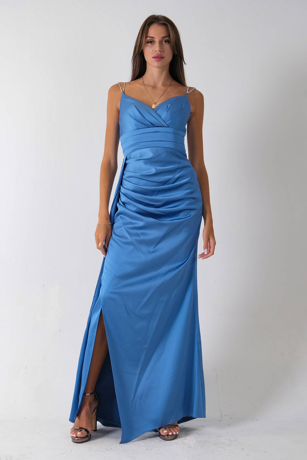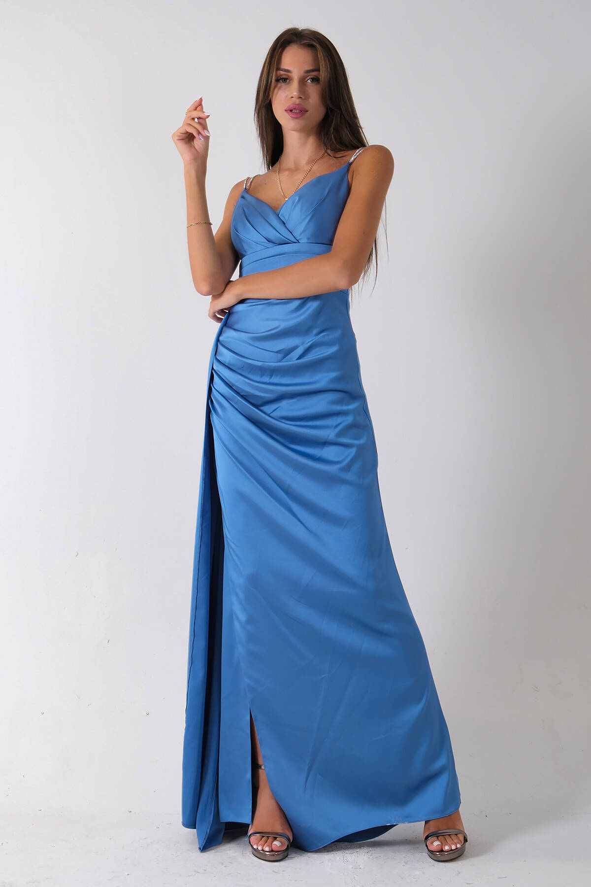 İndigo Gümüş Askı Detaylı Yırtmaçlı Straplez Abiye 0801023.98