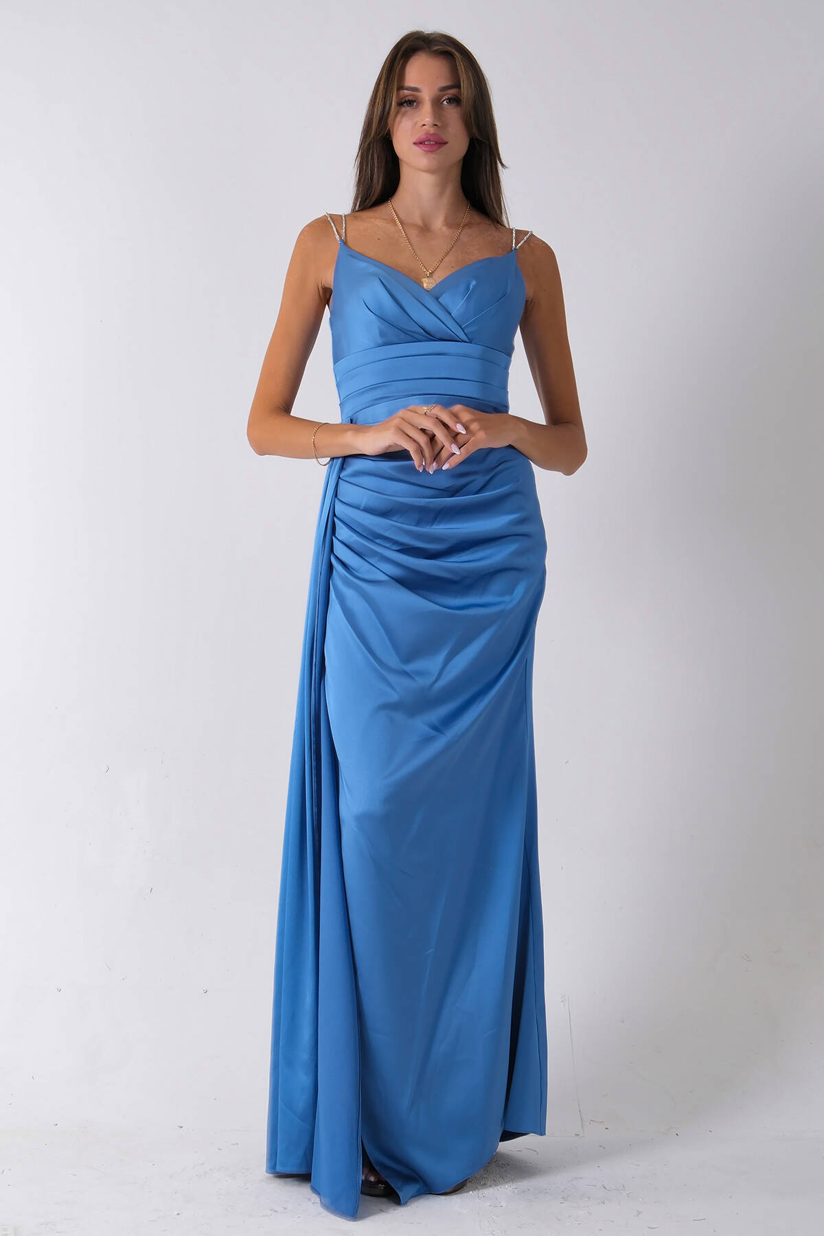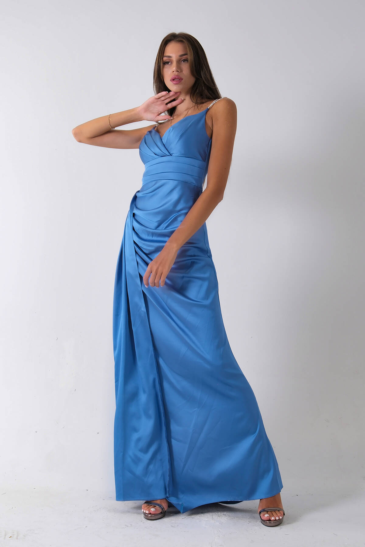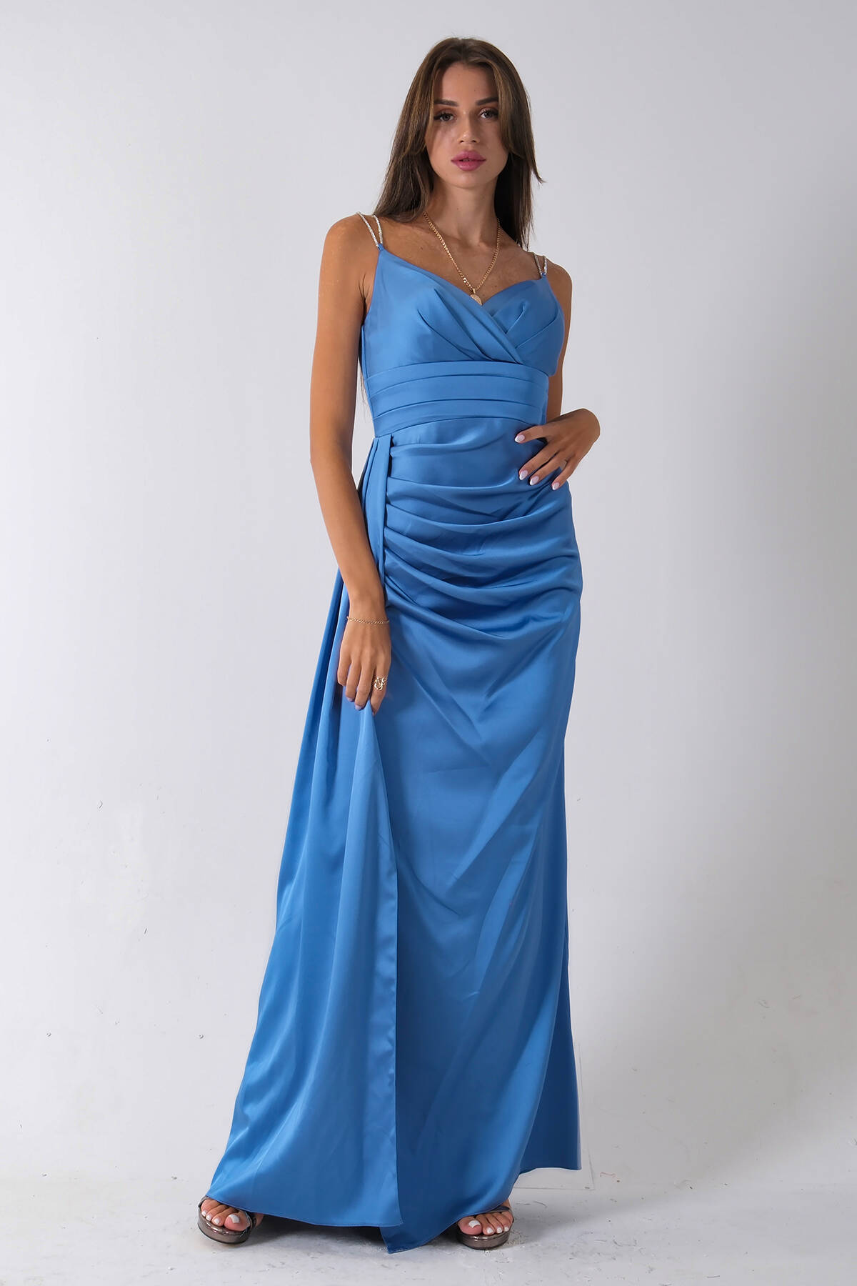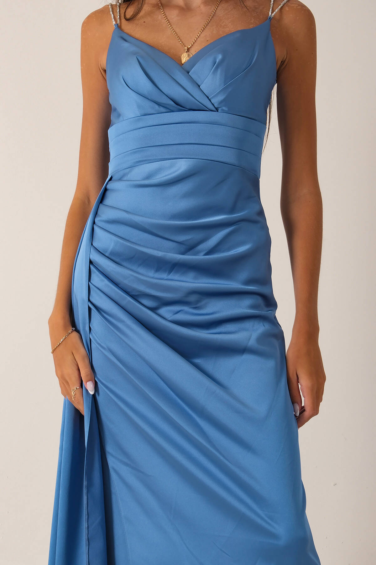 İndigo Gümüş Askı Detaylı Yırtmaçlı Straplez Abiye 0801023.98