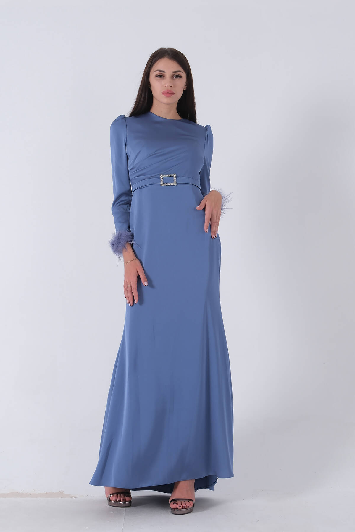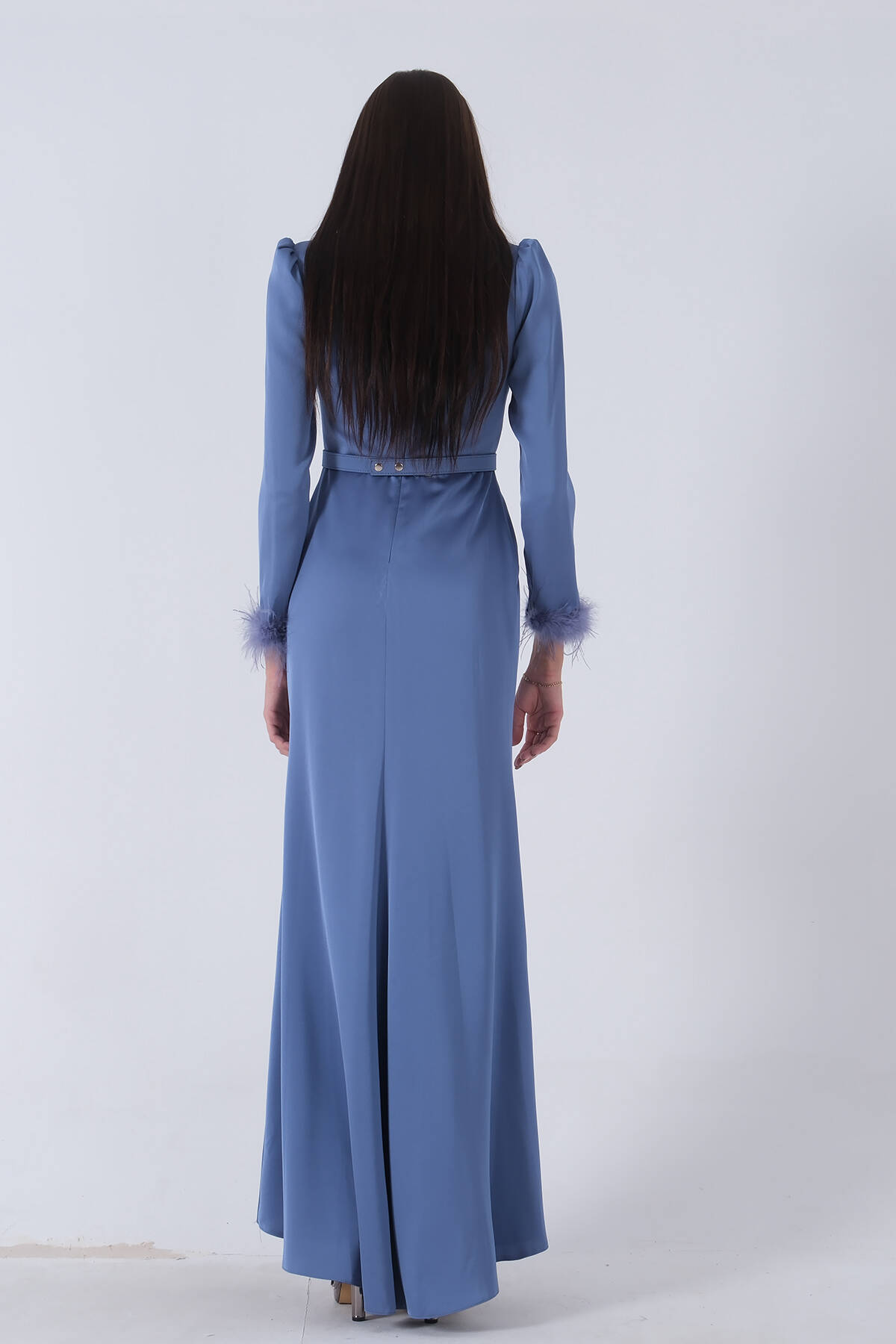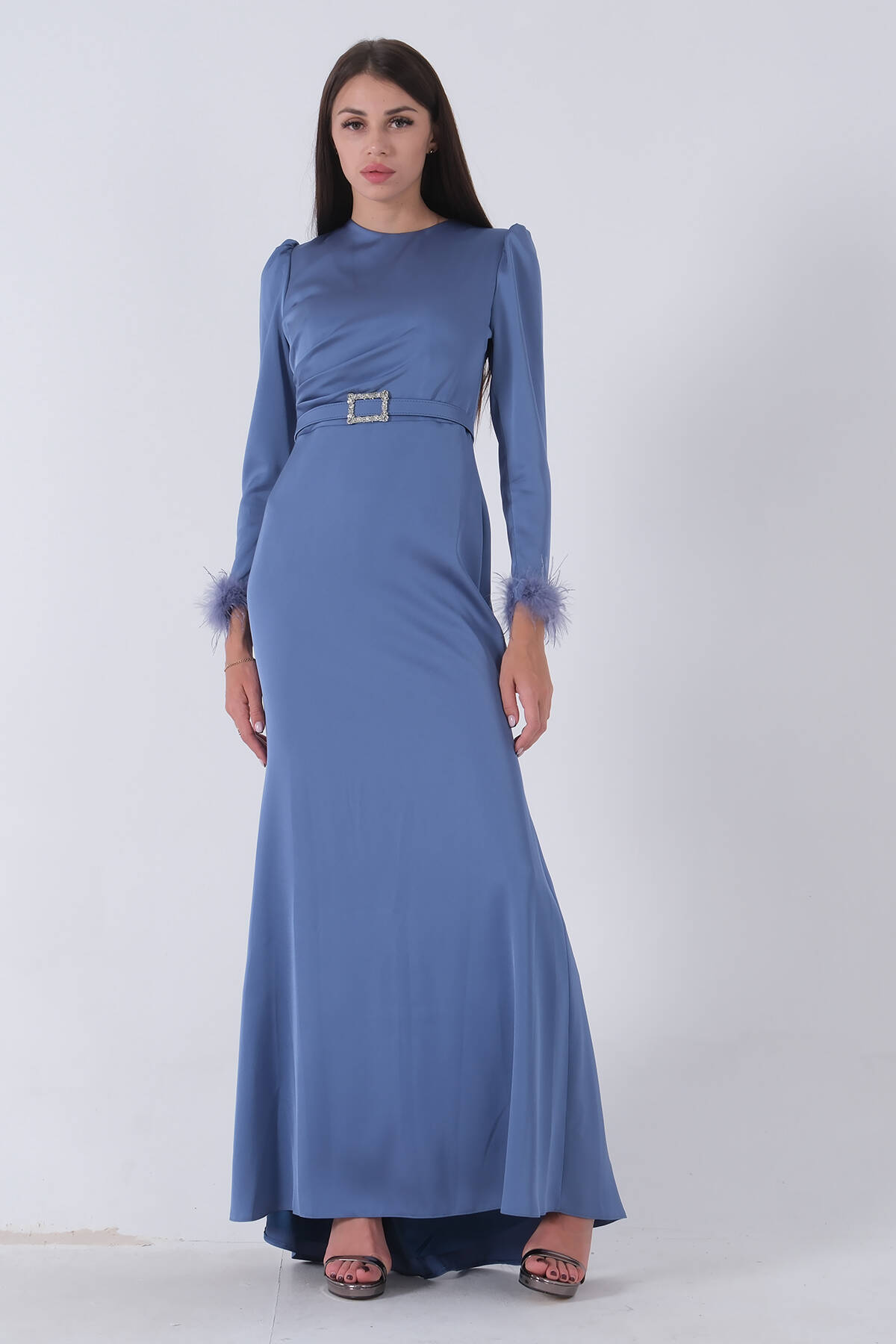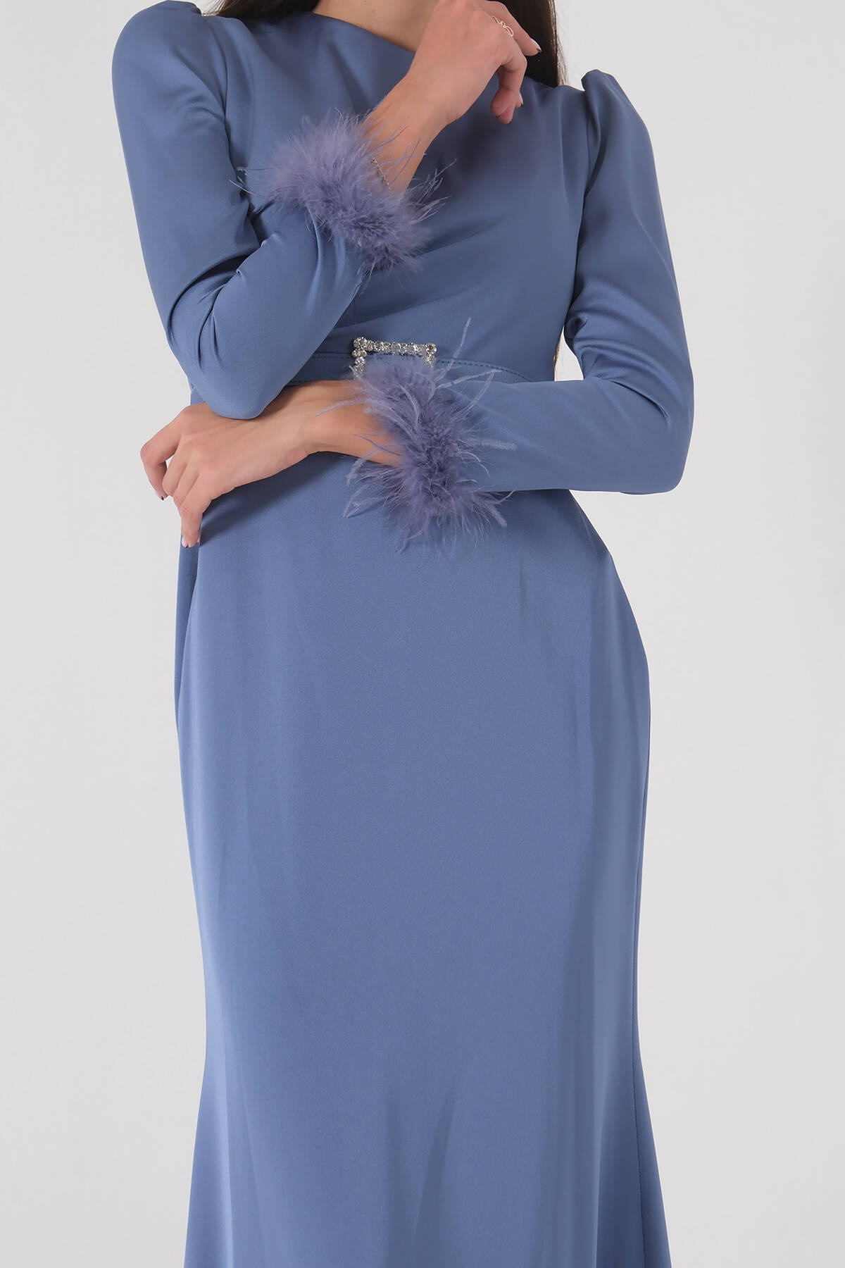 İndigo Kemerli Kol Ucu Tüylü Tesettür Abiye 6502476.98