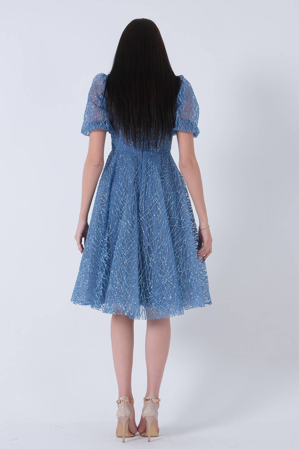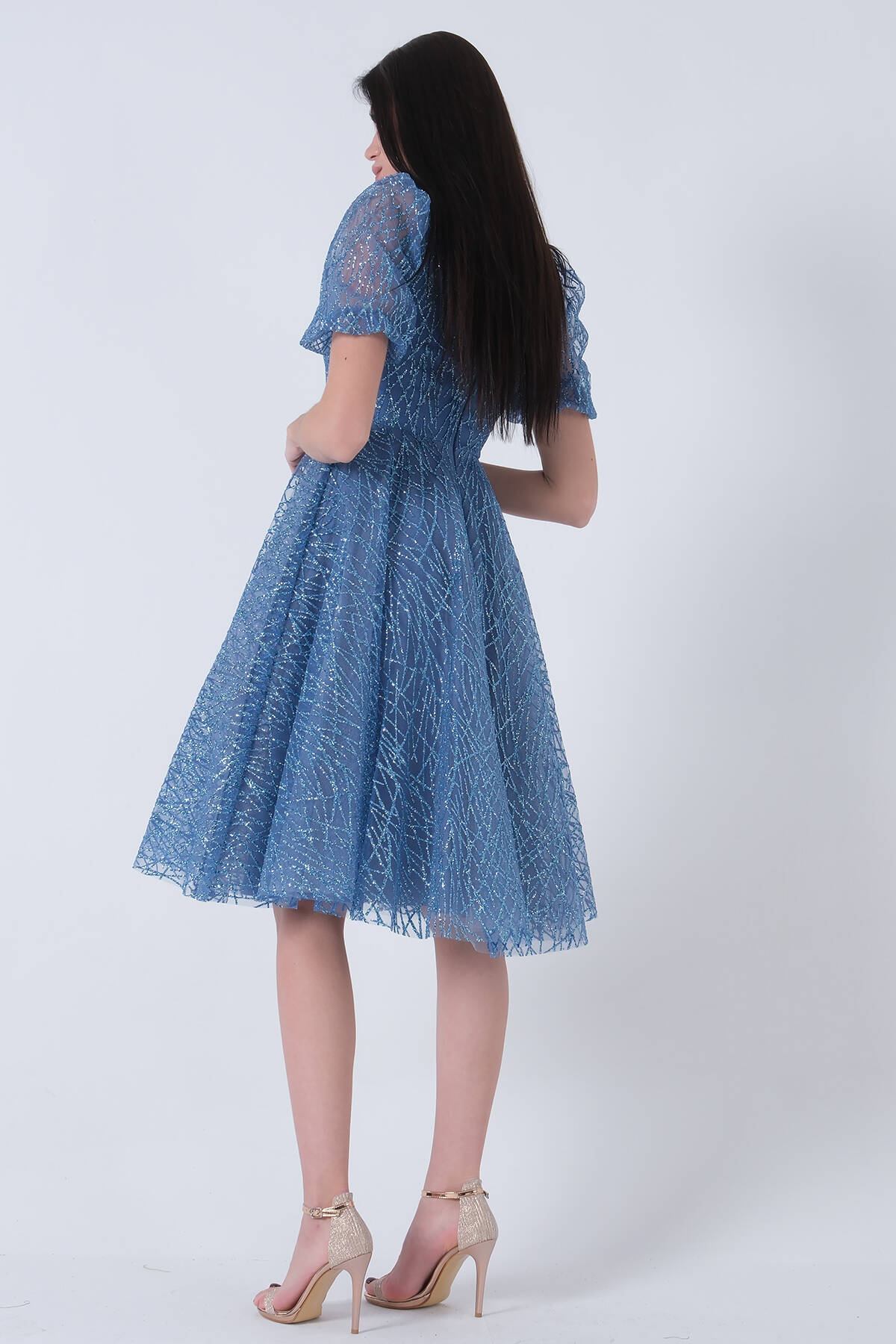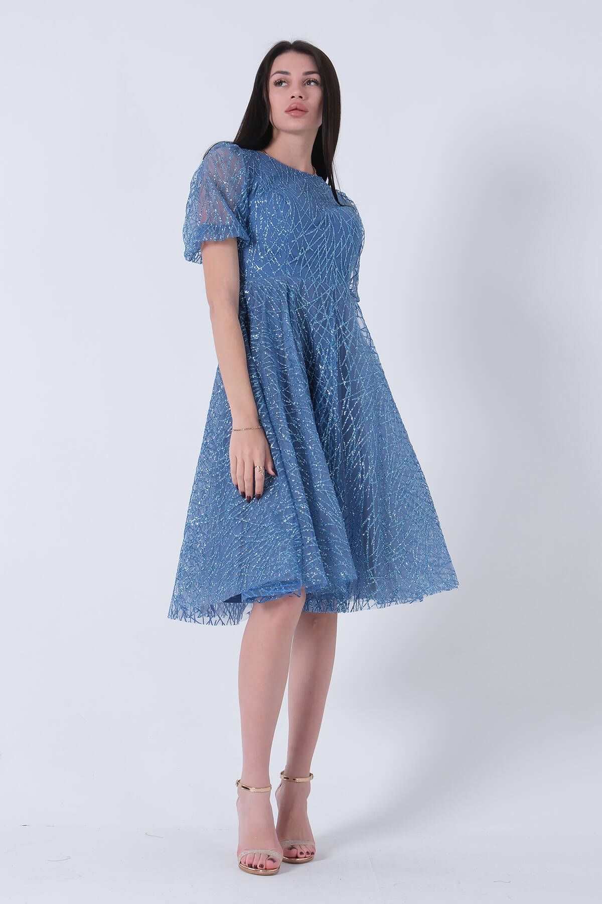 İndigo Midi Boy Kısa Yuvarlak Yaka Simli Tül Abiye Elbise 6502459.98