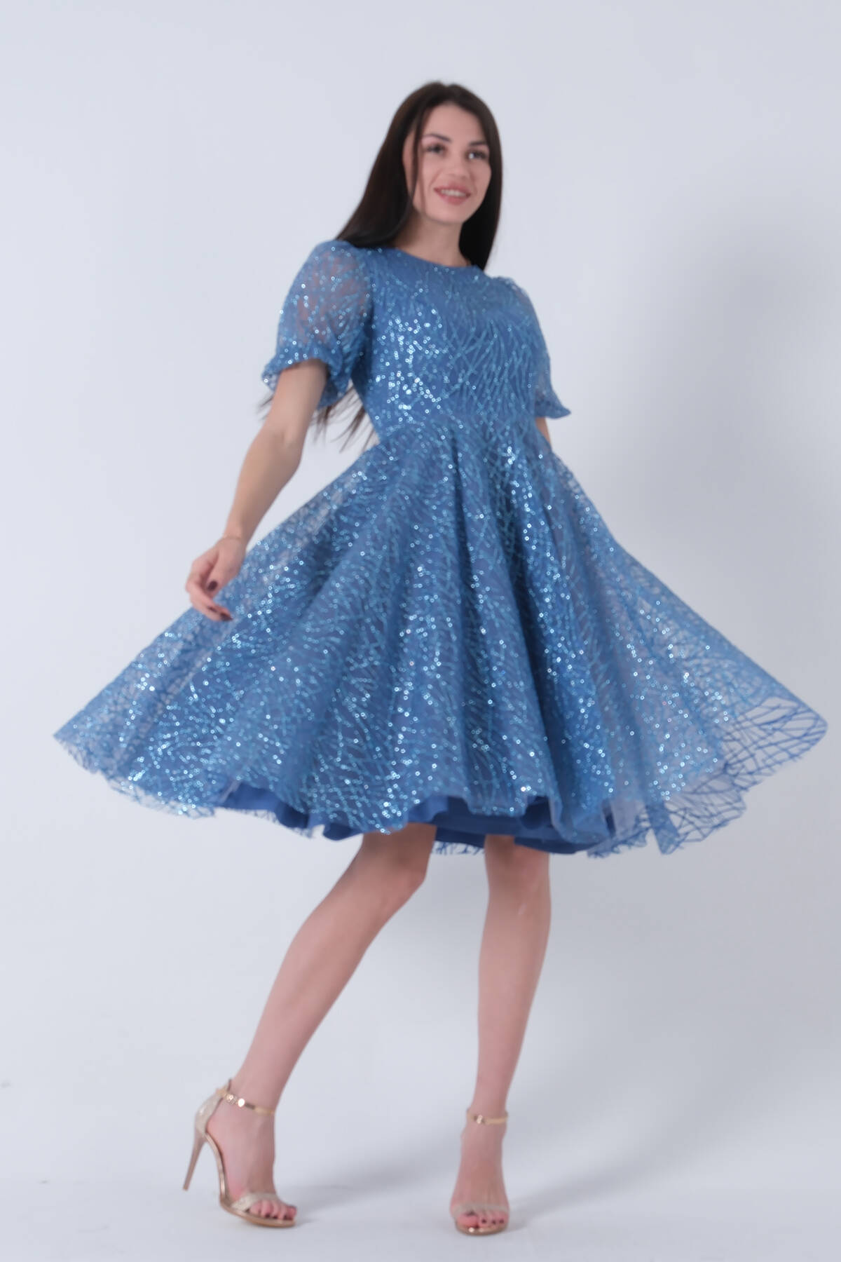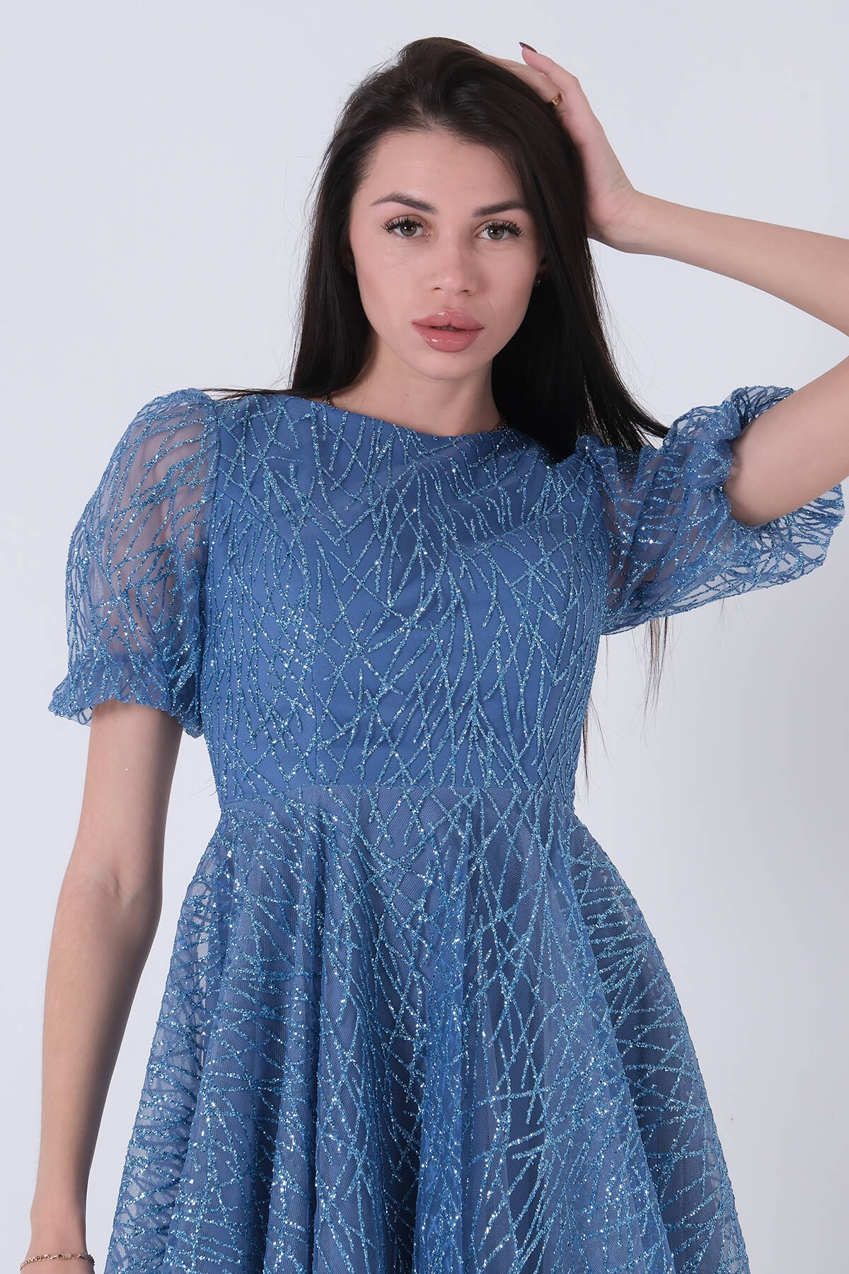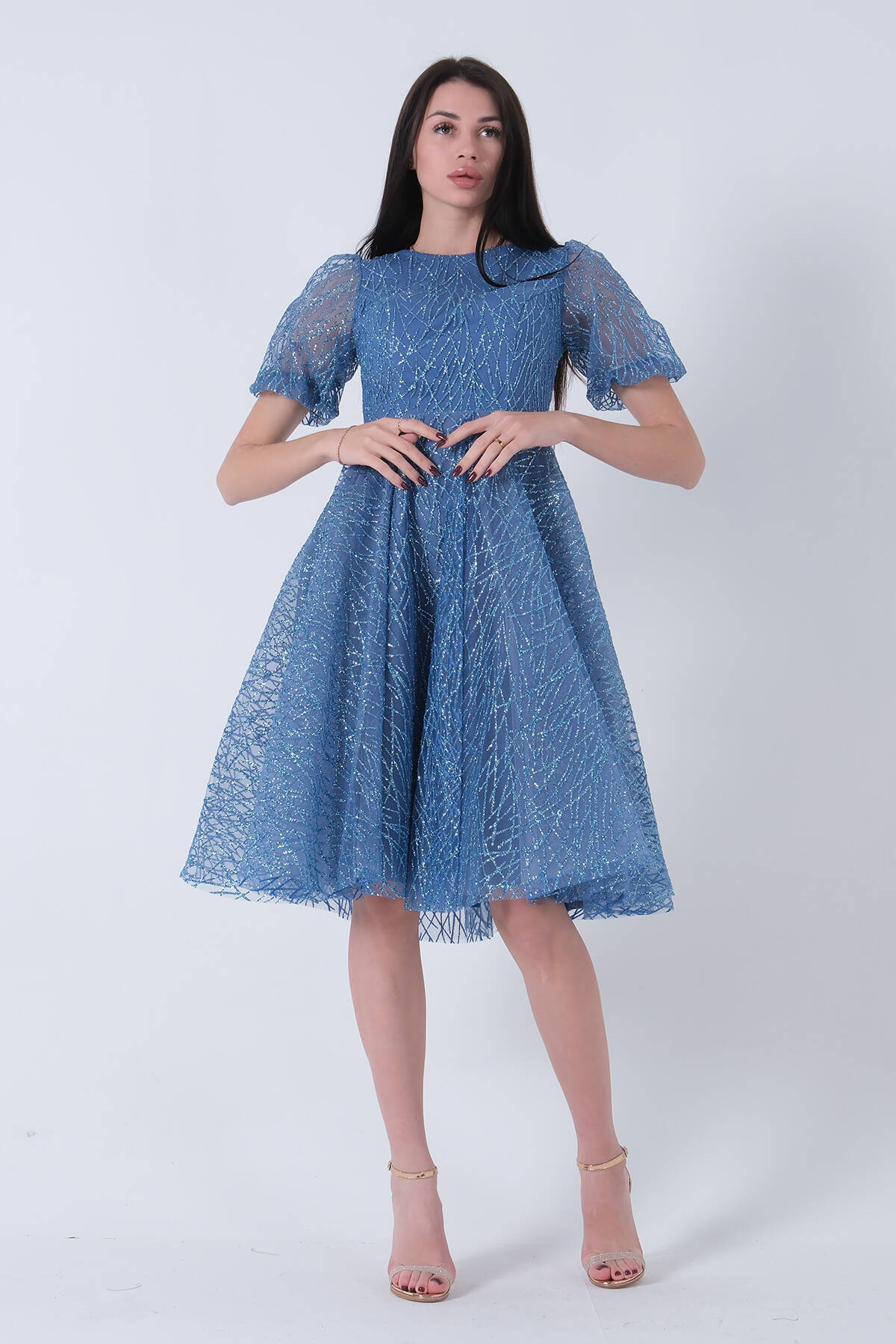 İndigo Midi Boy Kısa Yuvarlak Yaka Simli Tül Abiye Elbise 6502459.98