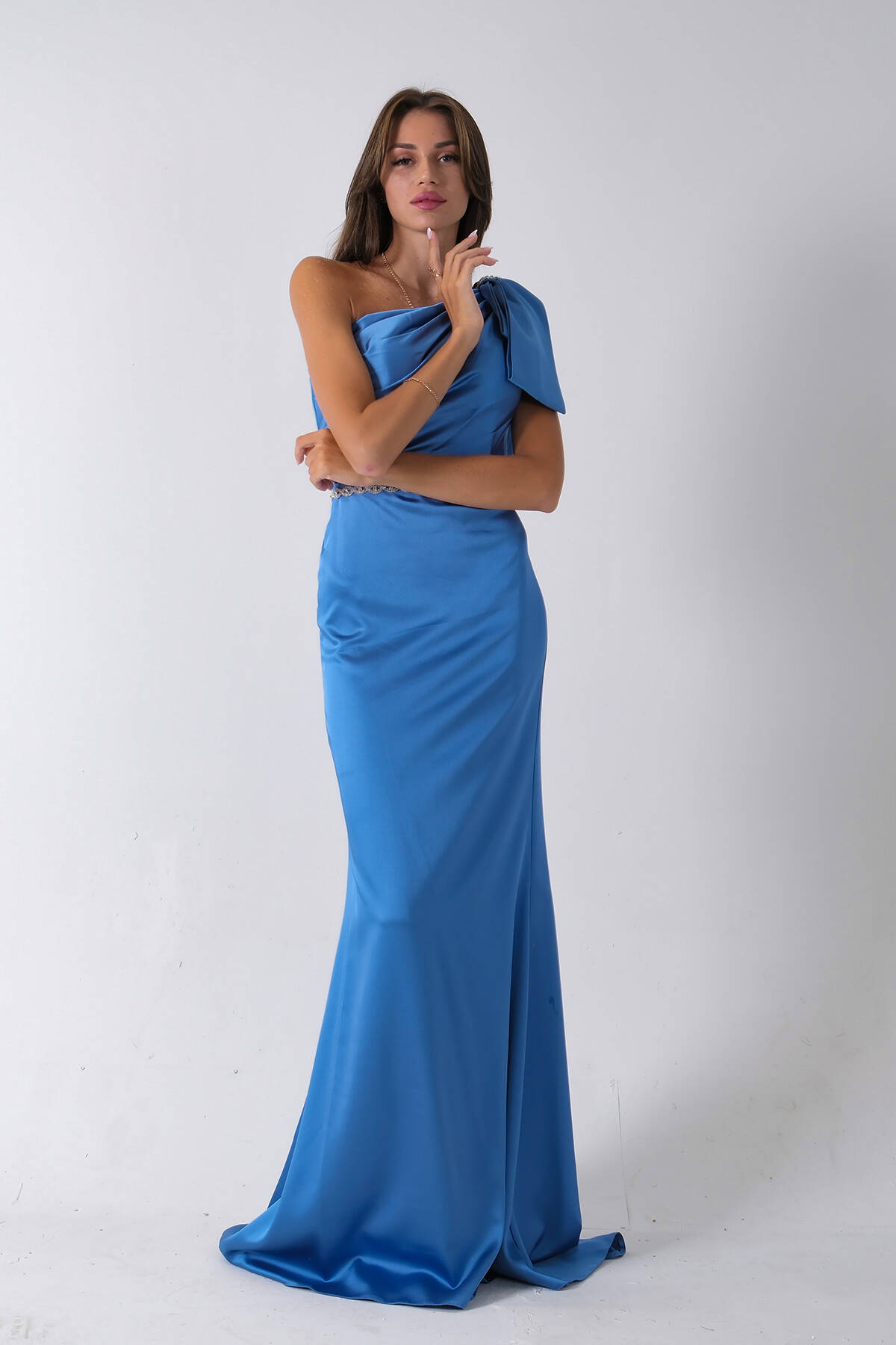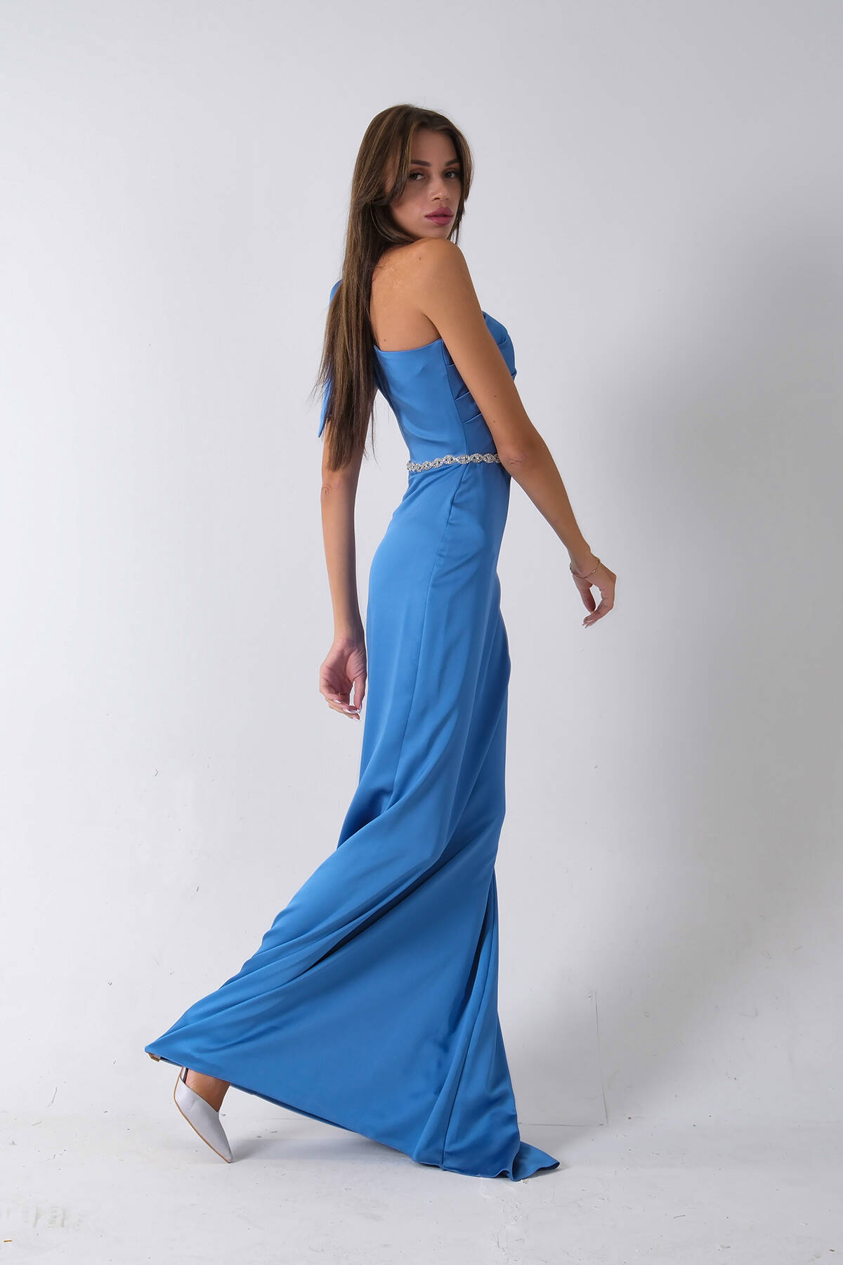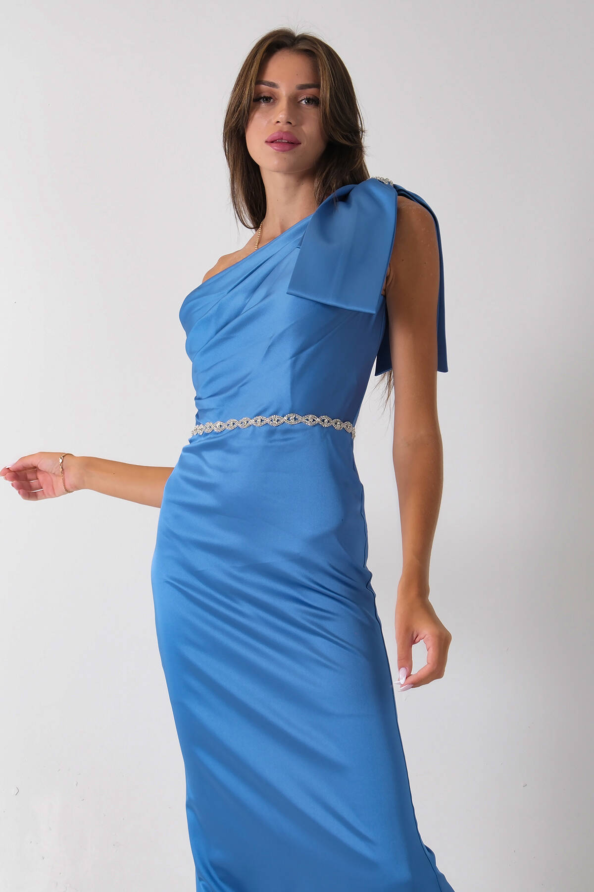 İndigo Tek Omuz Drapeli Taş Detaylı Abiye 0801009.98