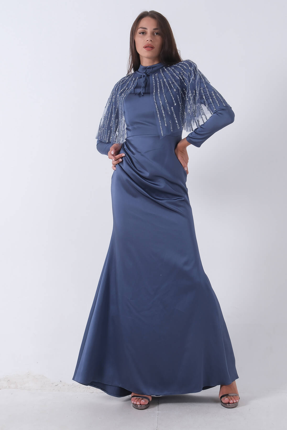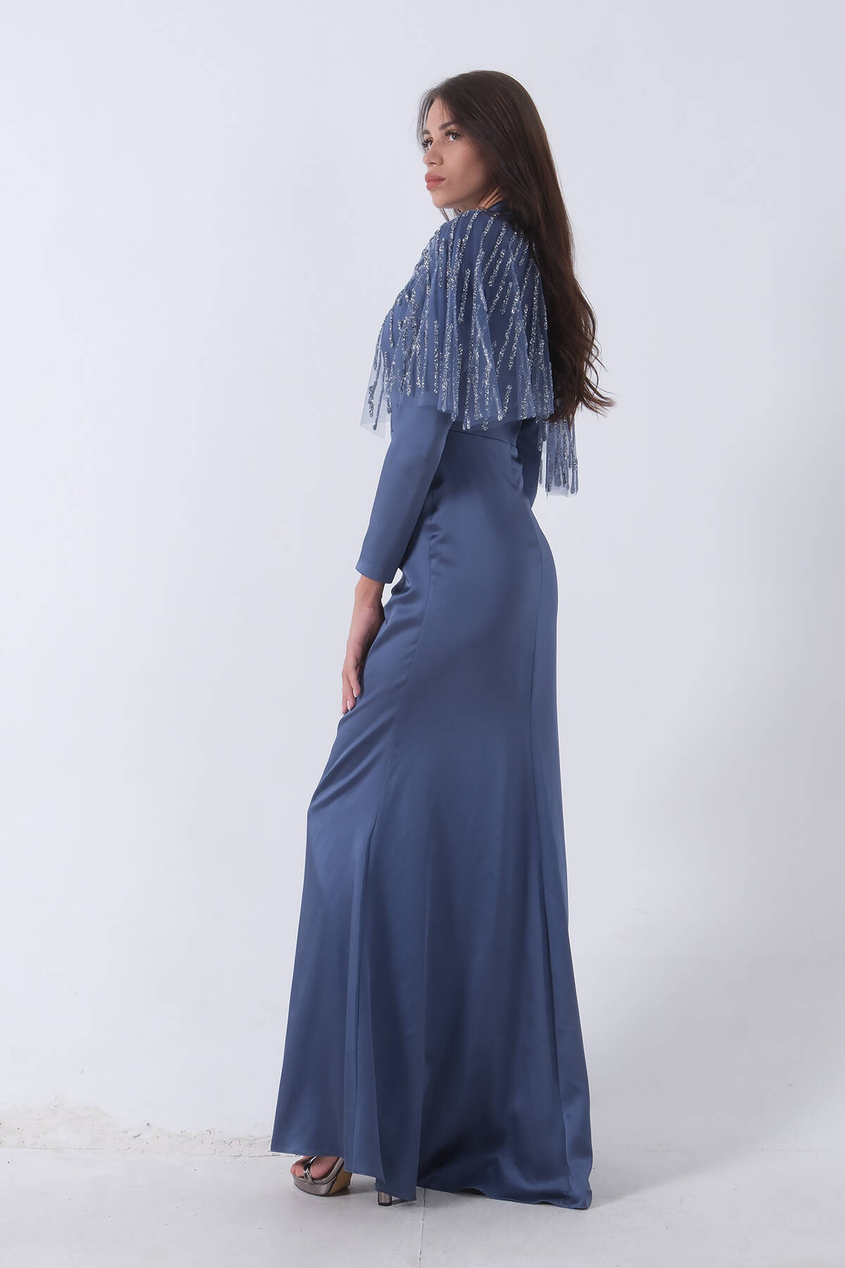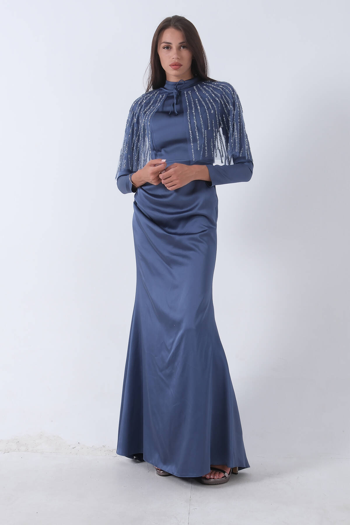 İndigo Yaka Seyyar Şal Ayrobin Eklemeli Tesettür Abiye 6502477.98