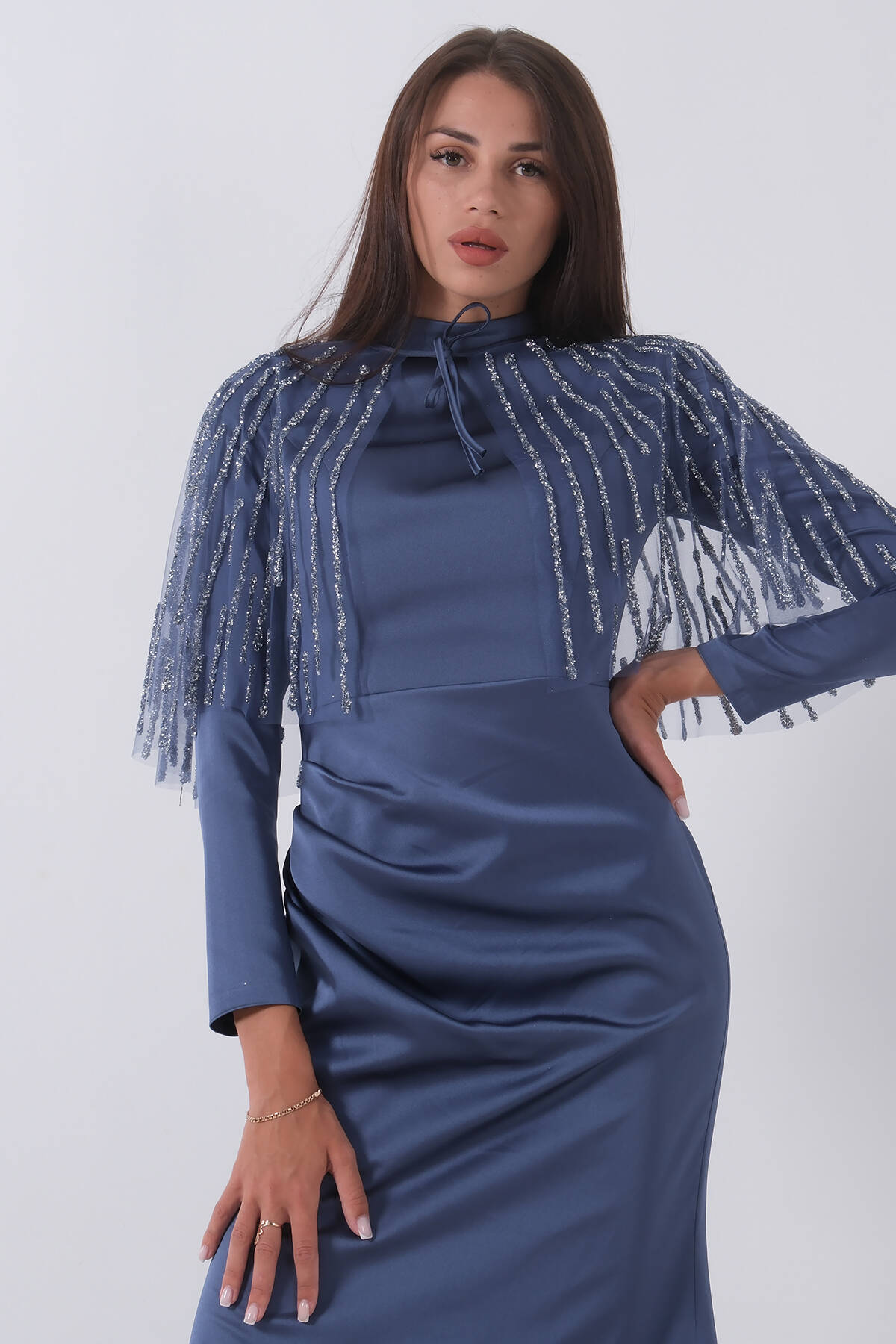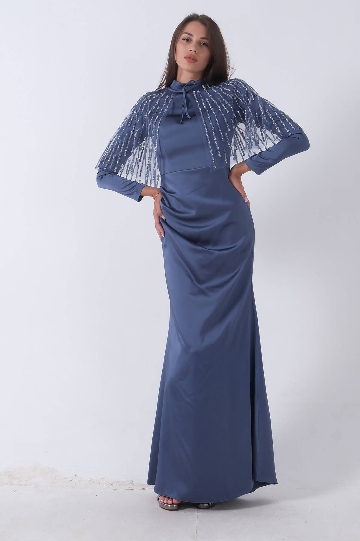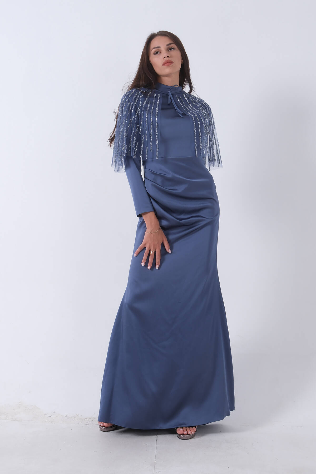 İndigo Yaka Seyyar Şal Ayrobin Eklemeli Tesettür Abiye 6502477.98