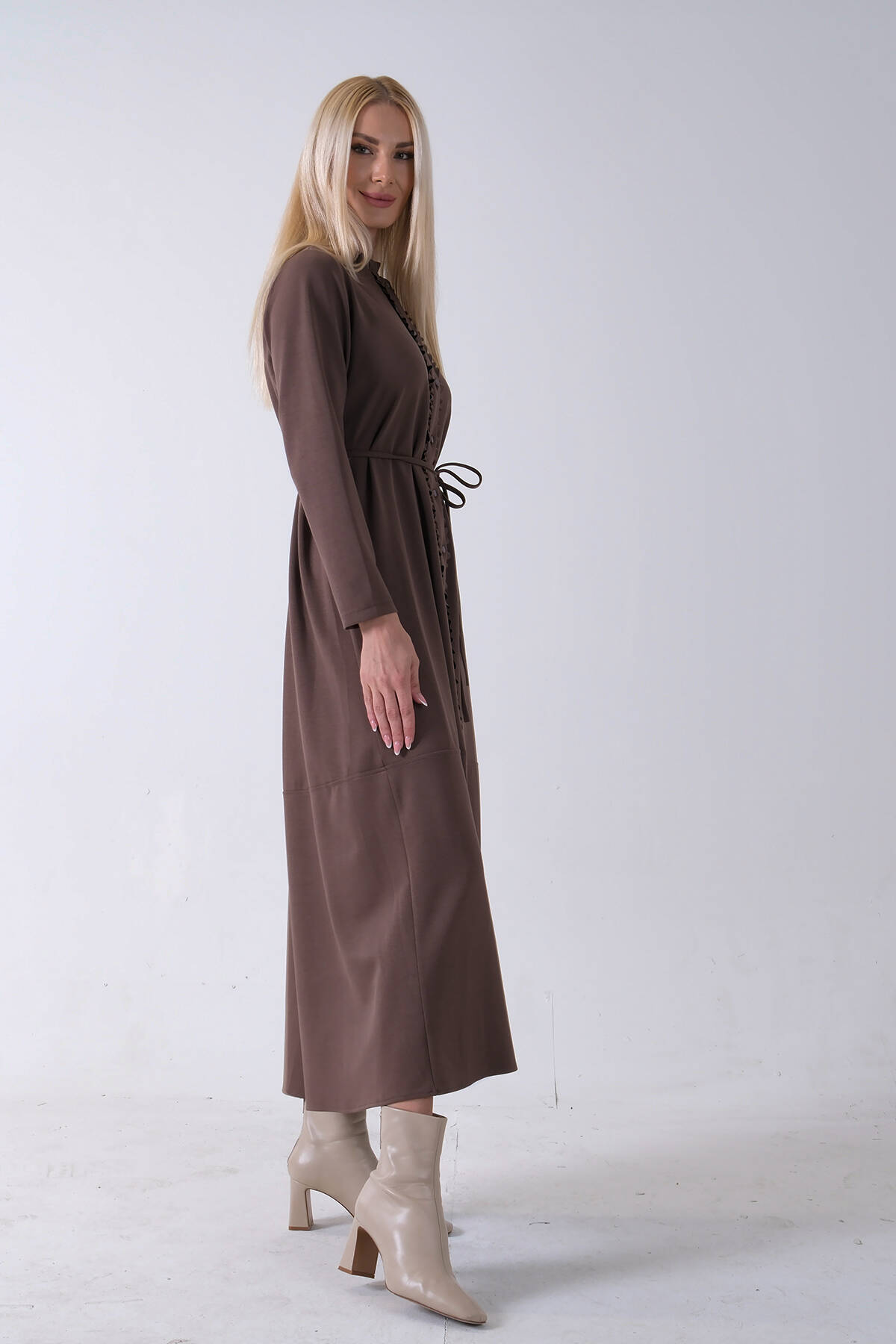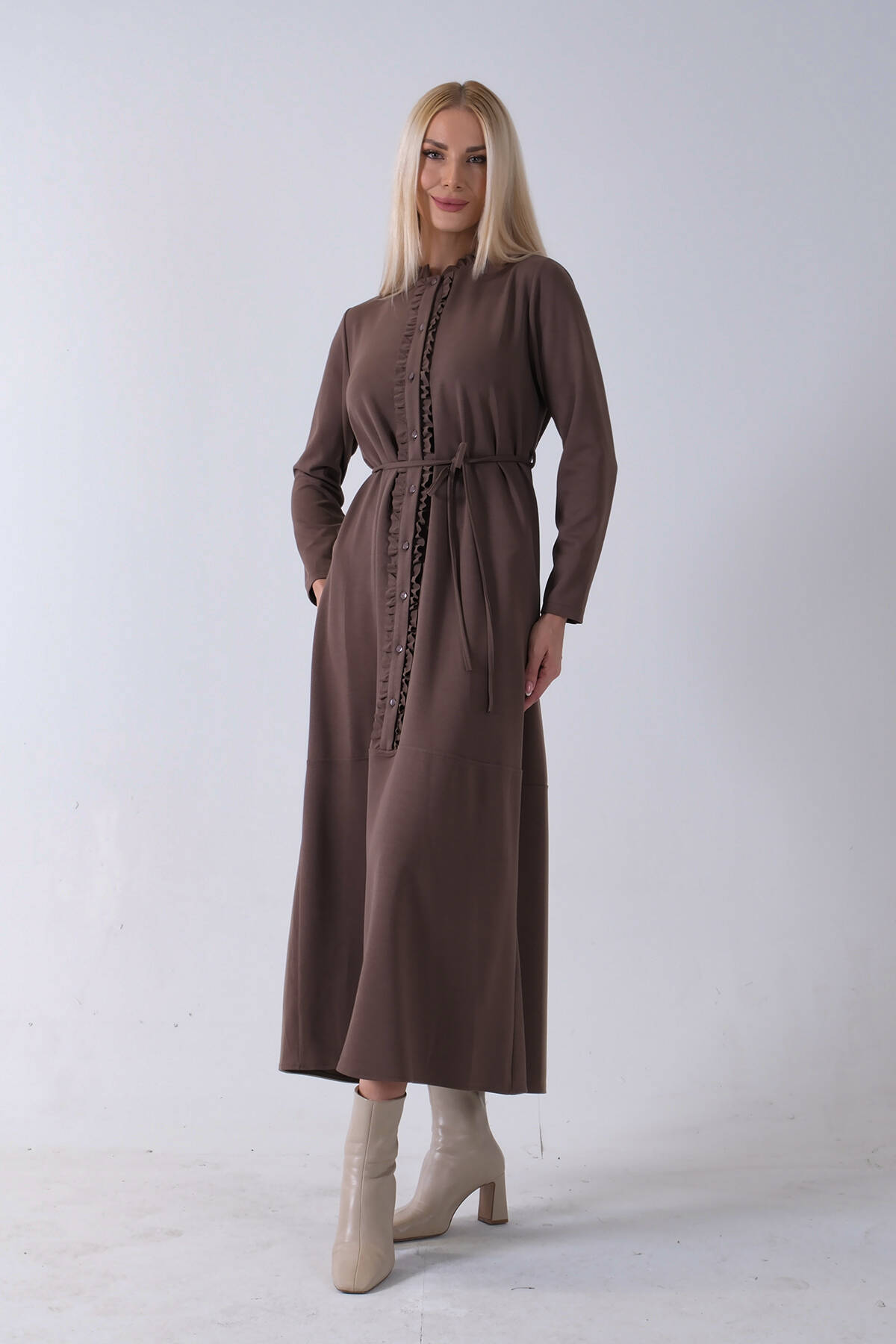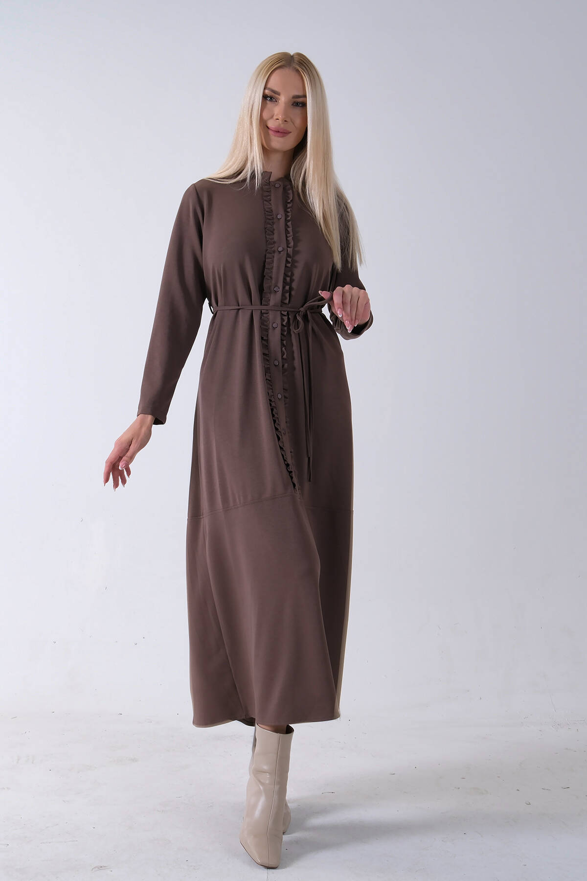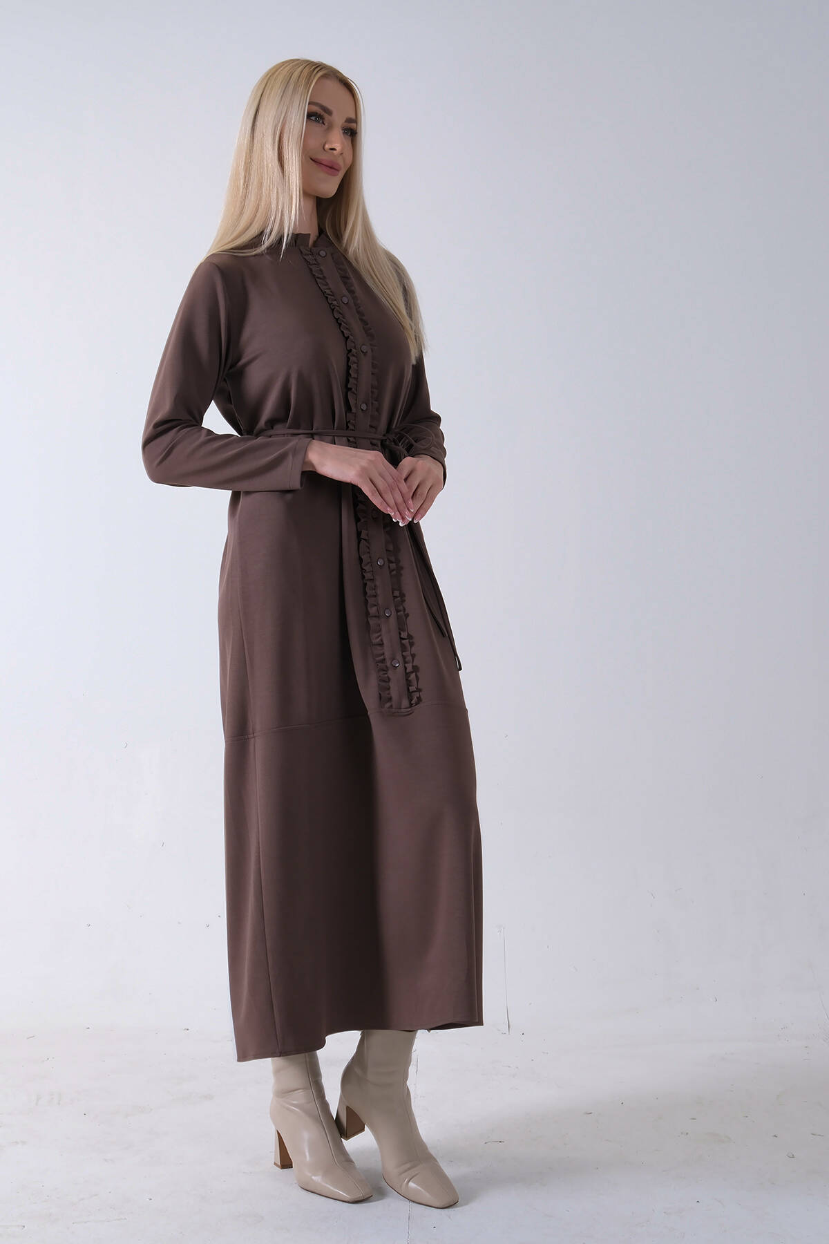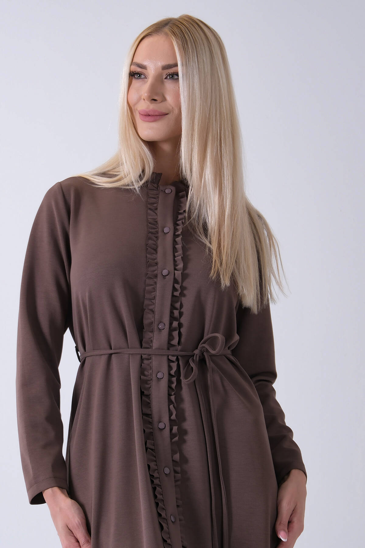 Kahve Belden Bağlamalı Yaka Fırfır Detaylı Düğme Kapamalı Elbise 4571574.05