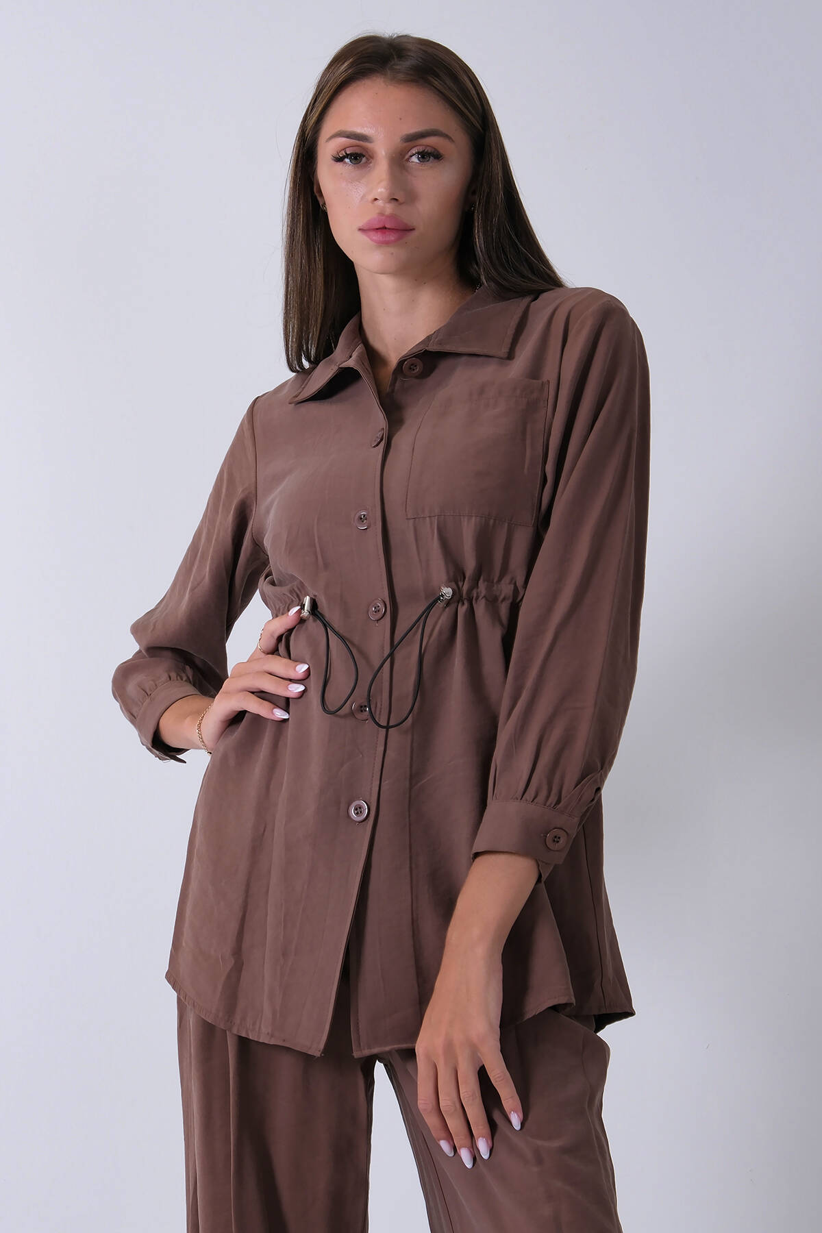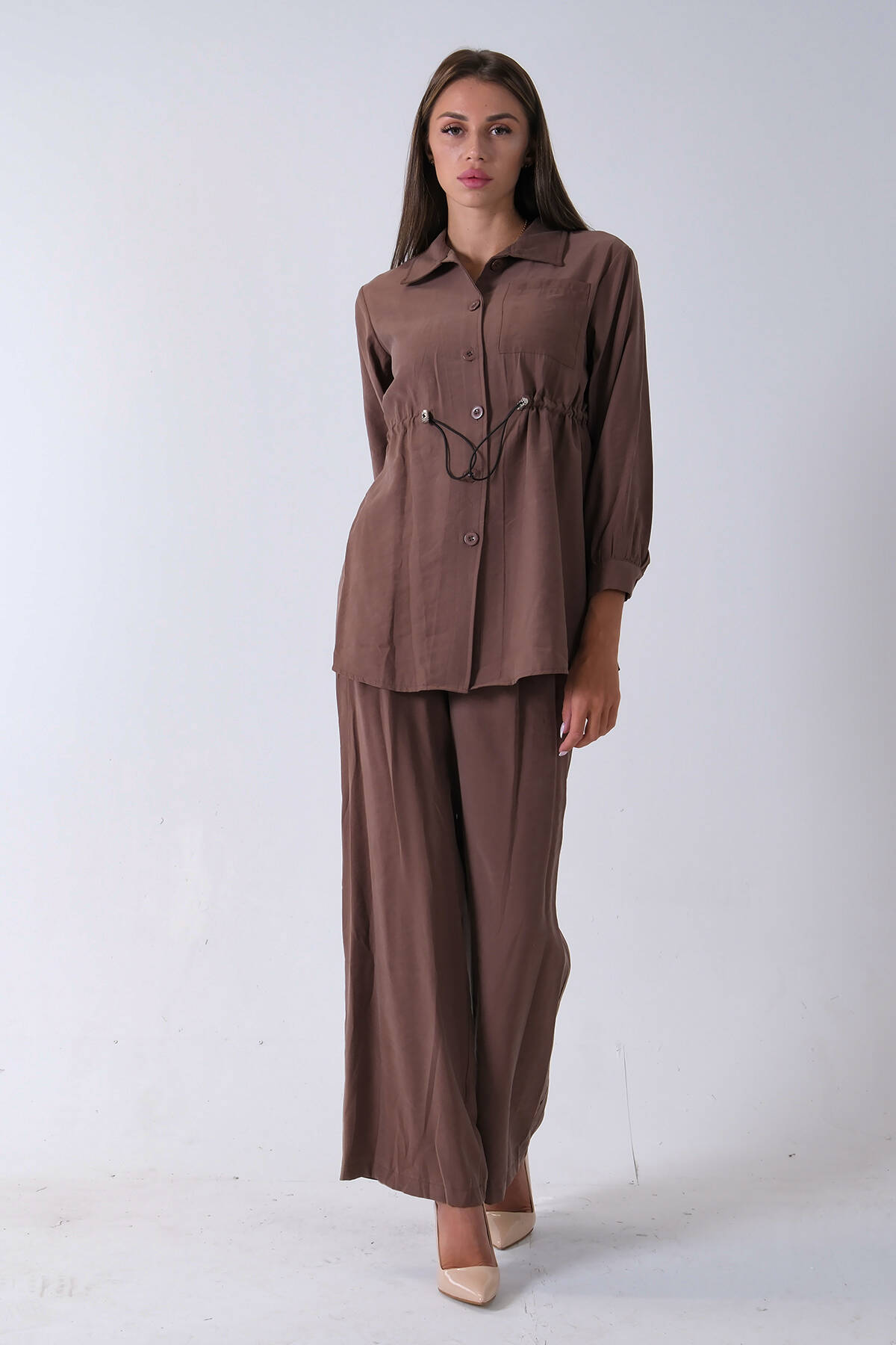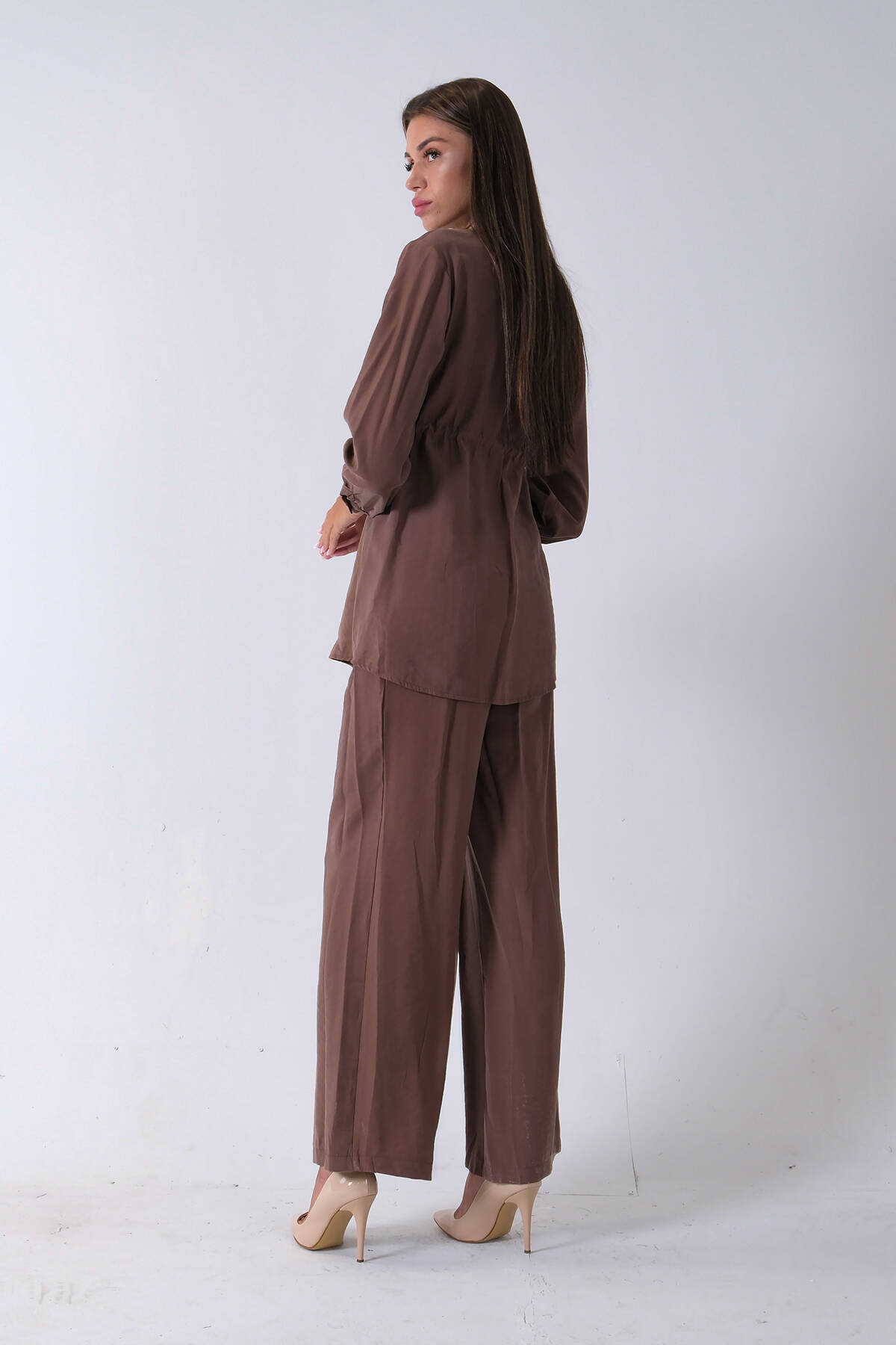 Kahve Beli Kemerli Gömlek Yaka Tunik Pantolonlu Takım 4592258.05