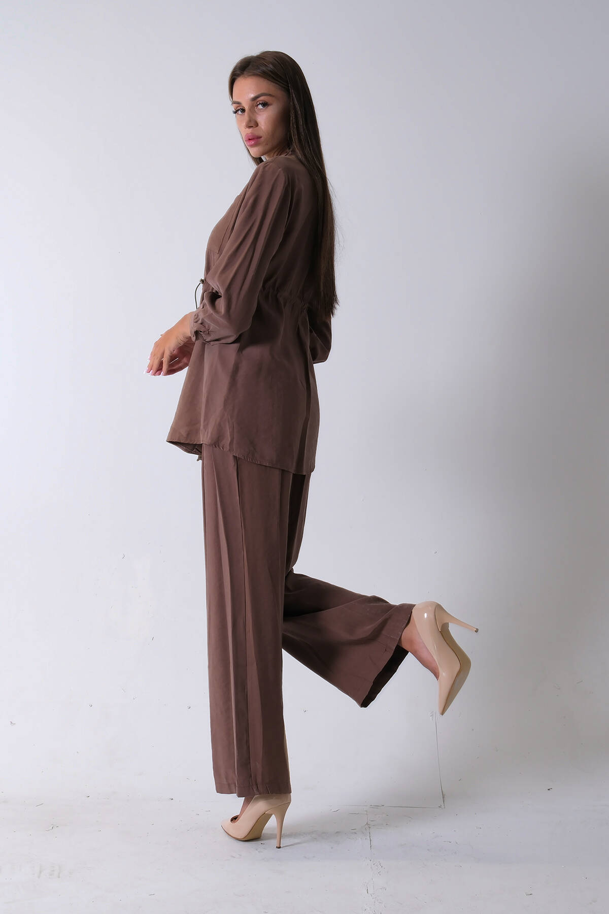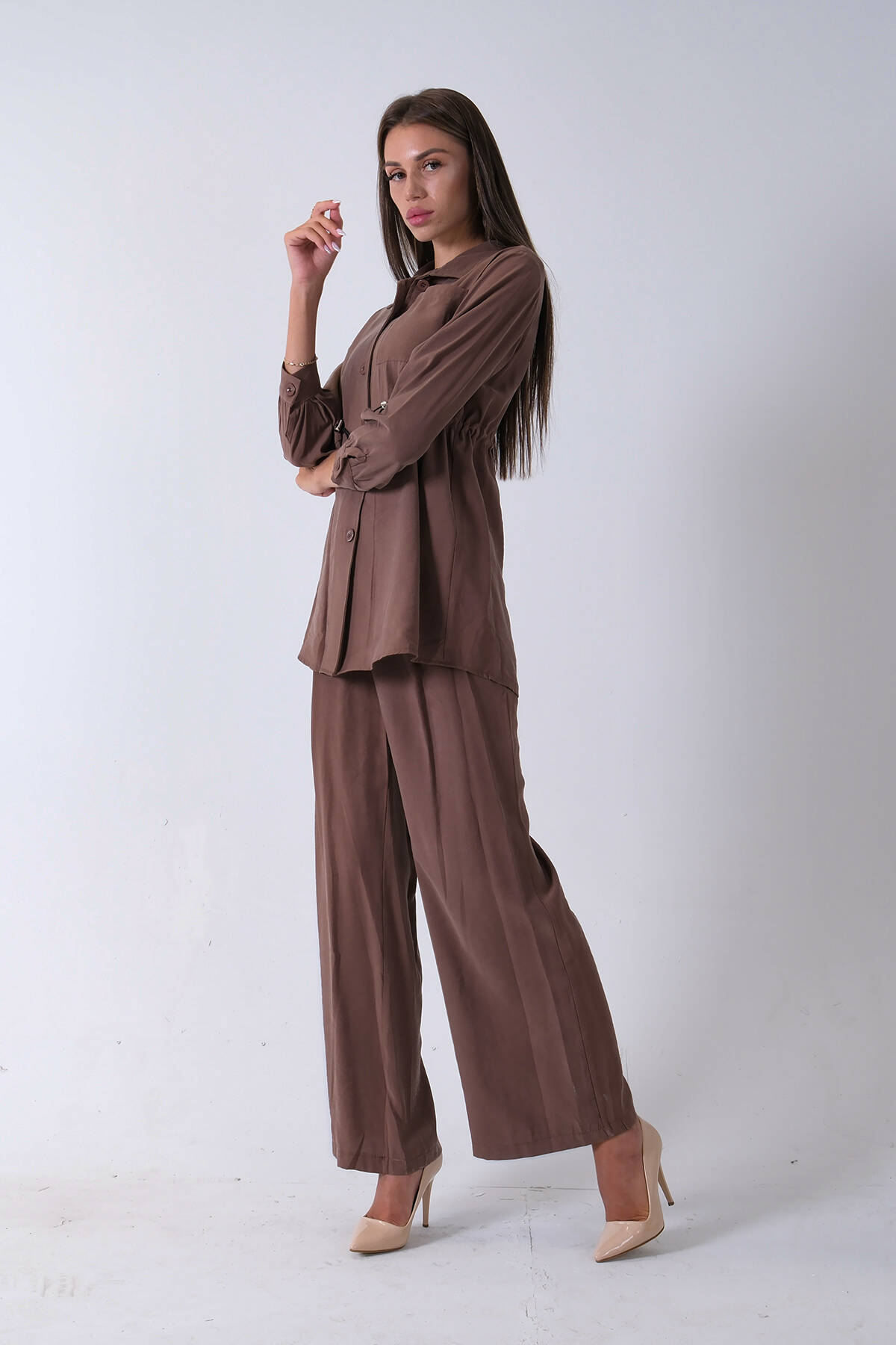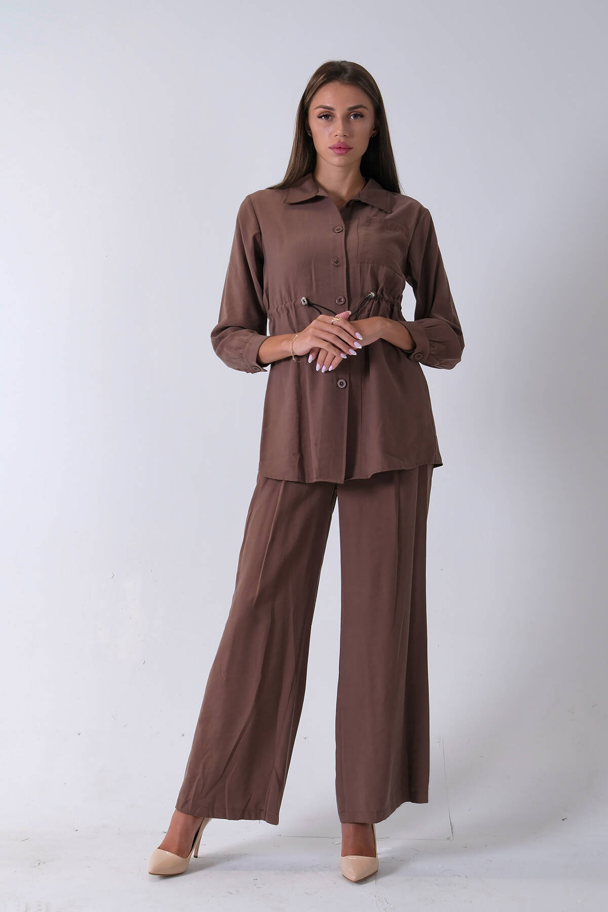 Kahve Beli Kemerli Gömlek Yaka Tunik Pantolonlu Takım 4592258.05