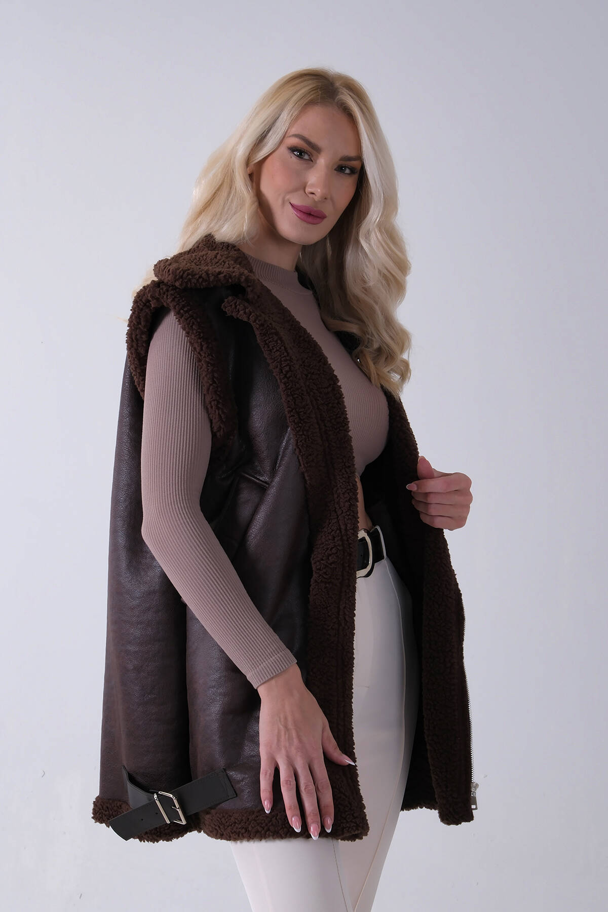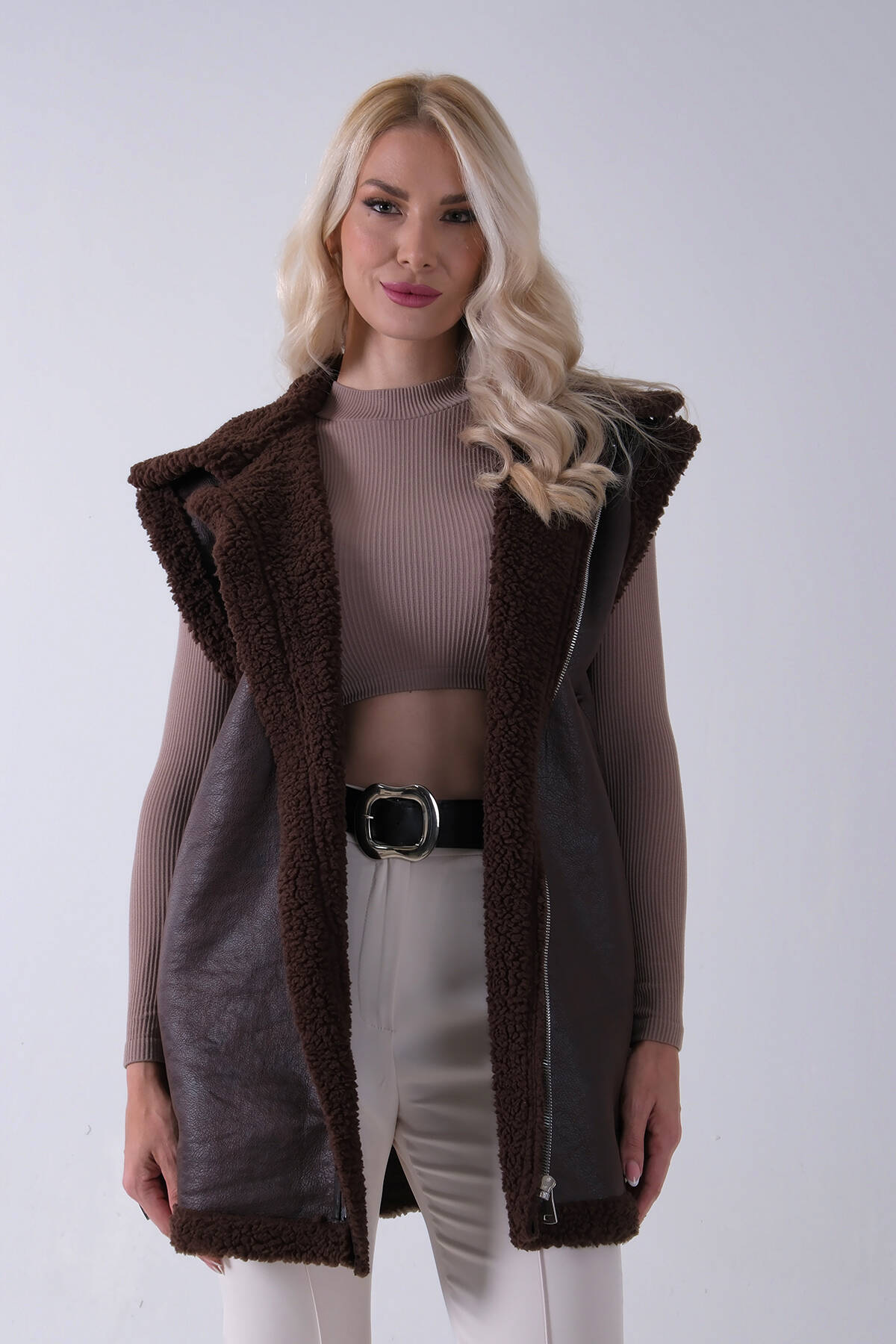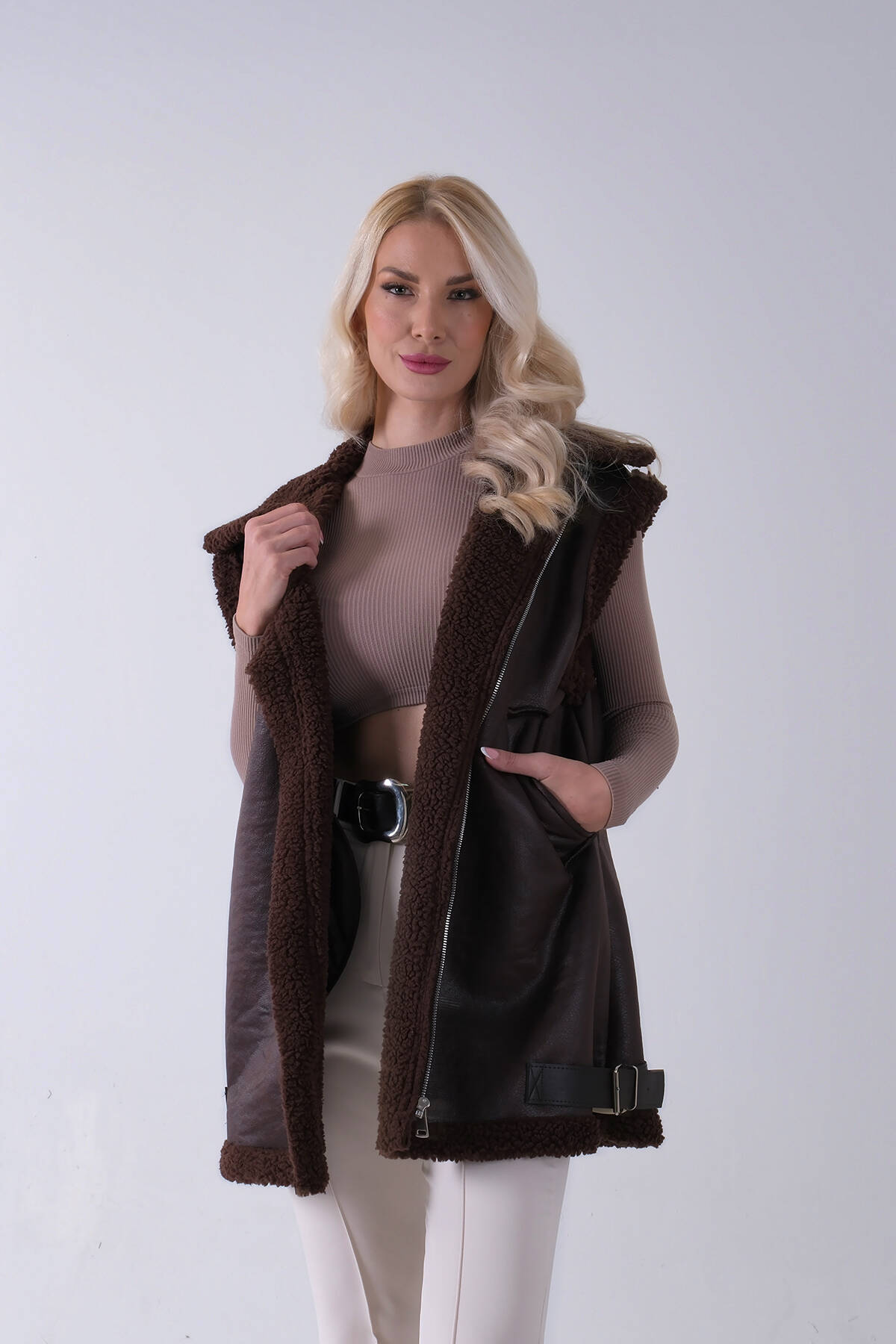Kahve Yakalı Cepli 2 Düğmeli Kemer Bağlamalı Kaşe Yelek 5307107.05