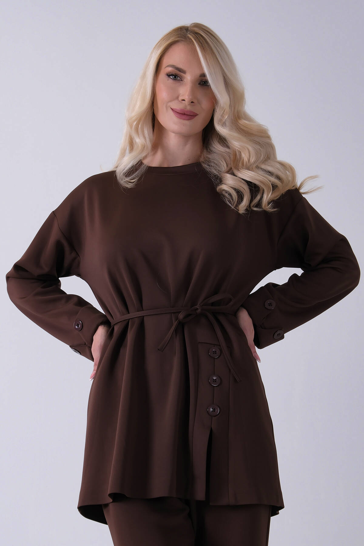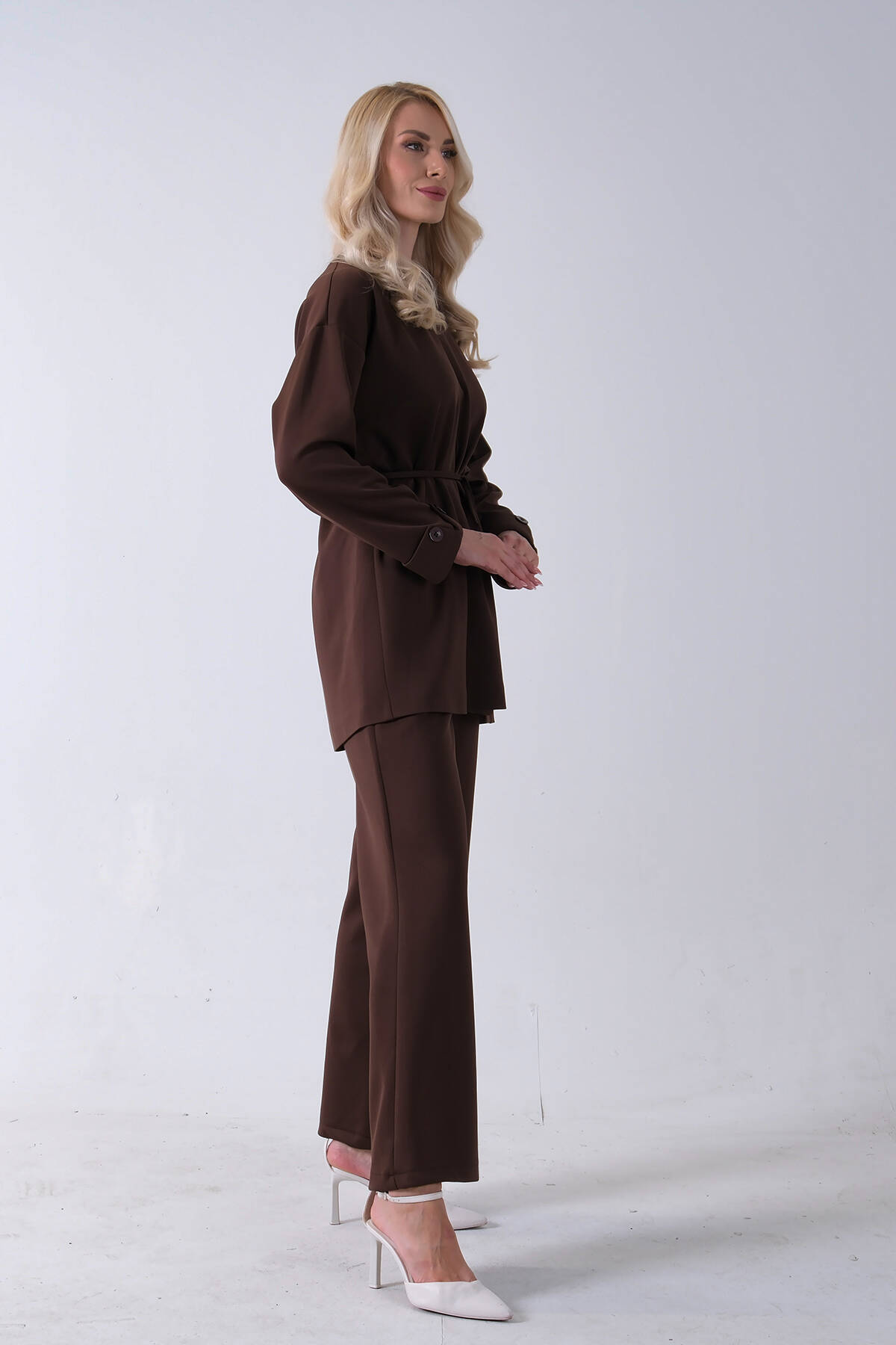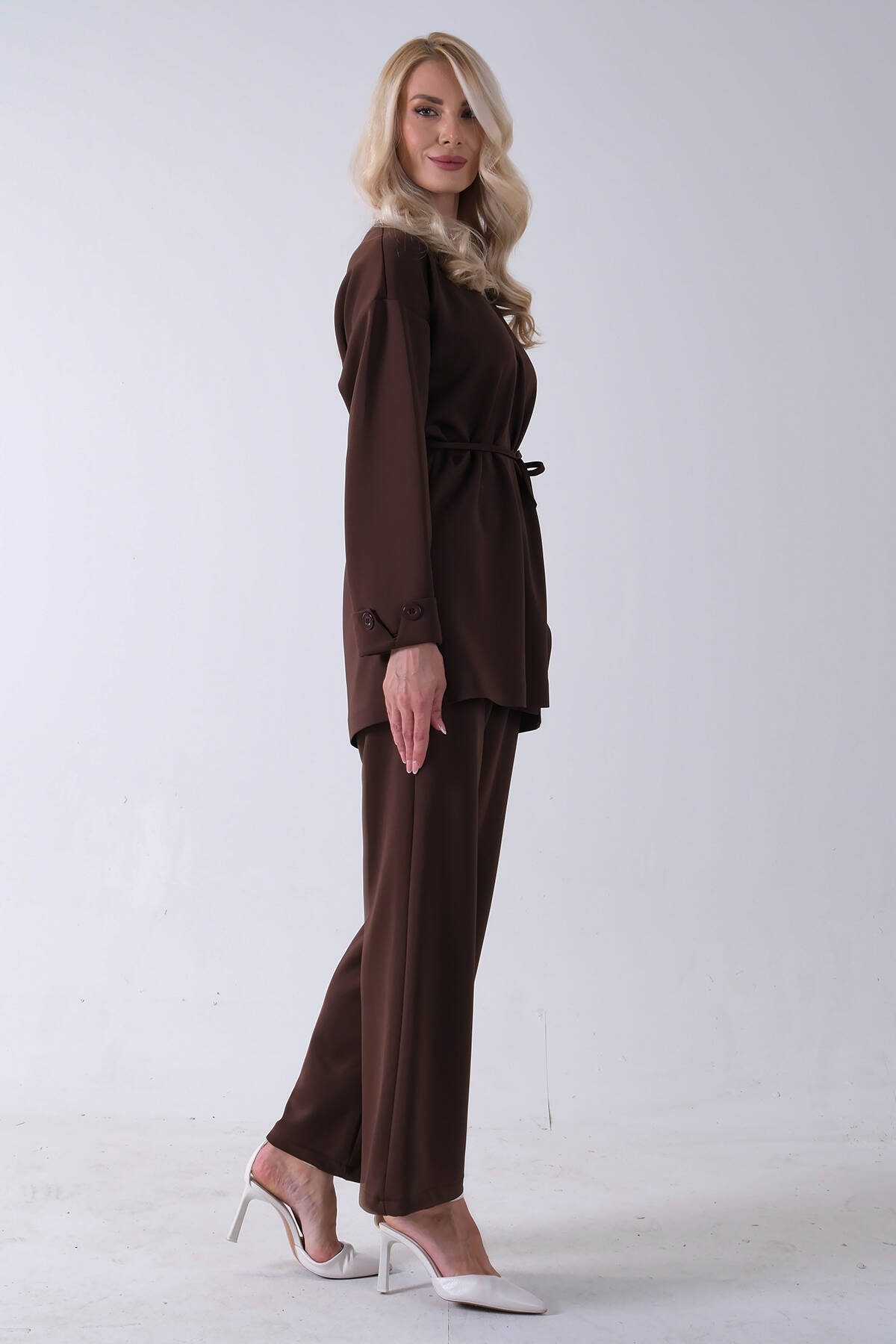 Kahve Bisiklet Yaka Önü Düğme Kapama Görünümlü Pantolonlu Scuba Takım 4592265.05