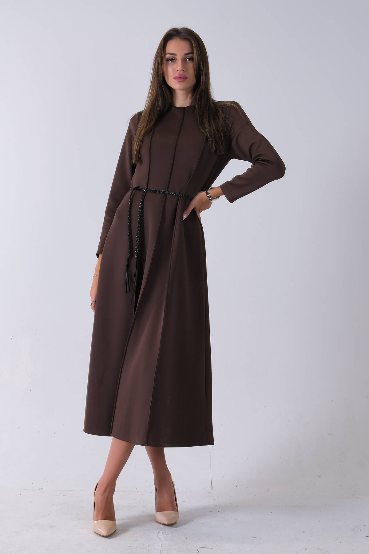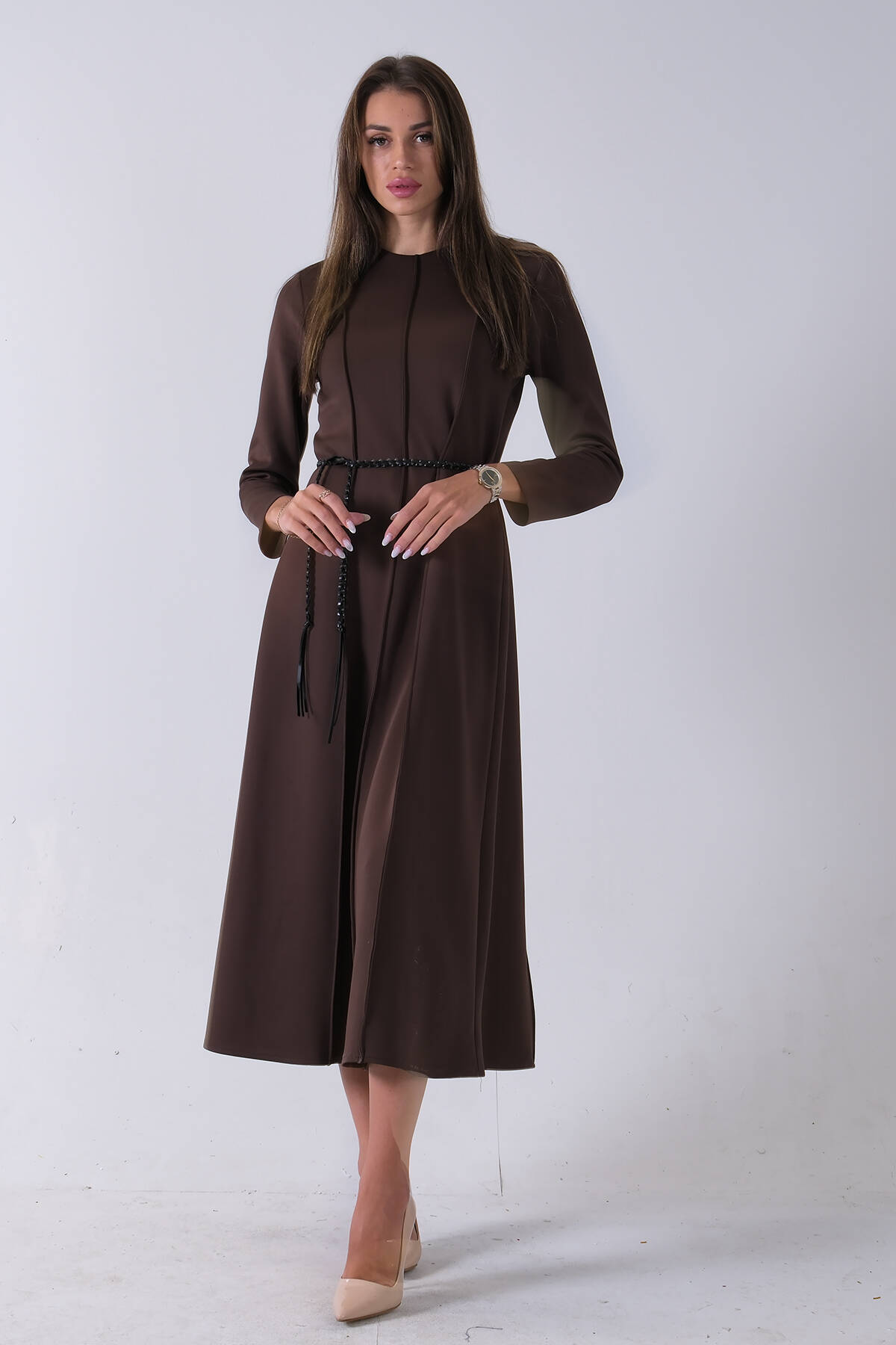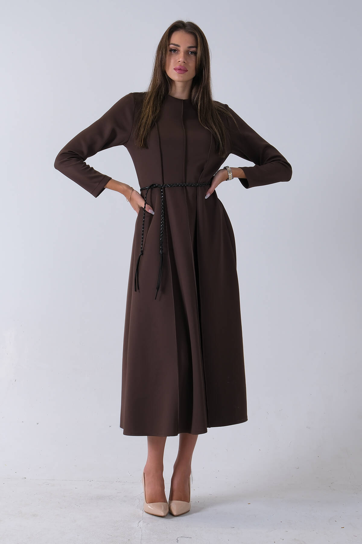 Kahve Bisiklet Yaka Önü Pile Detaylı Beli Kemerli Elbise 4593453.05