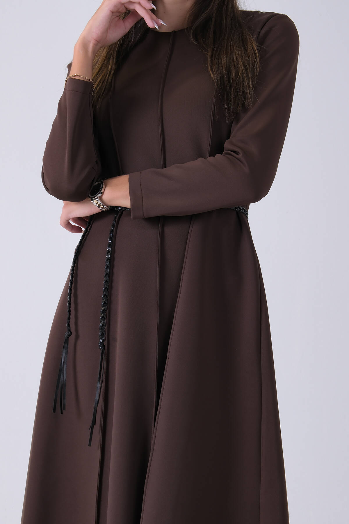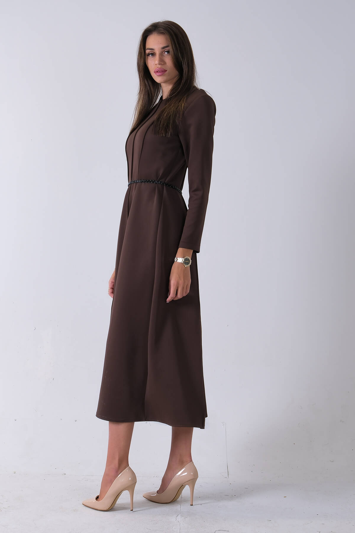 Kahve Boydan Düğme Kapamalı Bileği Lastikli Beli Kemerli Elbise 4593459.05