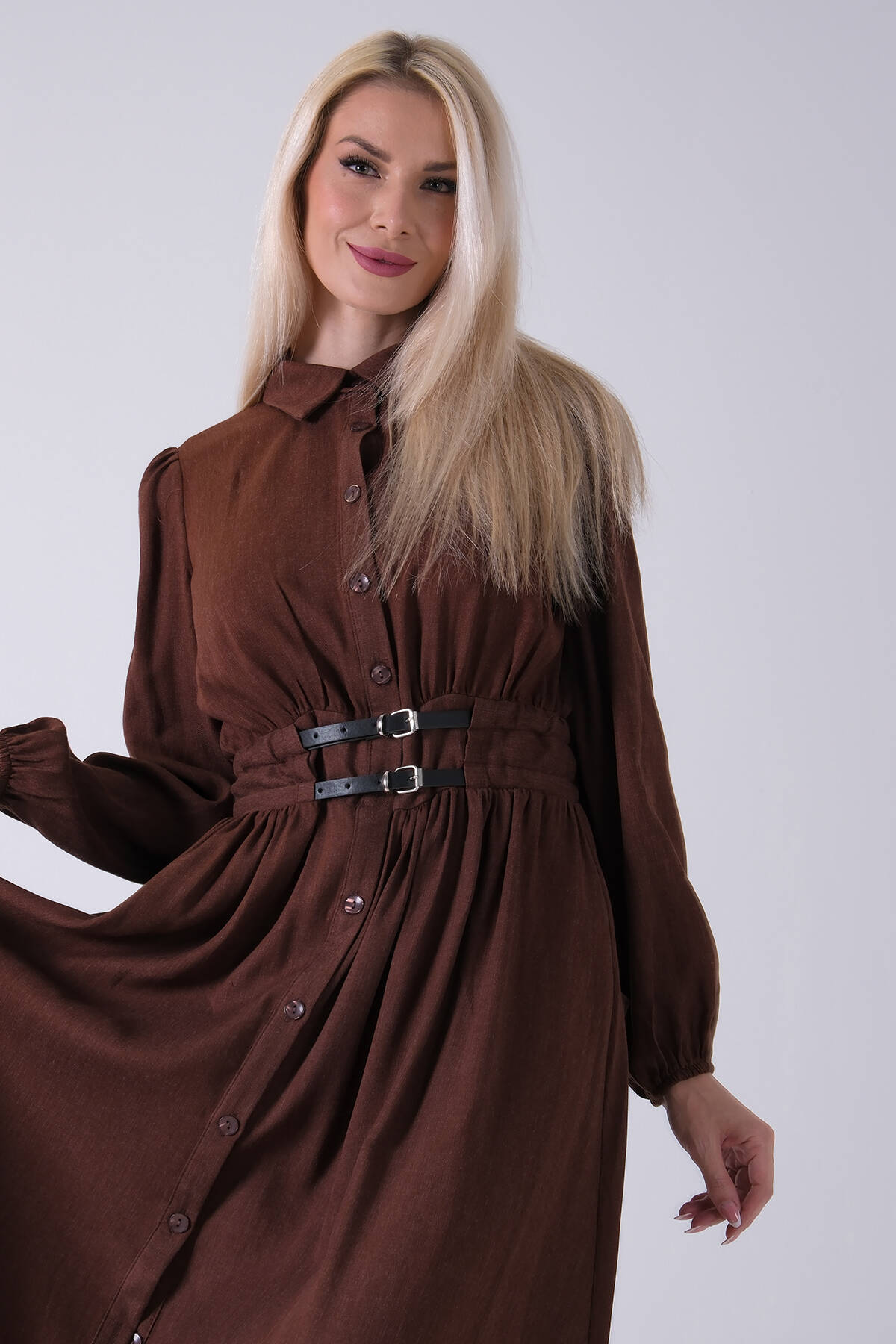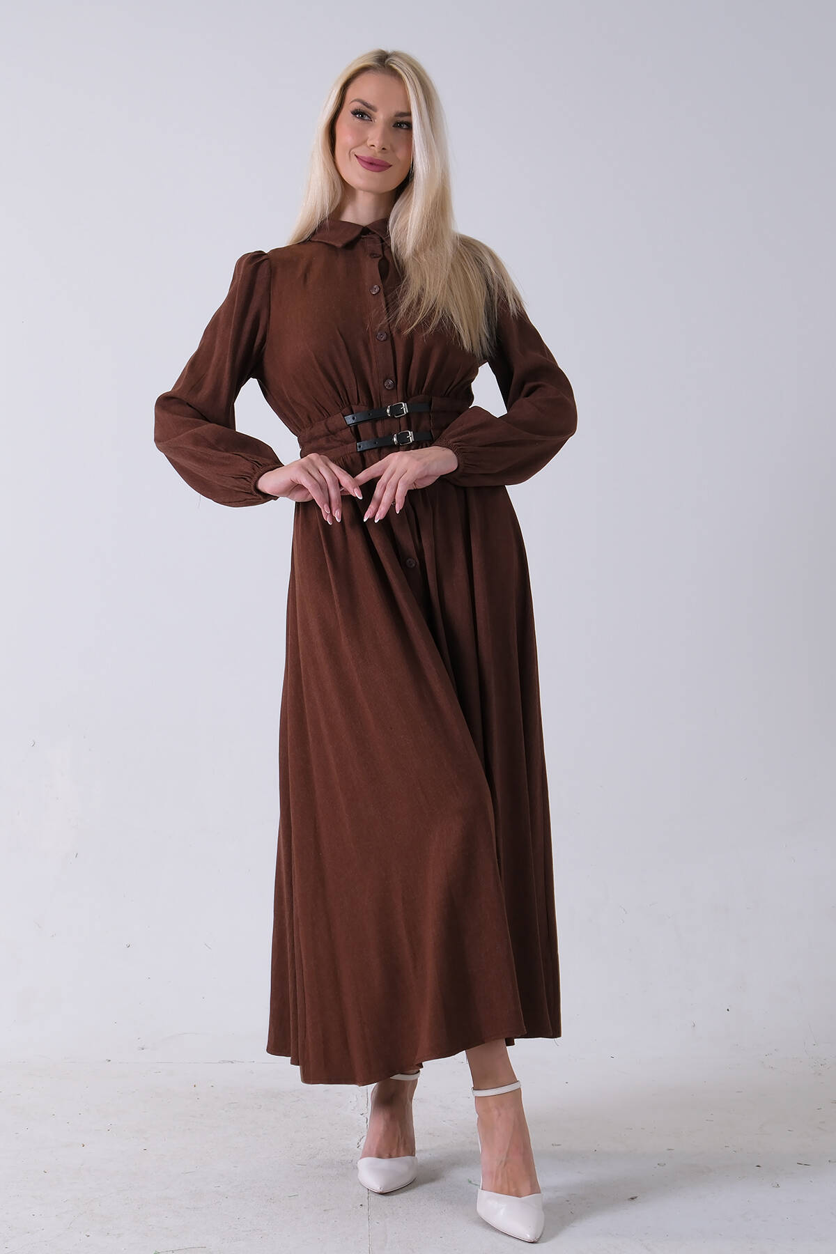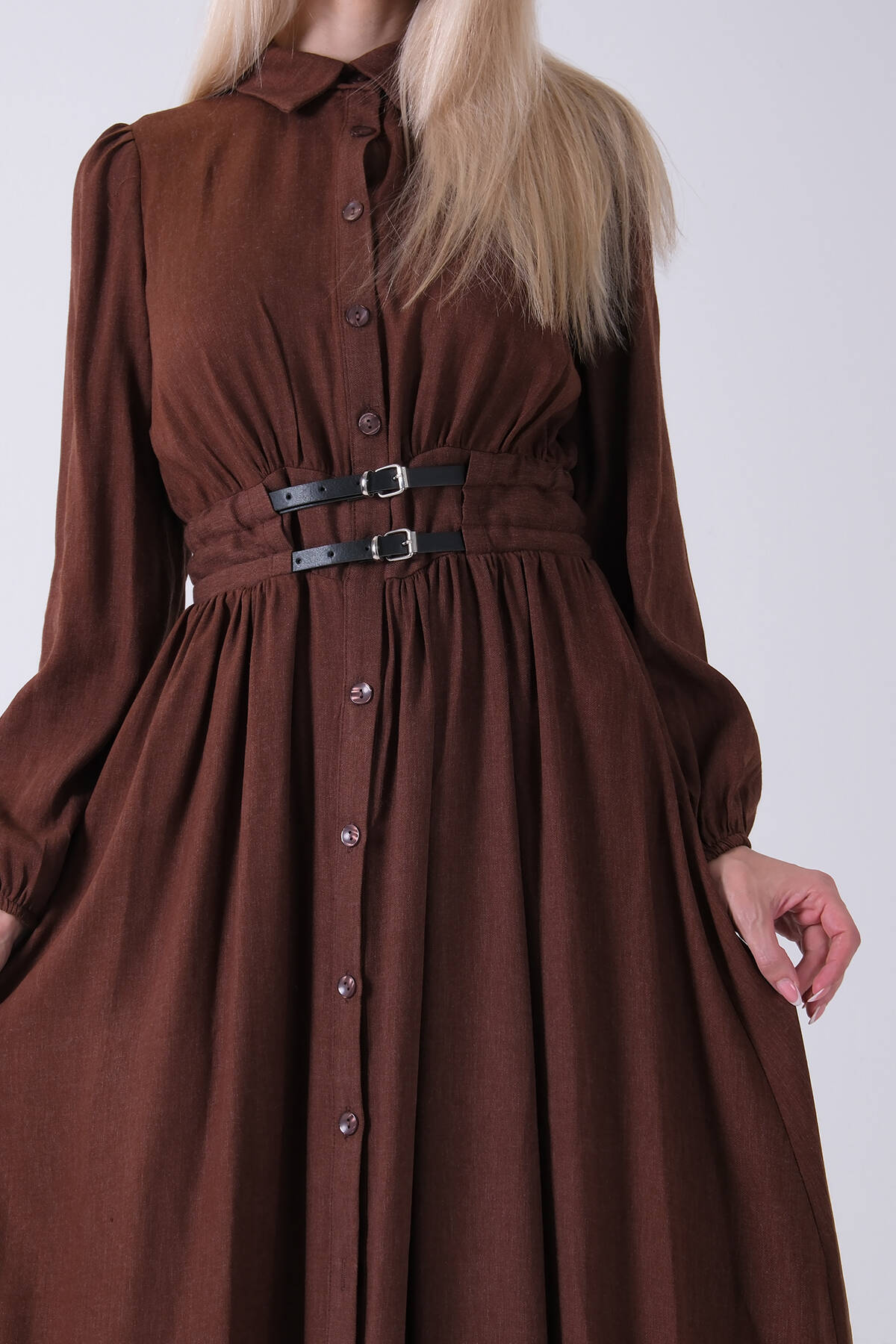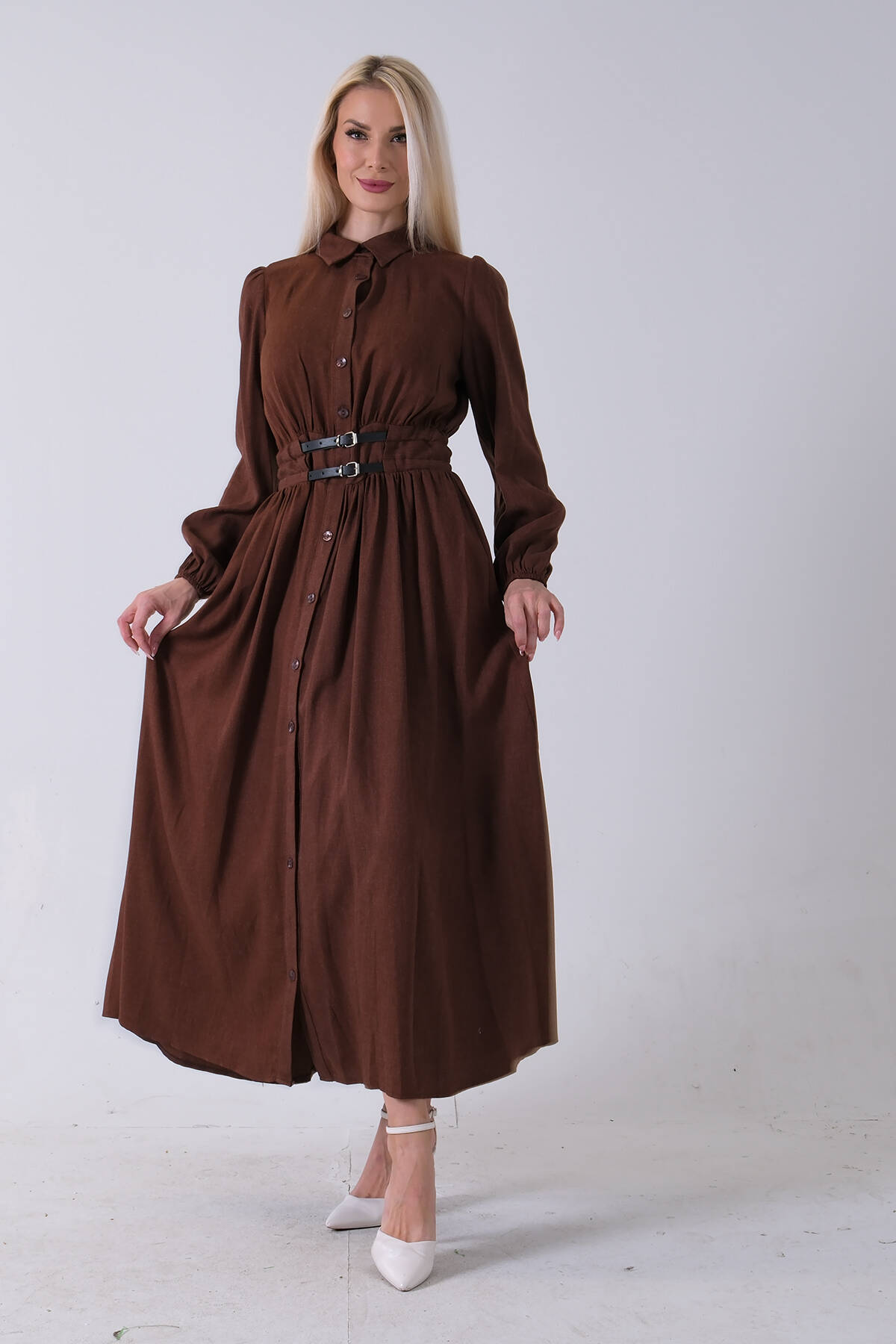 Kahve Boydan Düğme Kapamalı Bileği Lastikli Beli Kemerli Elbise 4593459.05