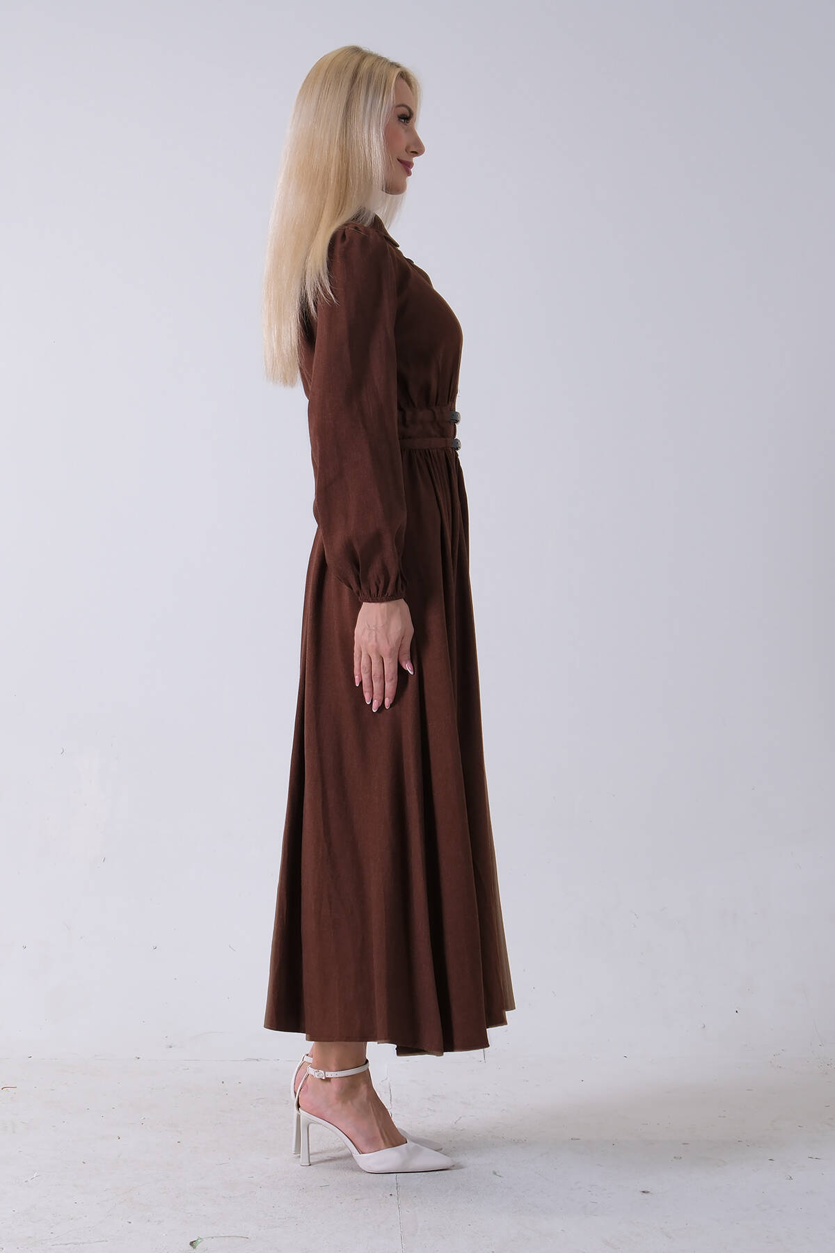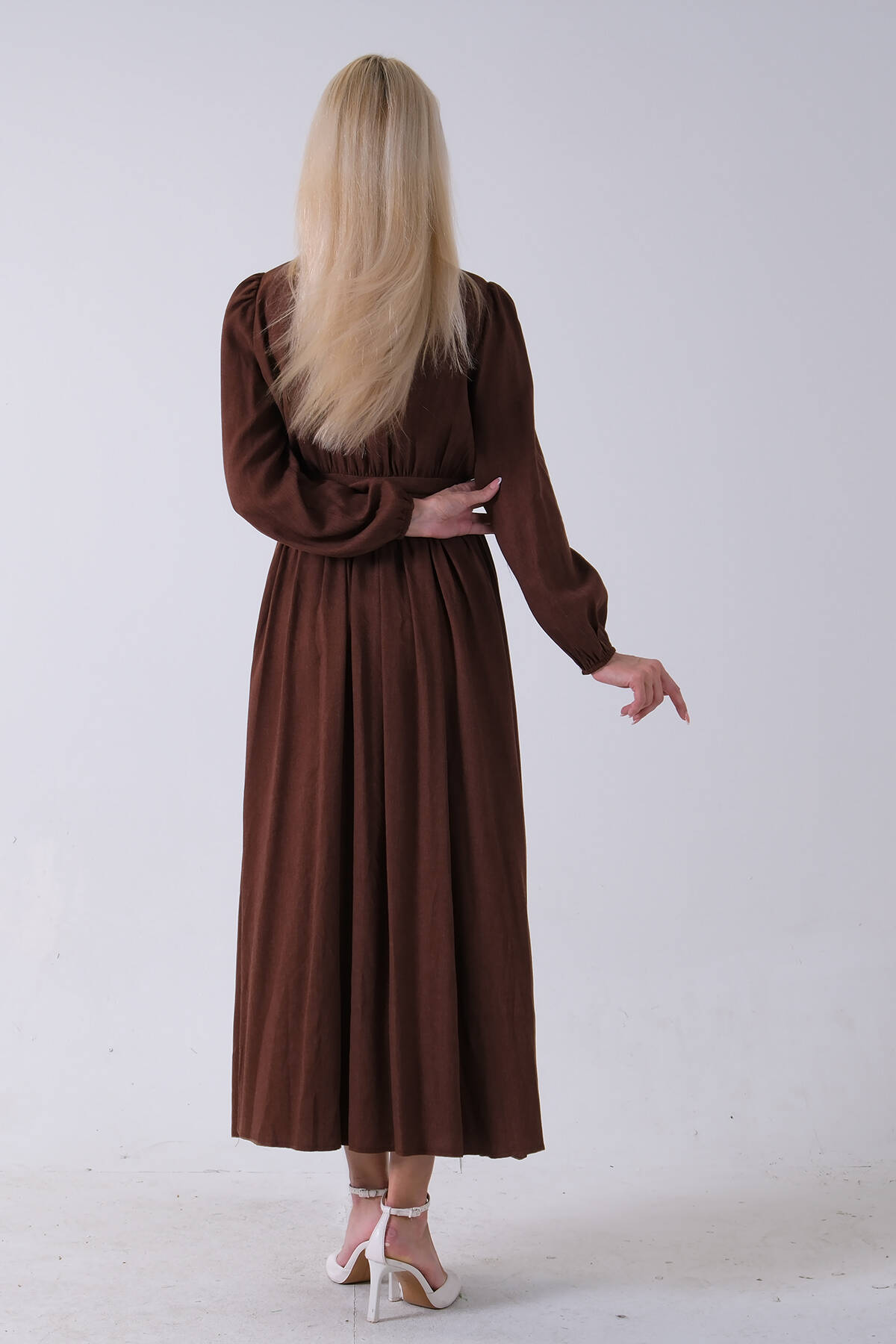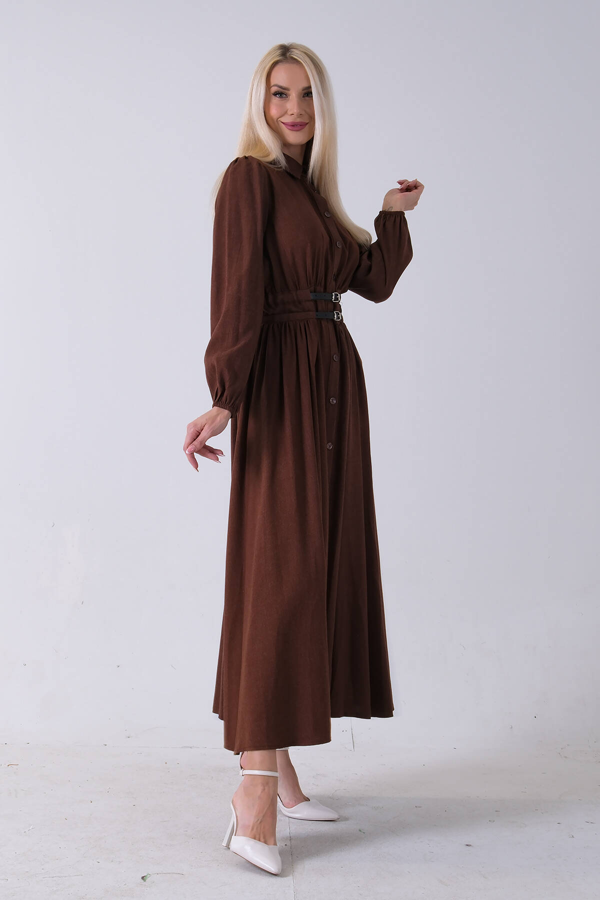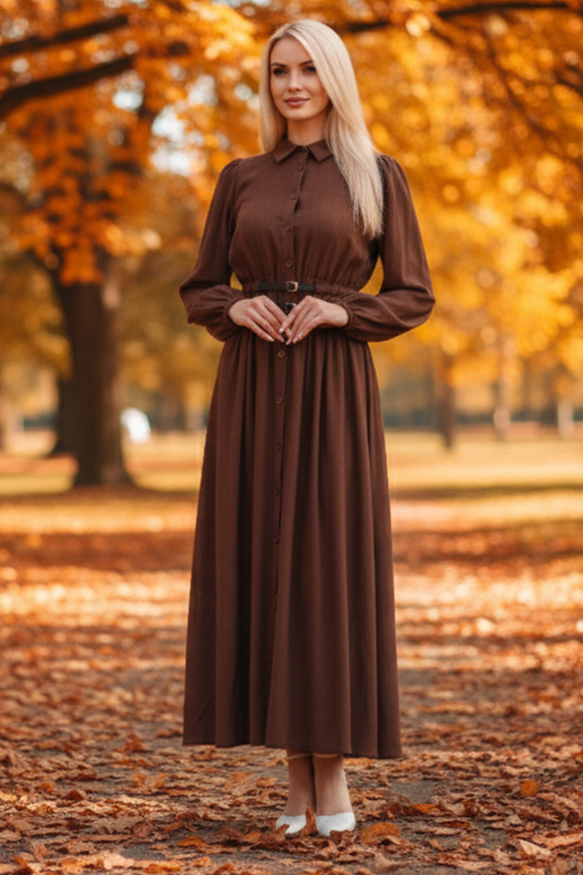 Kahve Boydan Düğme Kapamalı Bileği Lastikli Beli Kemerli Elbise 4593459.05
