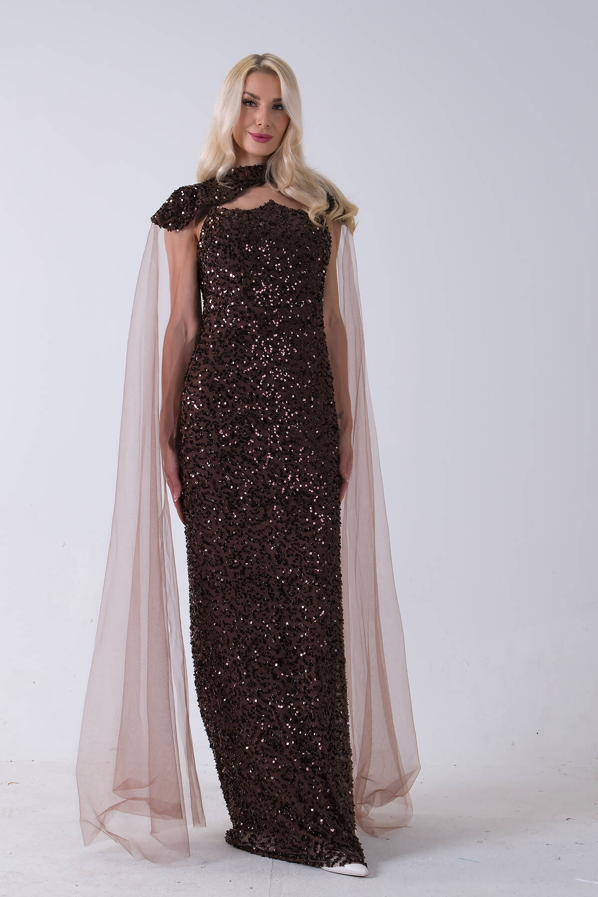 Kahve Boyundan Takma Tül Detaylı Straplez Pul Payet Abiye 9705683.05