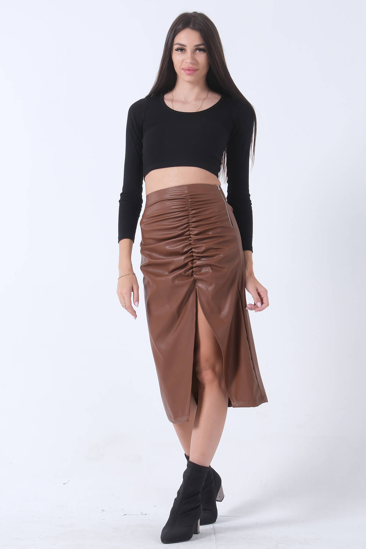 Kahve Büzgülü Deri Etek 0101064.05