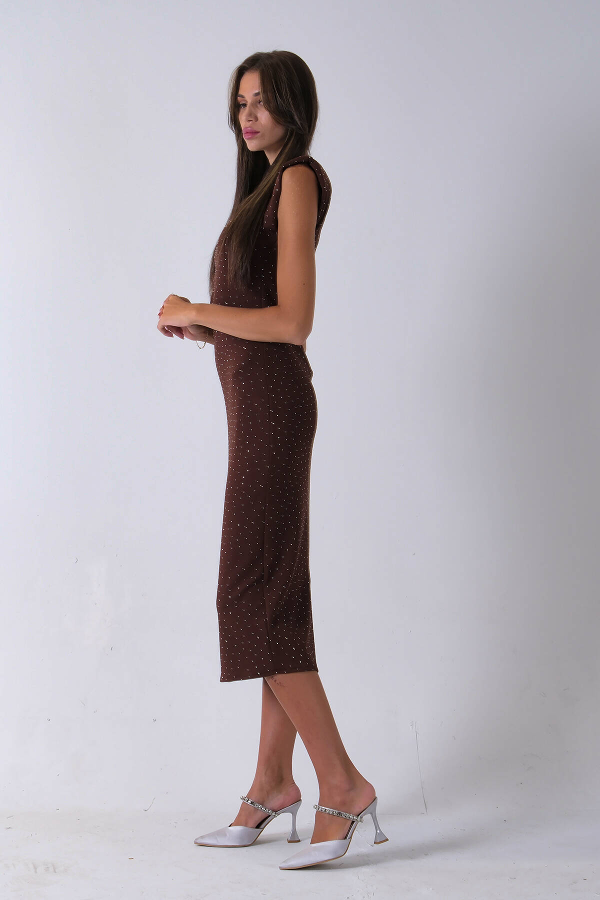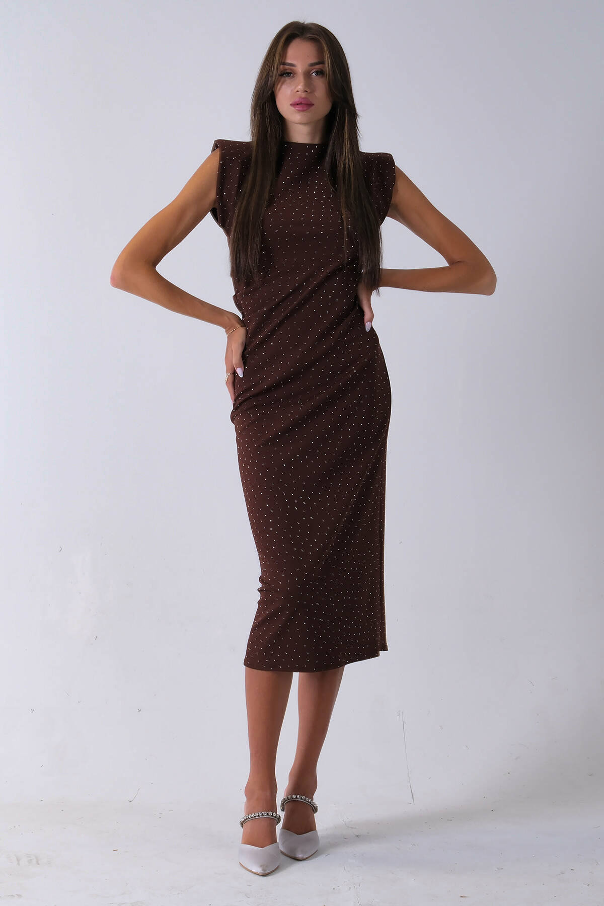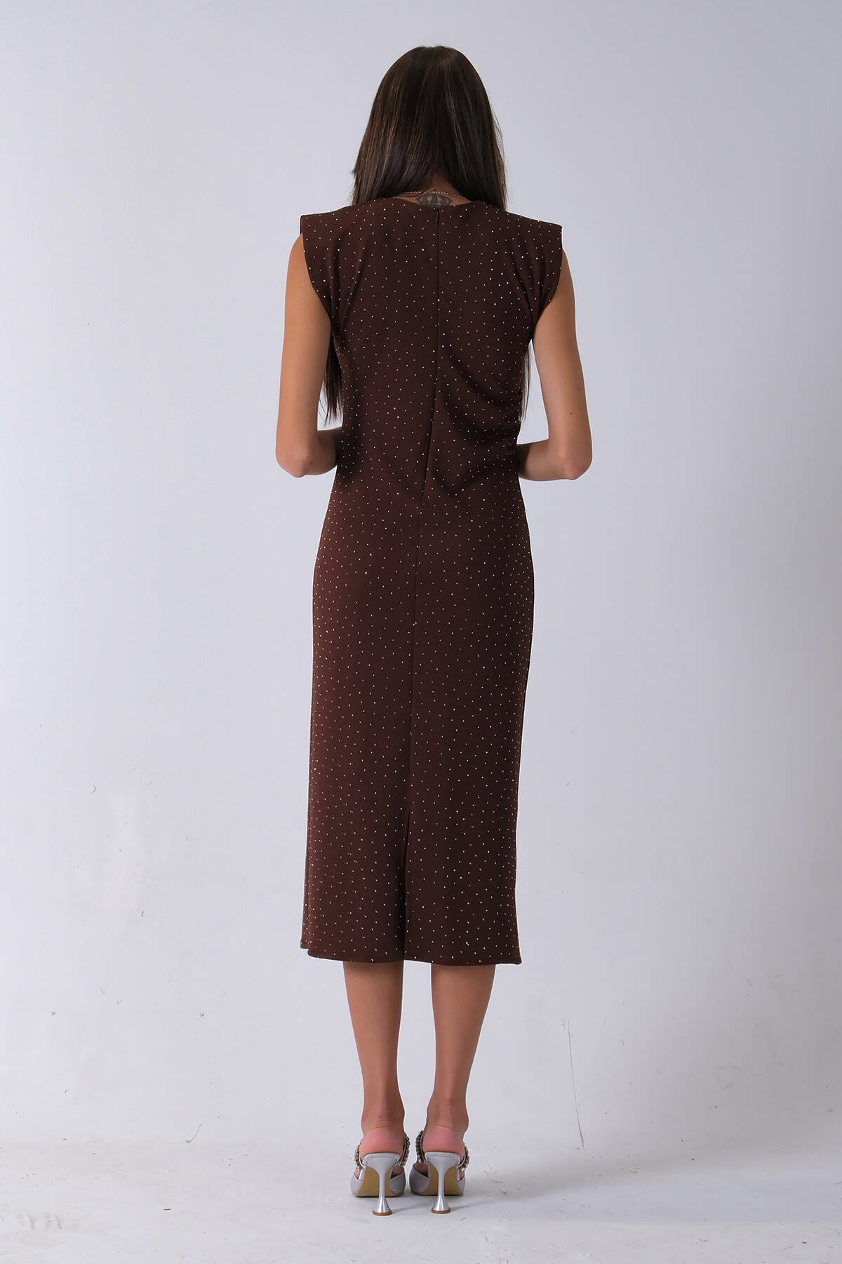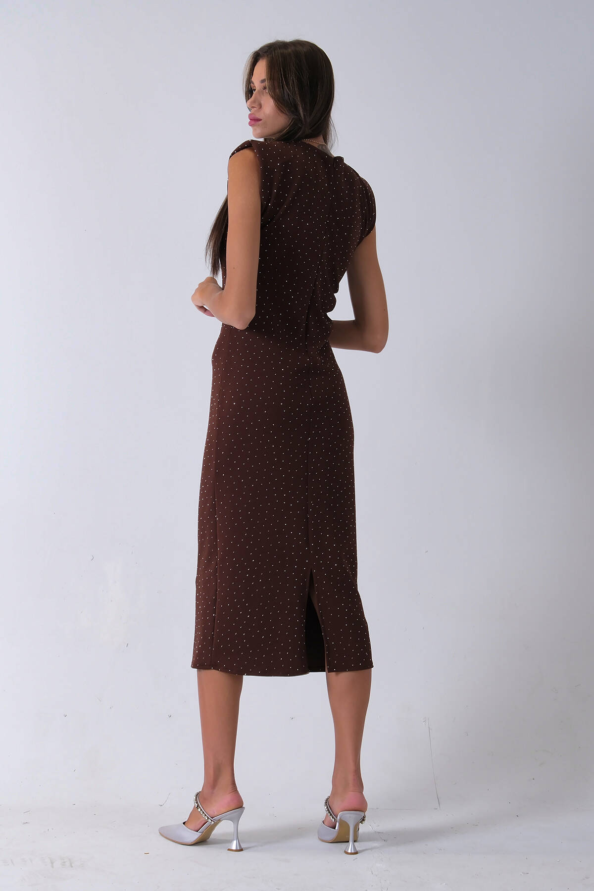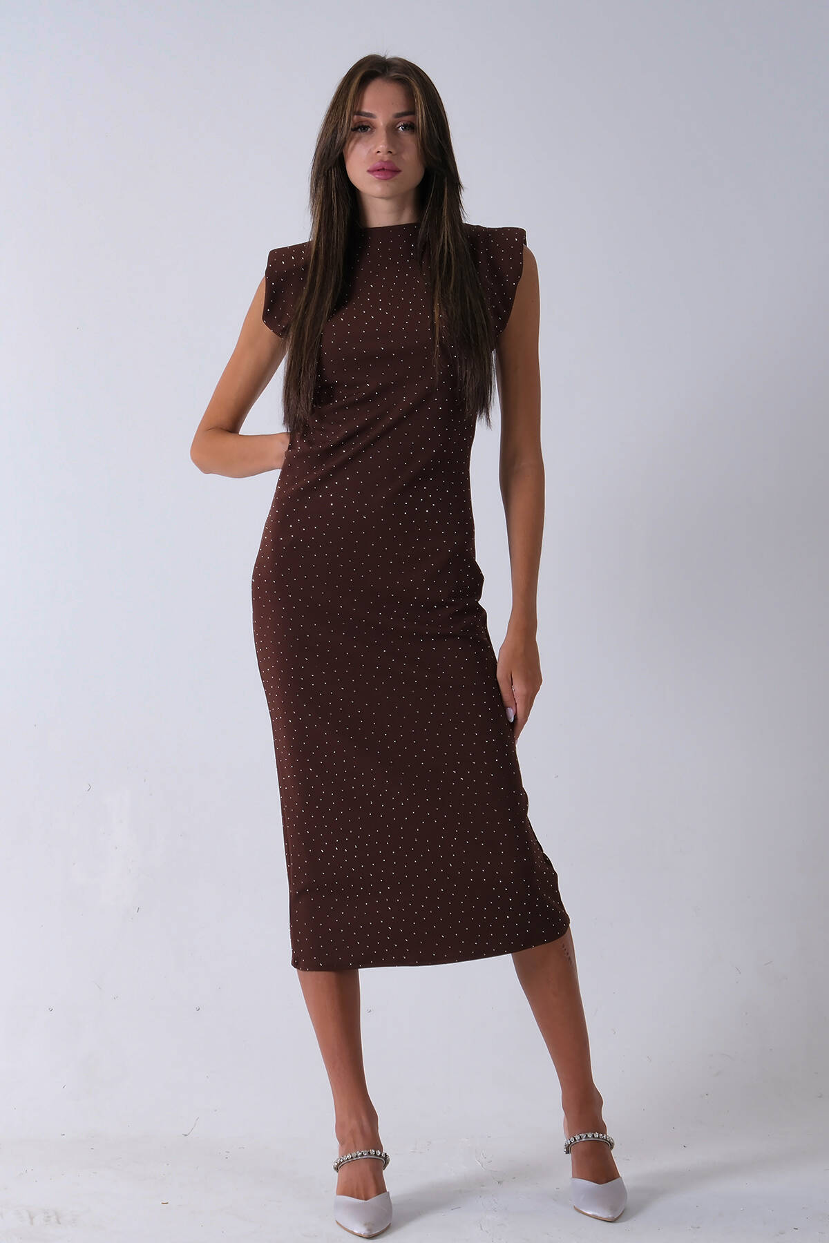 Kahve Büzgülü Üzeri Taş Detaylı Elbise 03050336.05