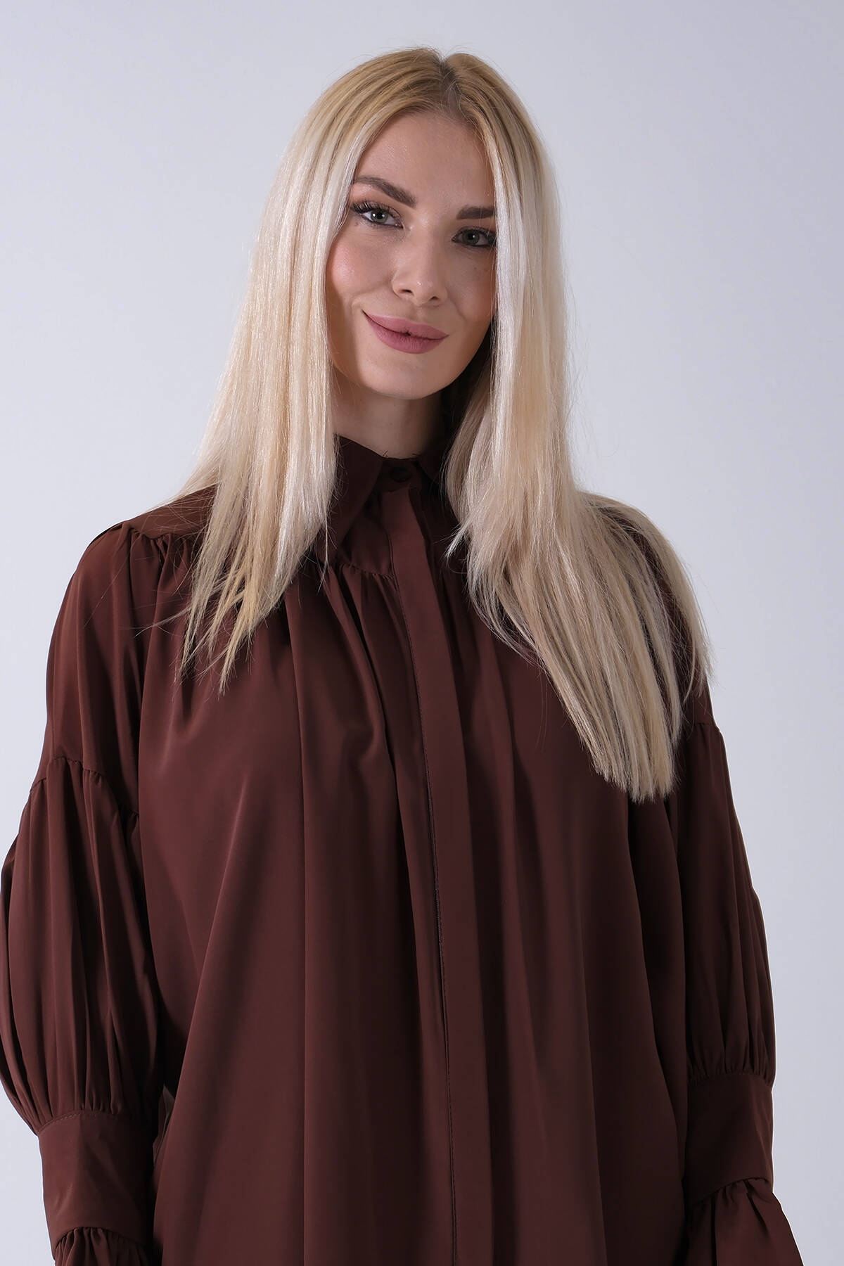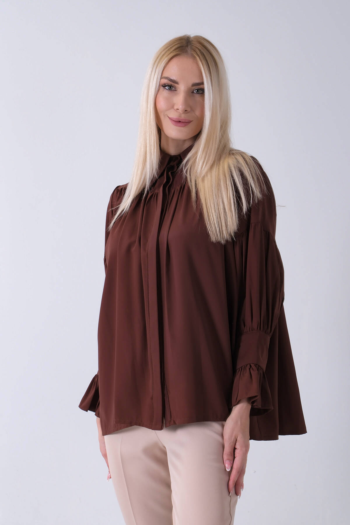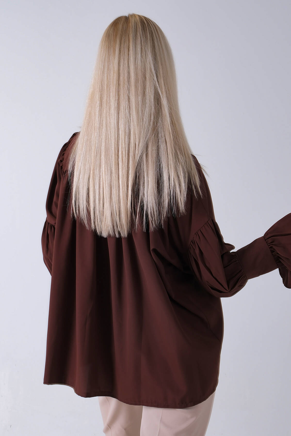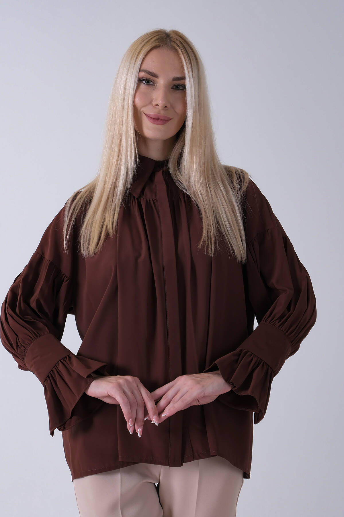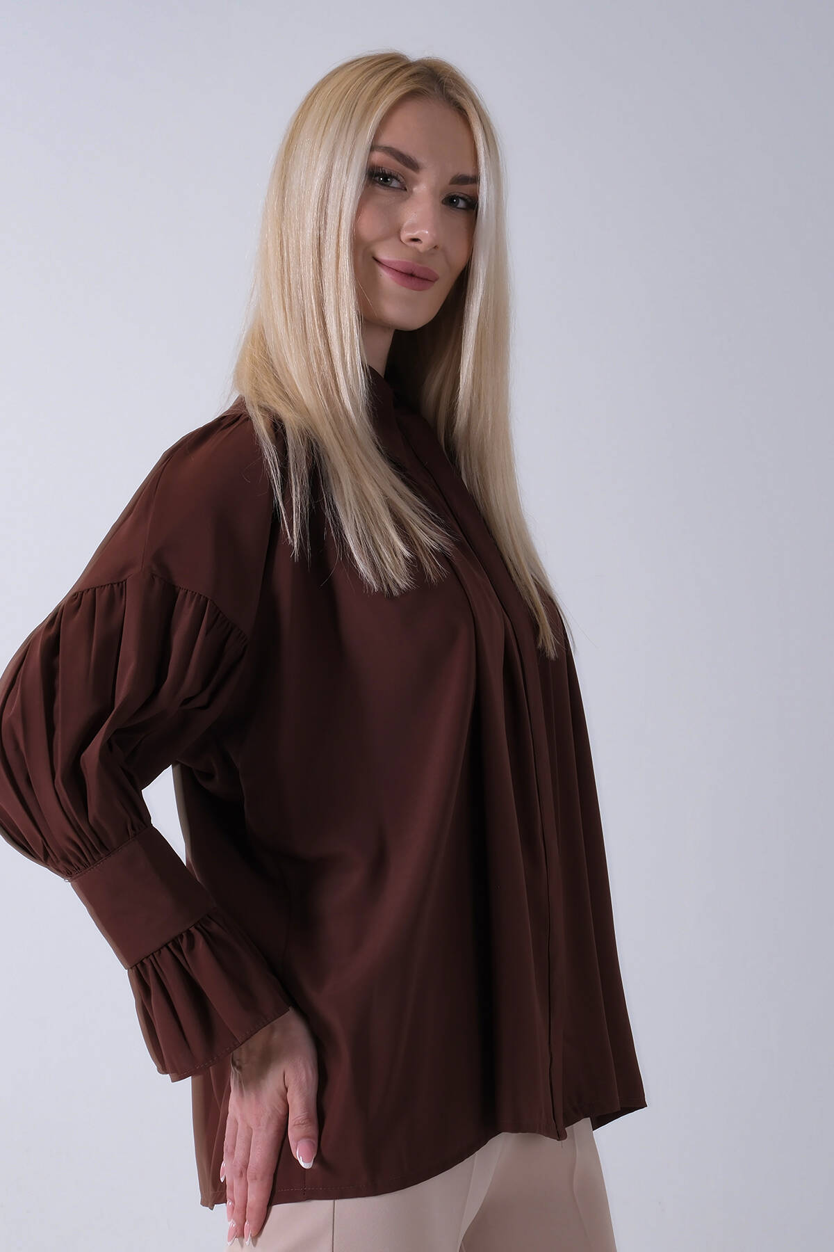 Kahve Göğüs ve Manşeti Büzgü Detaylı Bluz 3972060.05