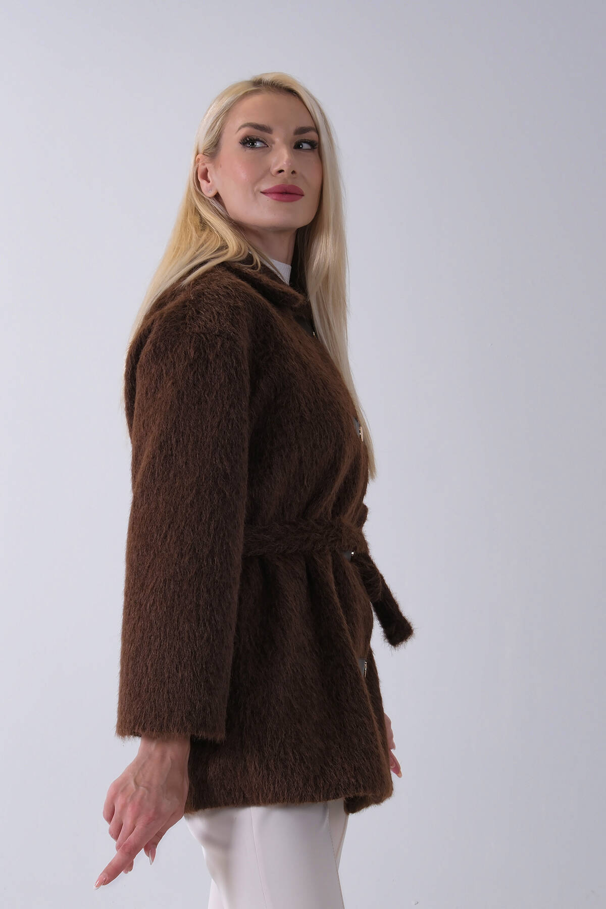 Koyu Kahve Yakası Kürk Detaylı Kemerli Fermuar Kapamalı Kaşe Ceket 5307098.486