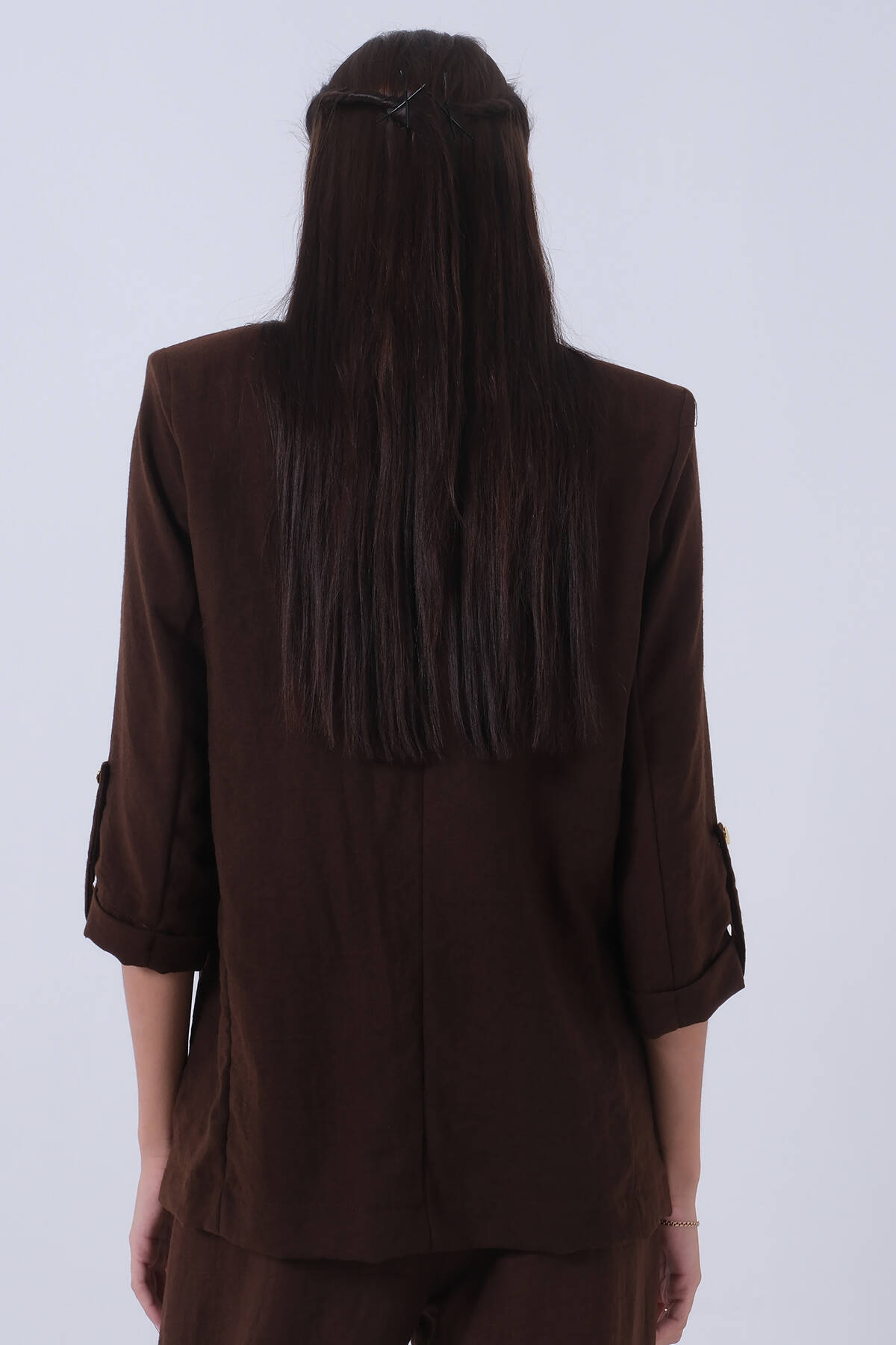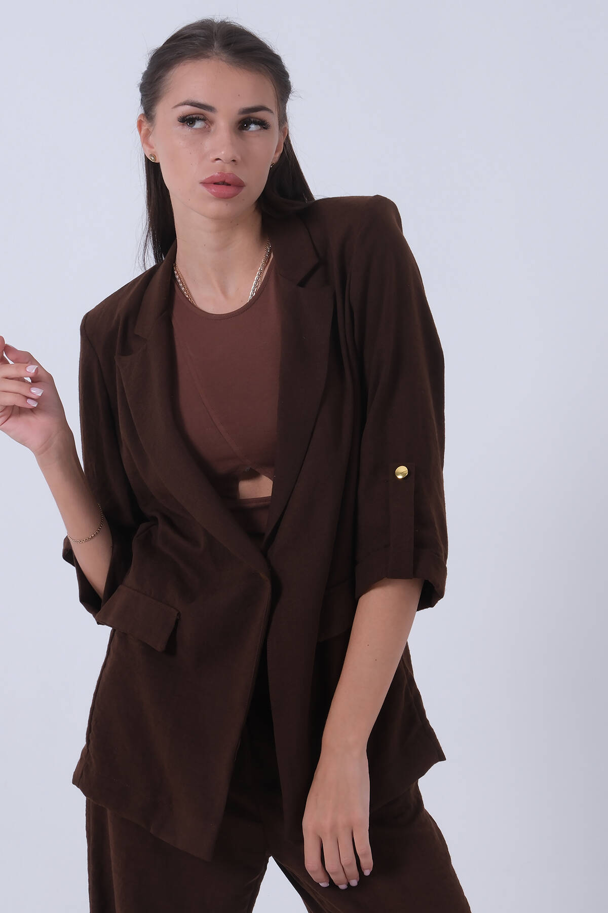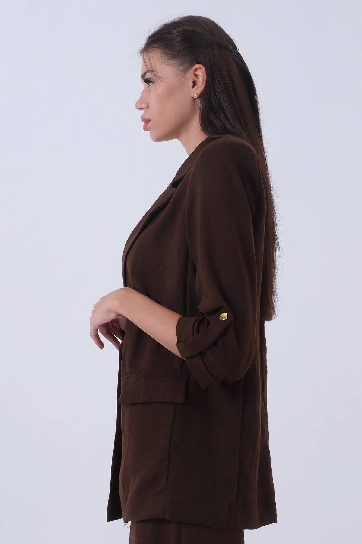 Kahve Kolları Düğme Toparlamalı Keten Ceket 01051361.05