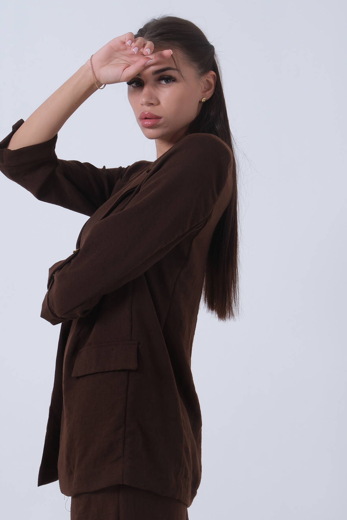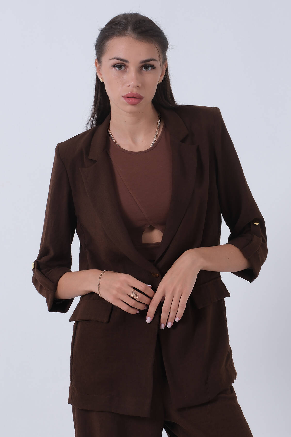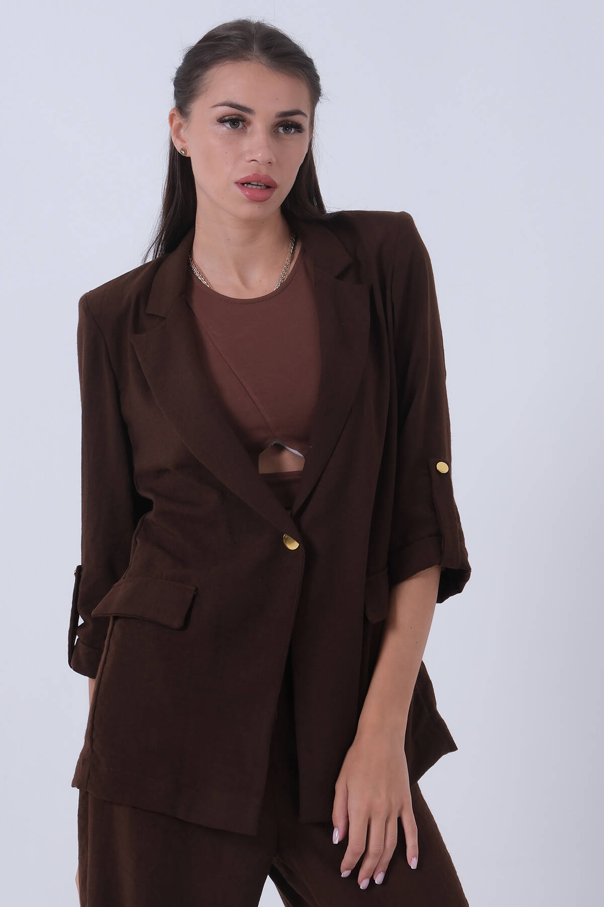 Kahve Kolları Düğme Toparlamalı Keten Ceket 01051361.05