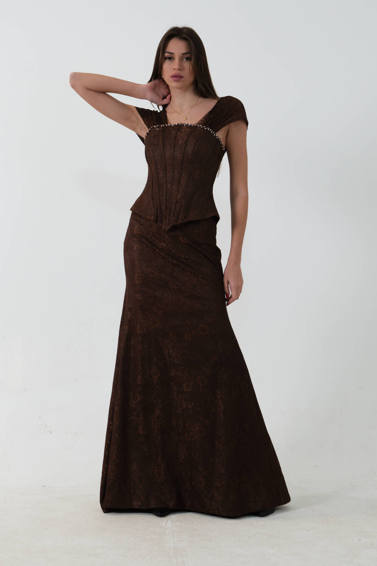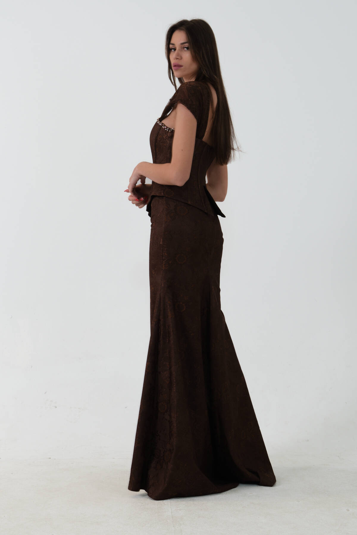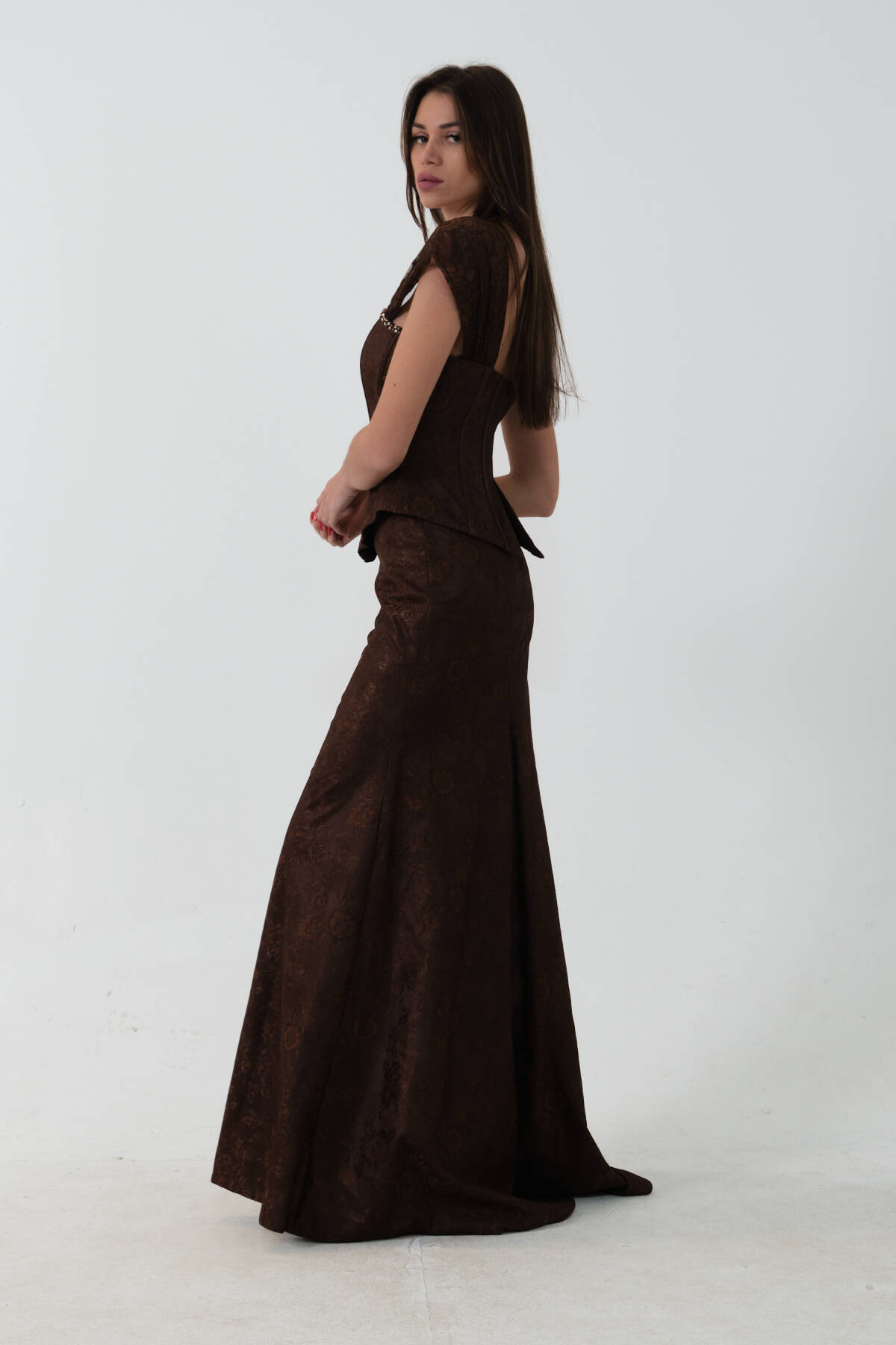 Kahve Korse Detaylı Dantel Kapamalı Düşük Omuz Abiye 9705791.05