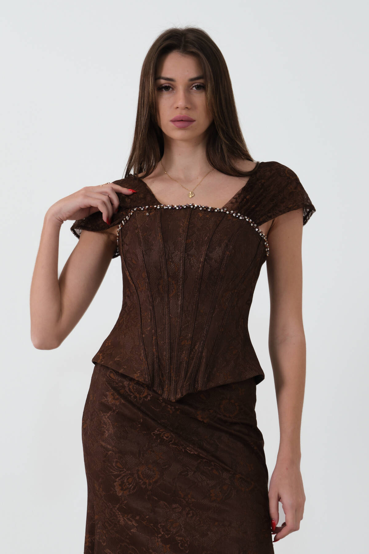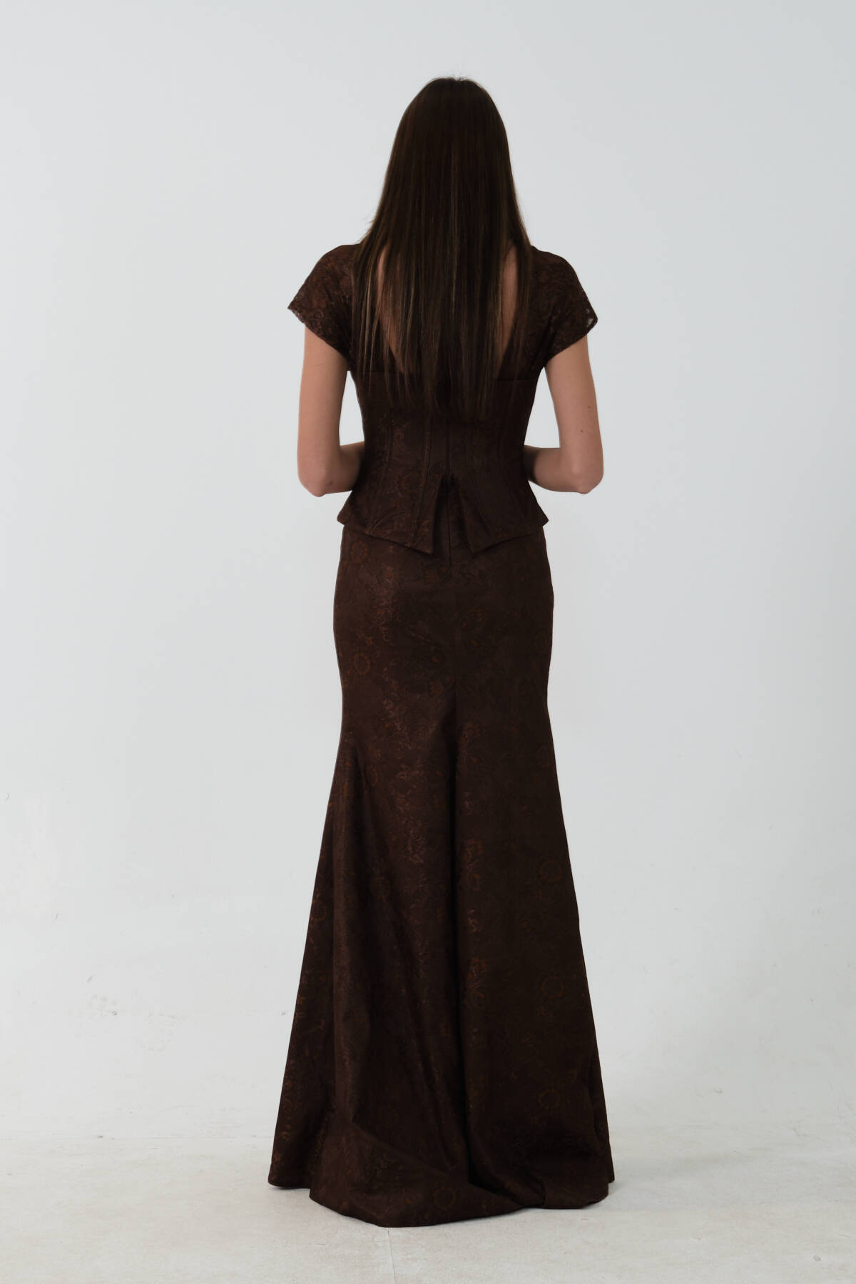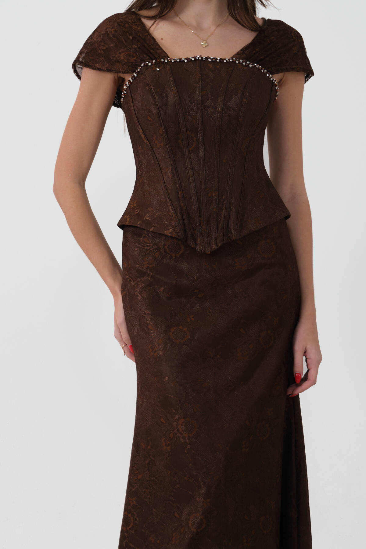 Kahve Korse Detaylı Dantel Kapamalı Düşük Omuz Abiye 9705791.05