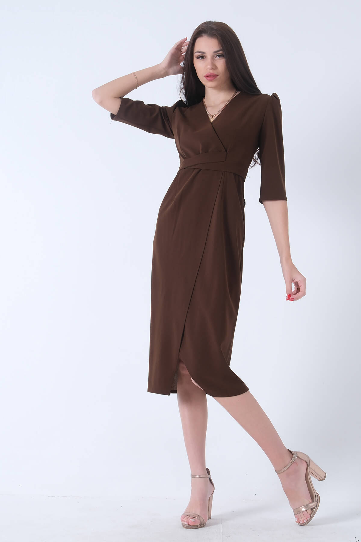 Truvakar Kol Kruvaze Yaka Kendinden Kemerli Yırtmaçlı Krep Kumaş Midi Boy Abiye