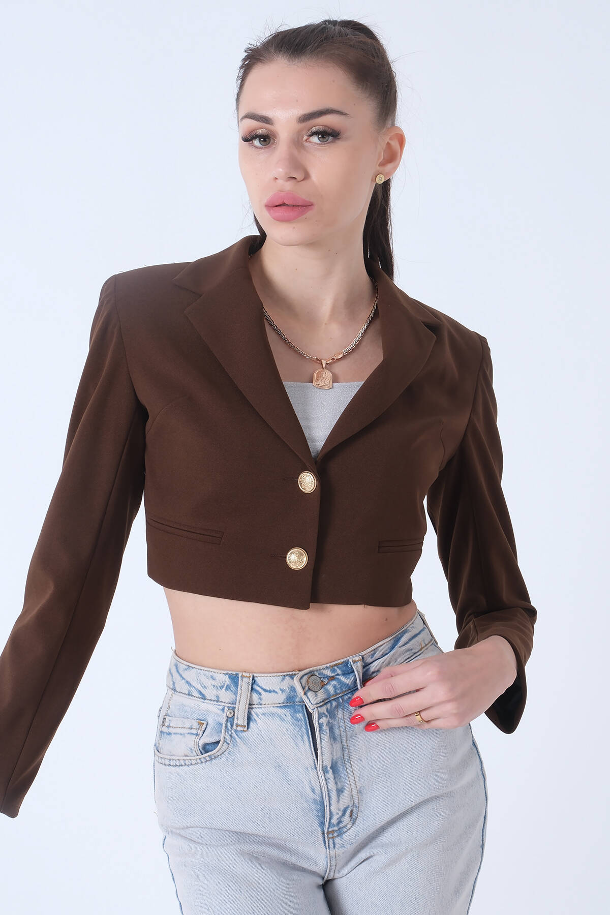 Uzun Kol Metal Düğmeli Cep Görünümlü Astarlı Krop Ceket