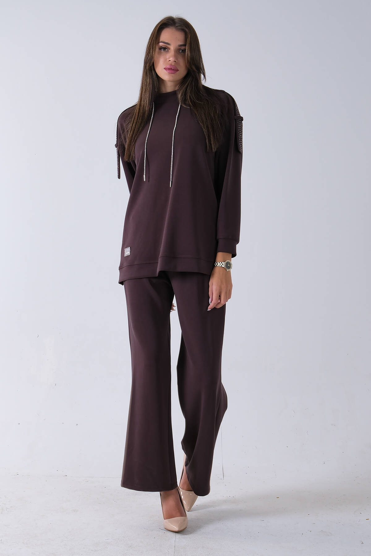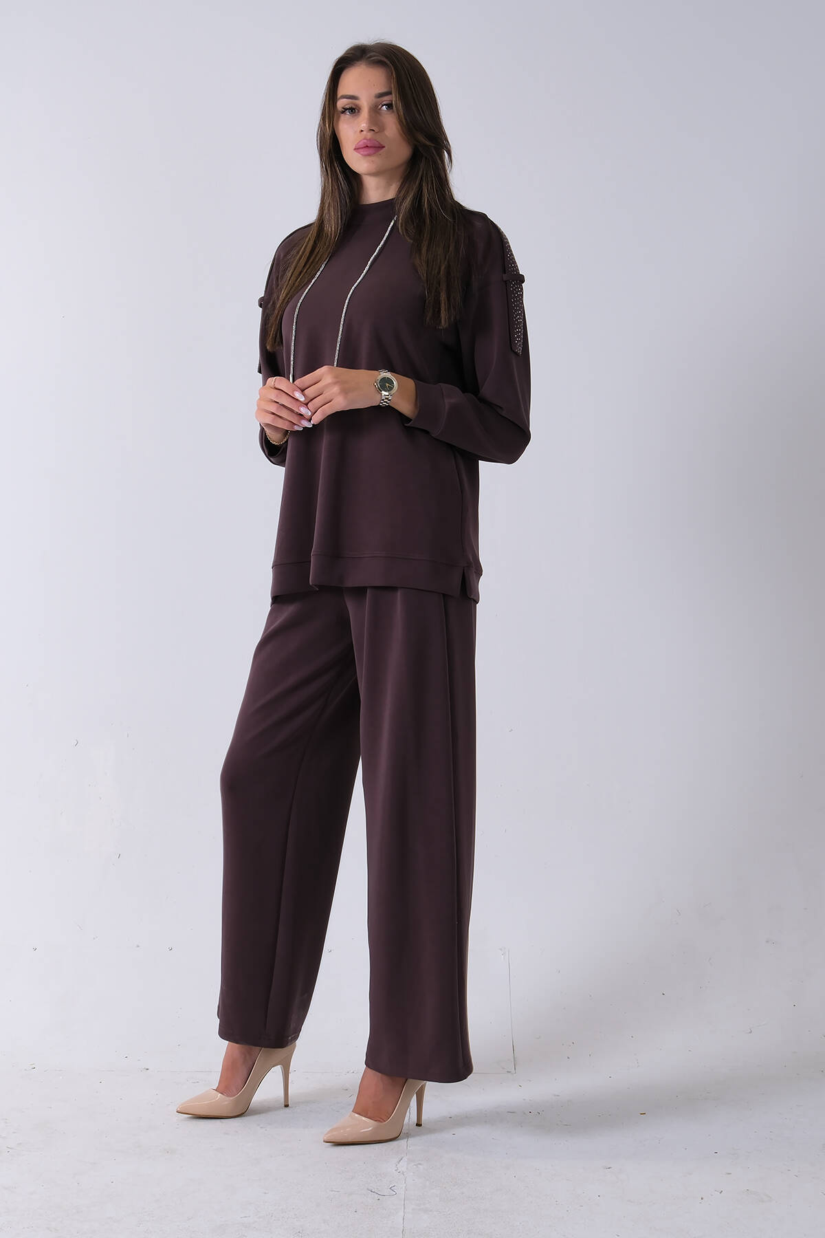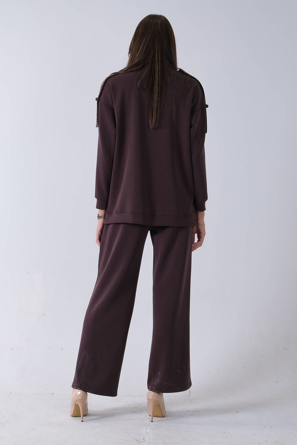 Kahve Omuz Apolet Detaylı Yakası İpli Tunik Pantolonlu Takım 4577281.05