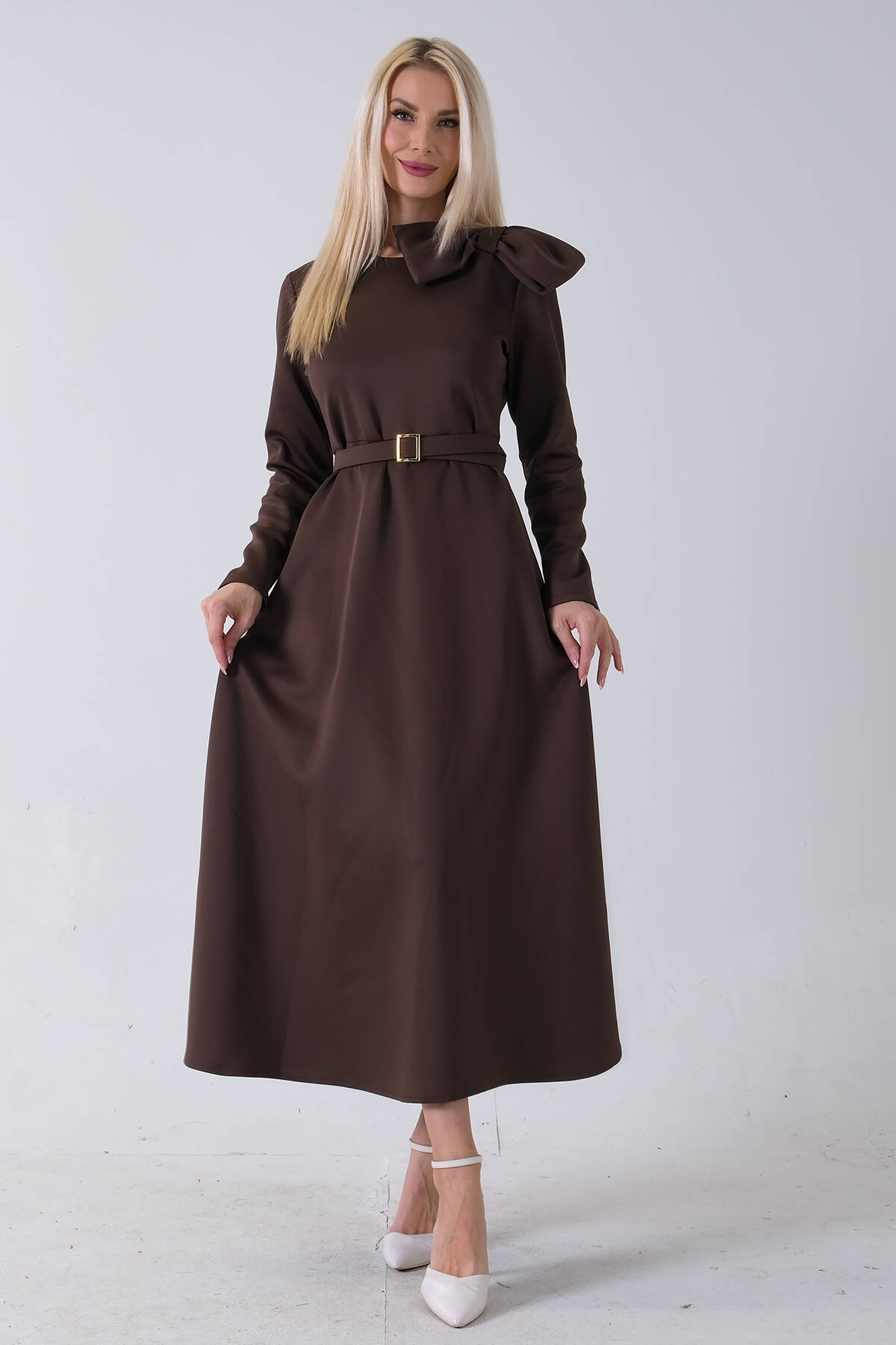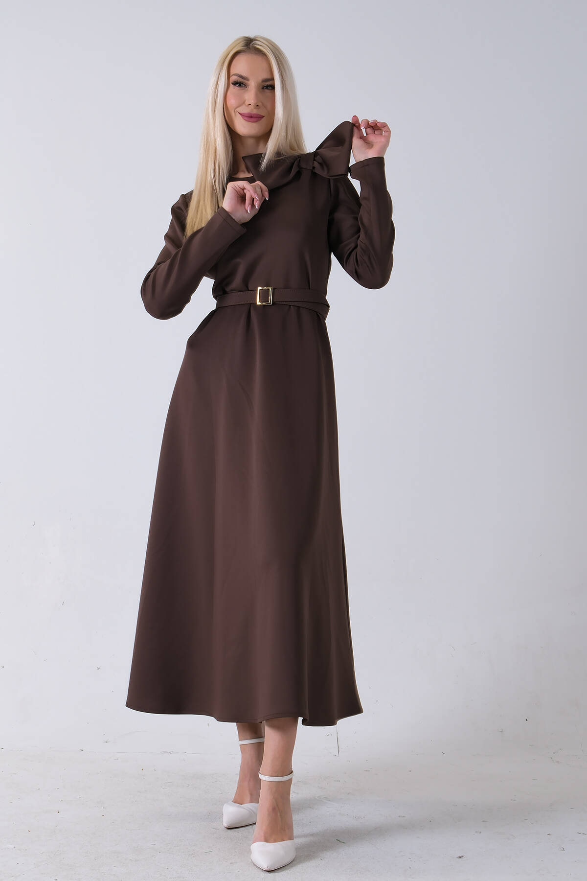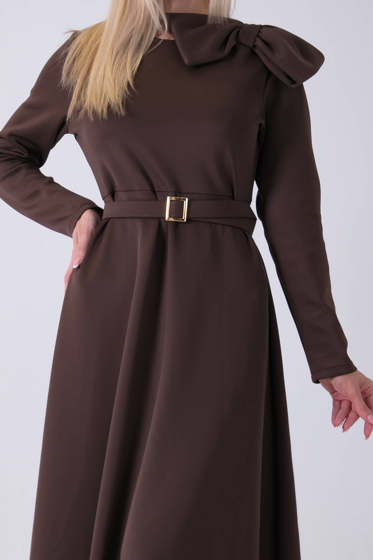 Kahve Omuz Fiyonk Detaylı Kemerli Bisiklet Yaka Scuba Tesettür Elbise 4593456.05