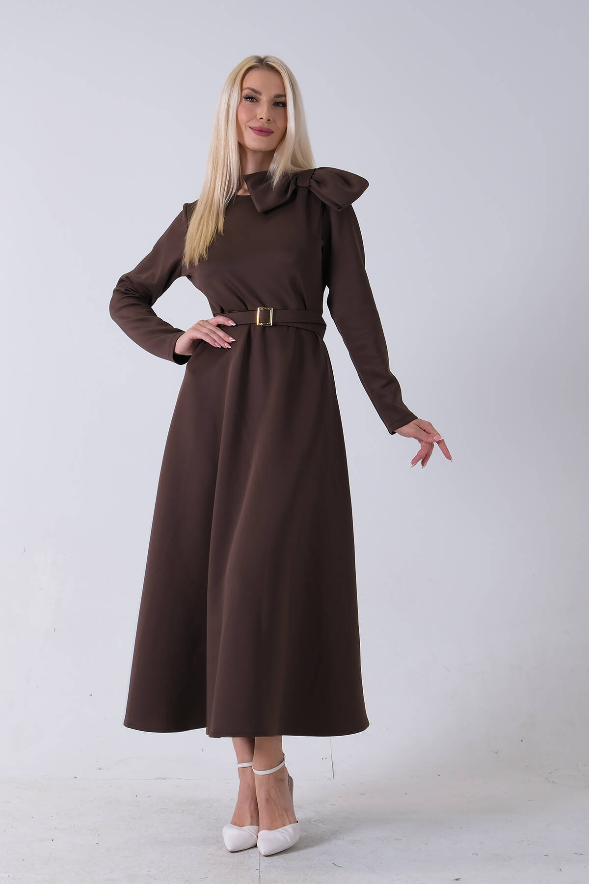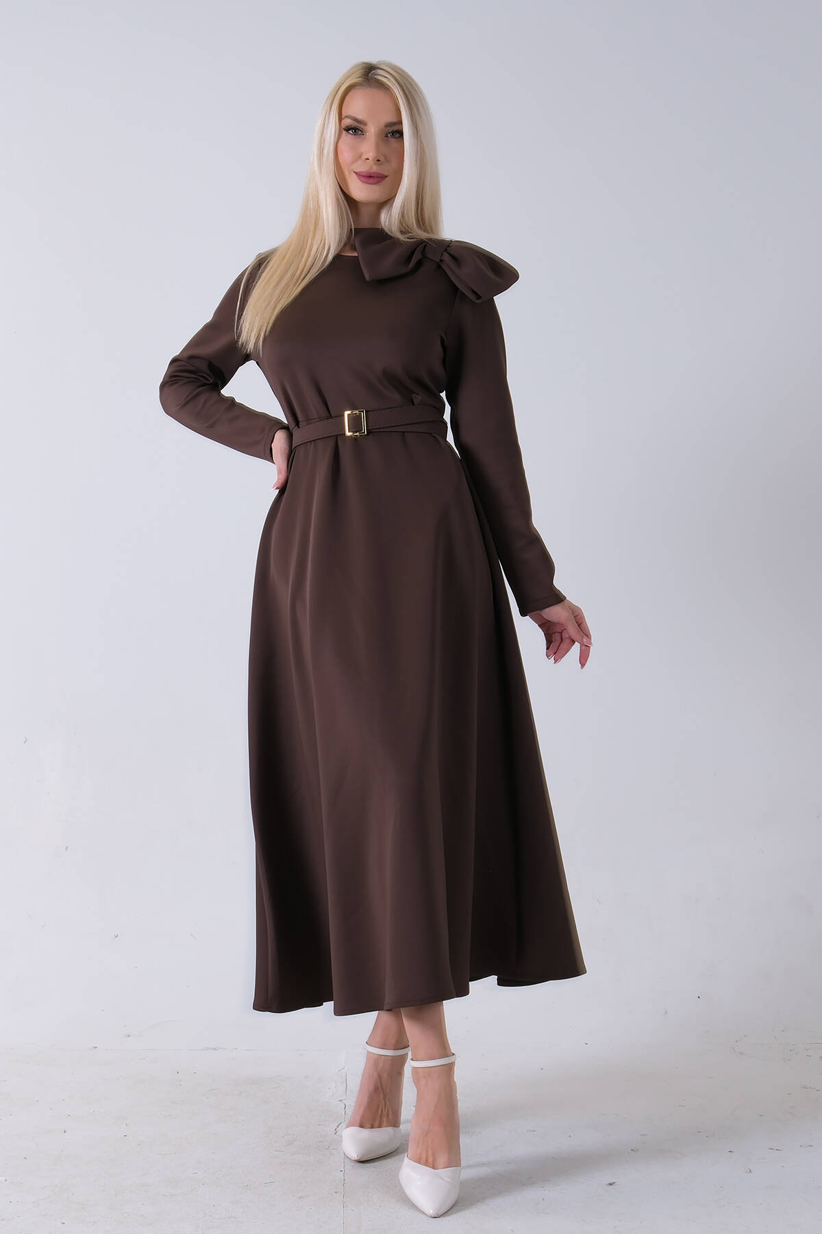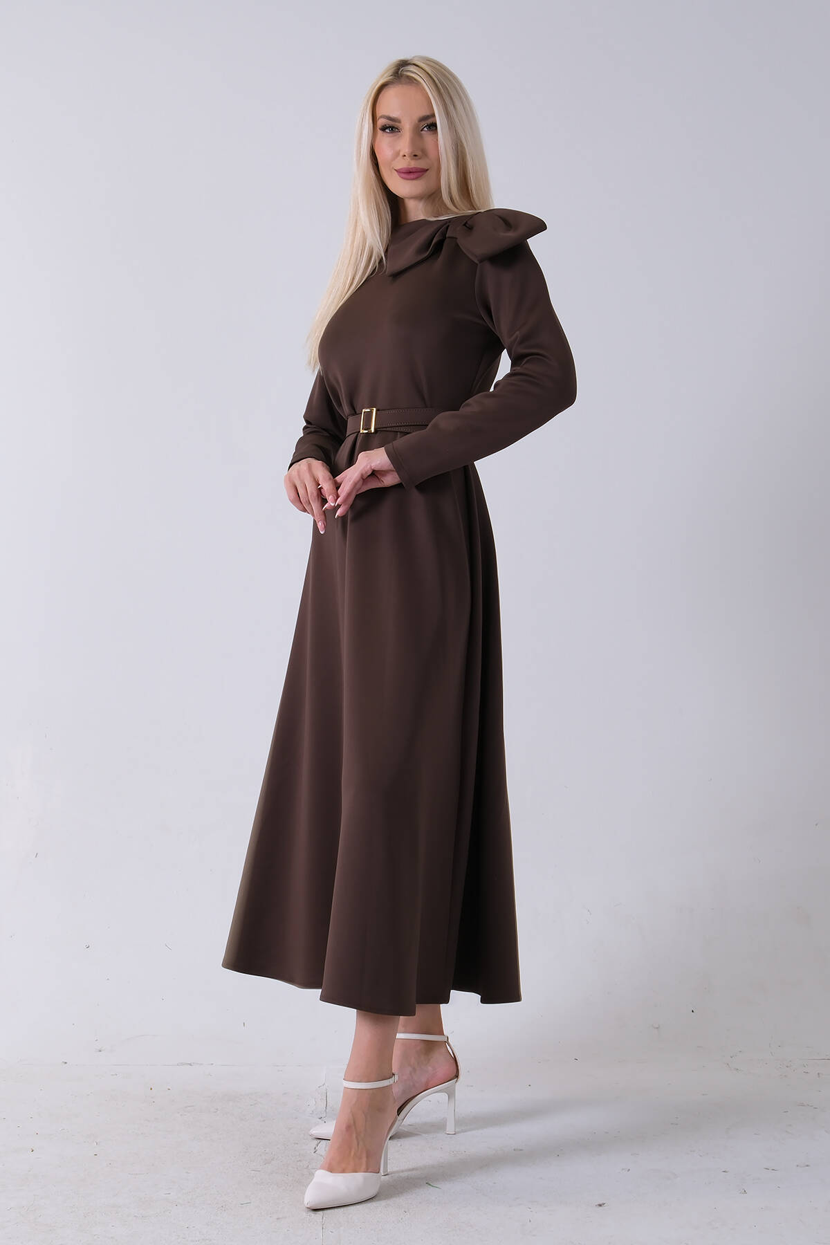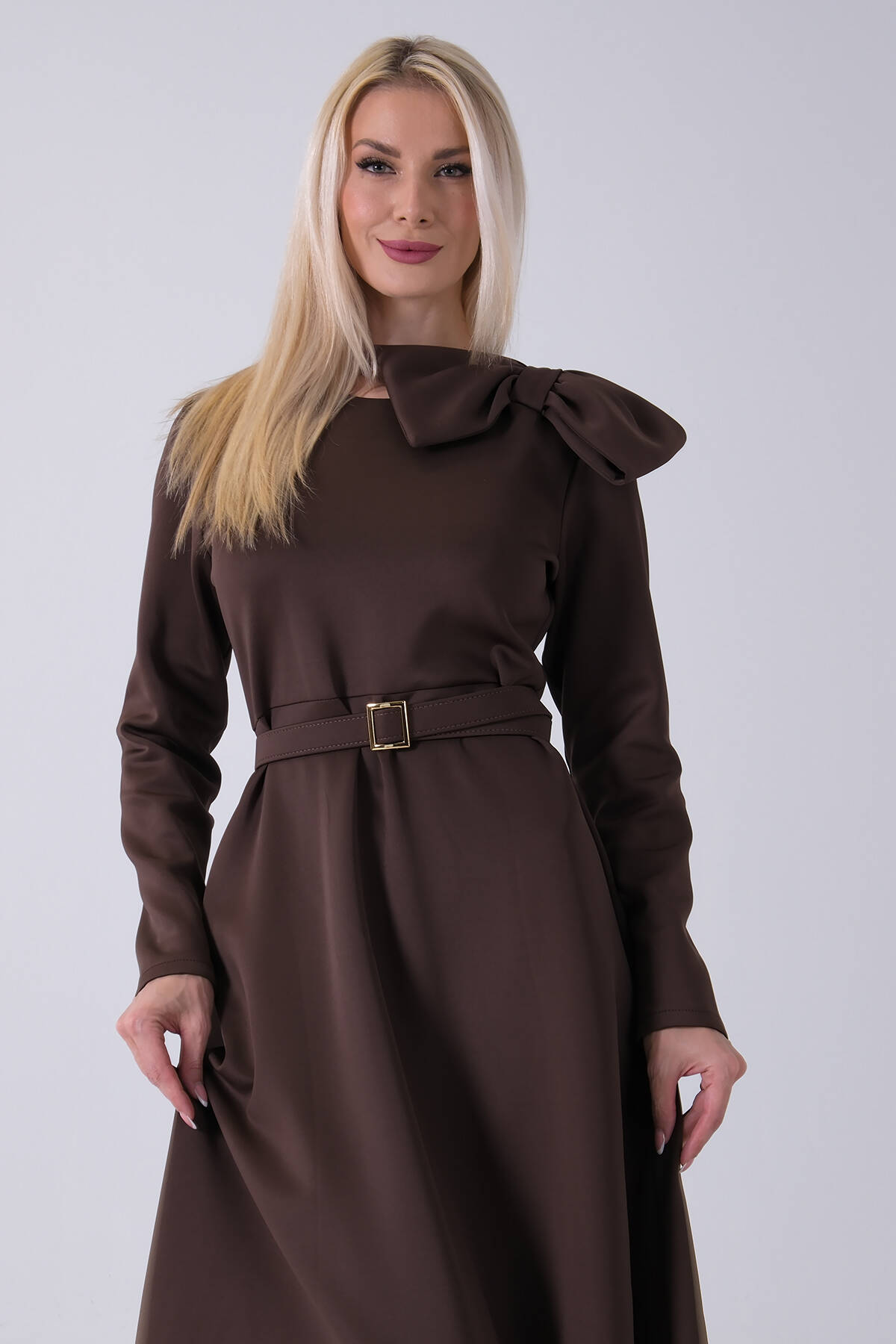 Kahve Omuz Fiyonk Detaylı Kemerli Bisiklet Yaka Scuba Tesettür Elbise 4593456.05