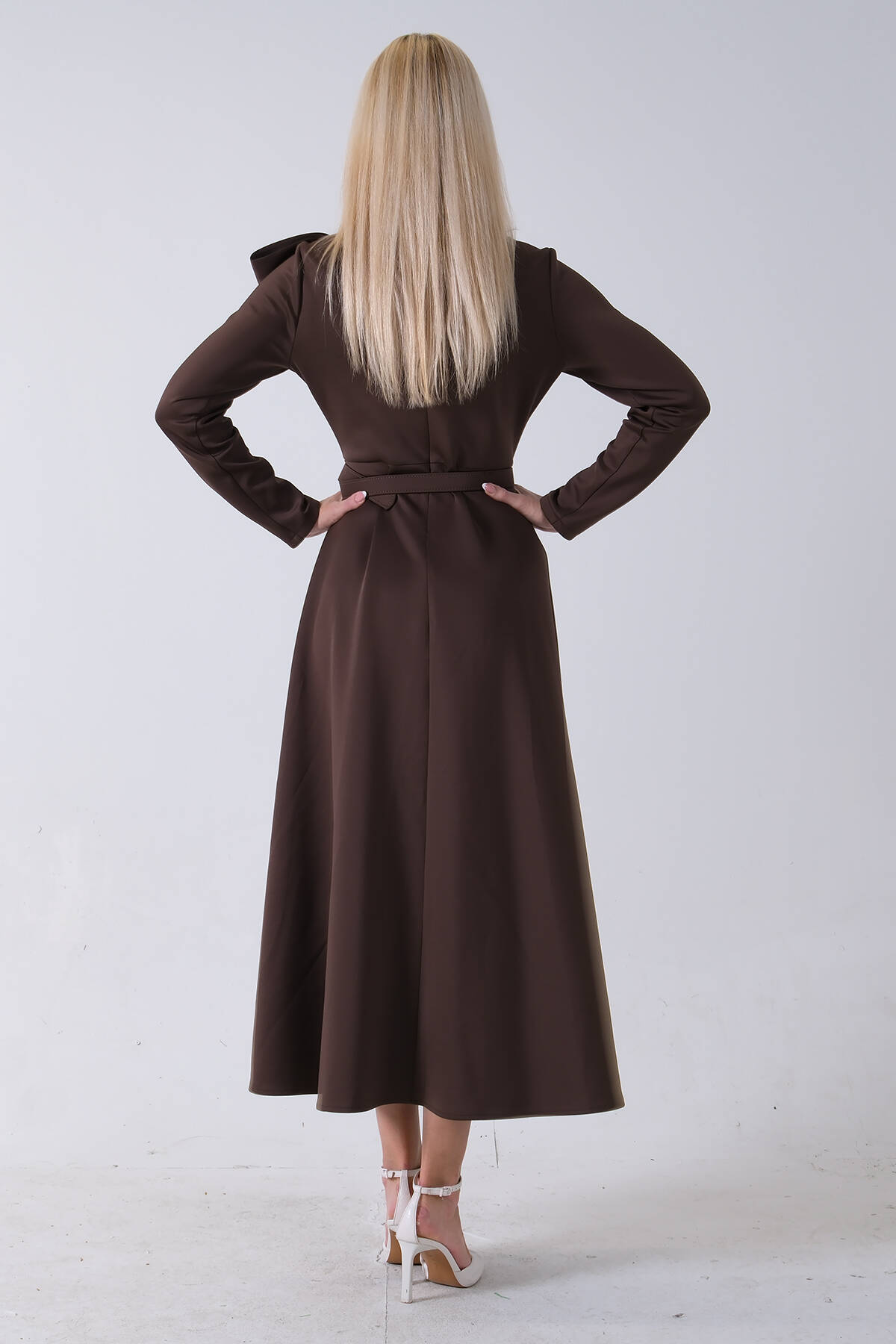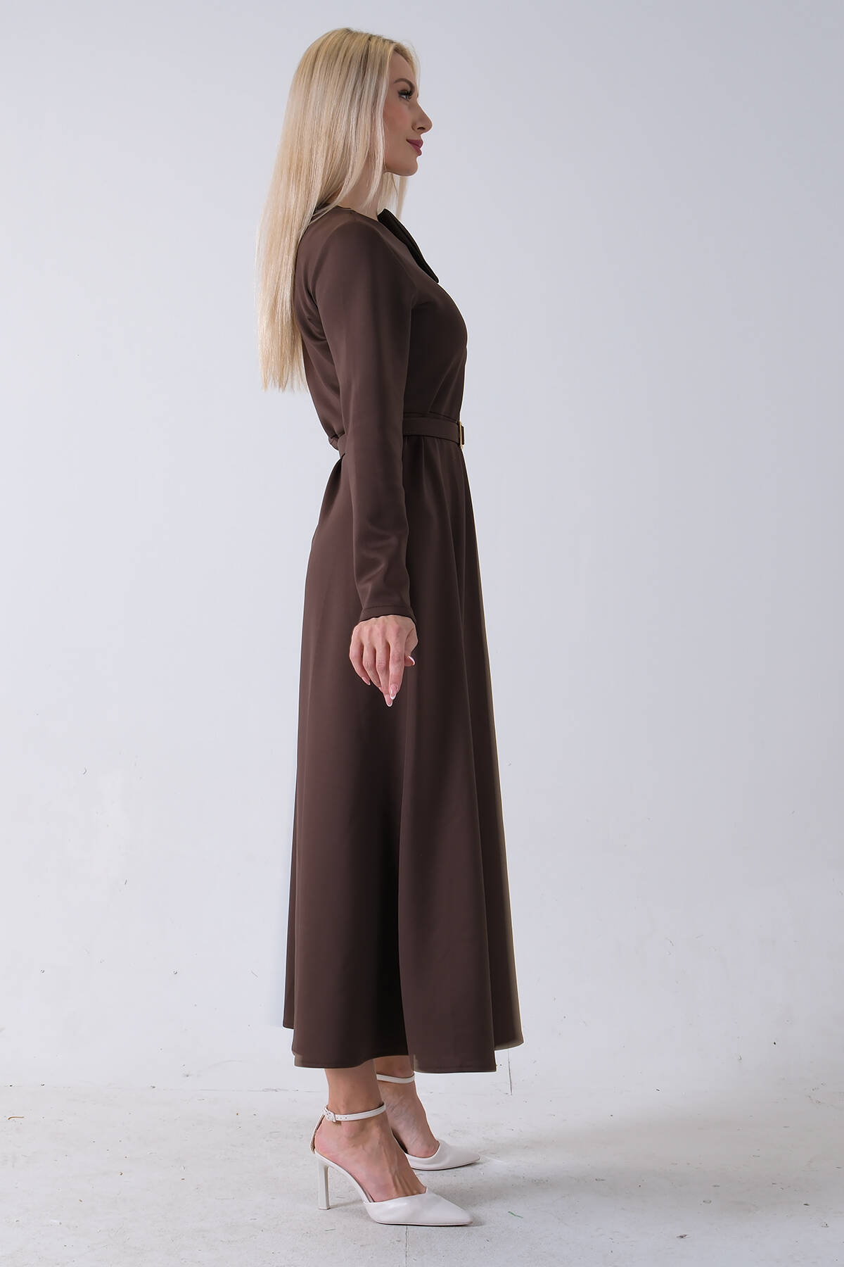 Kahve Boydan Düğme Kapamalı Bileği Lastikli Beli Kemerli Elbise 4593459.05