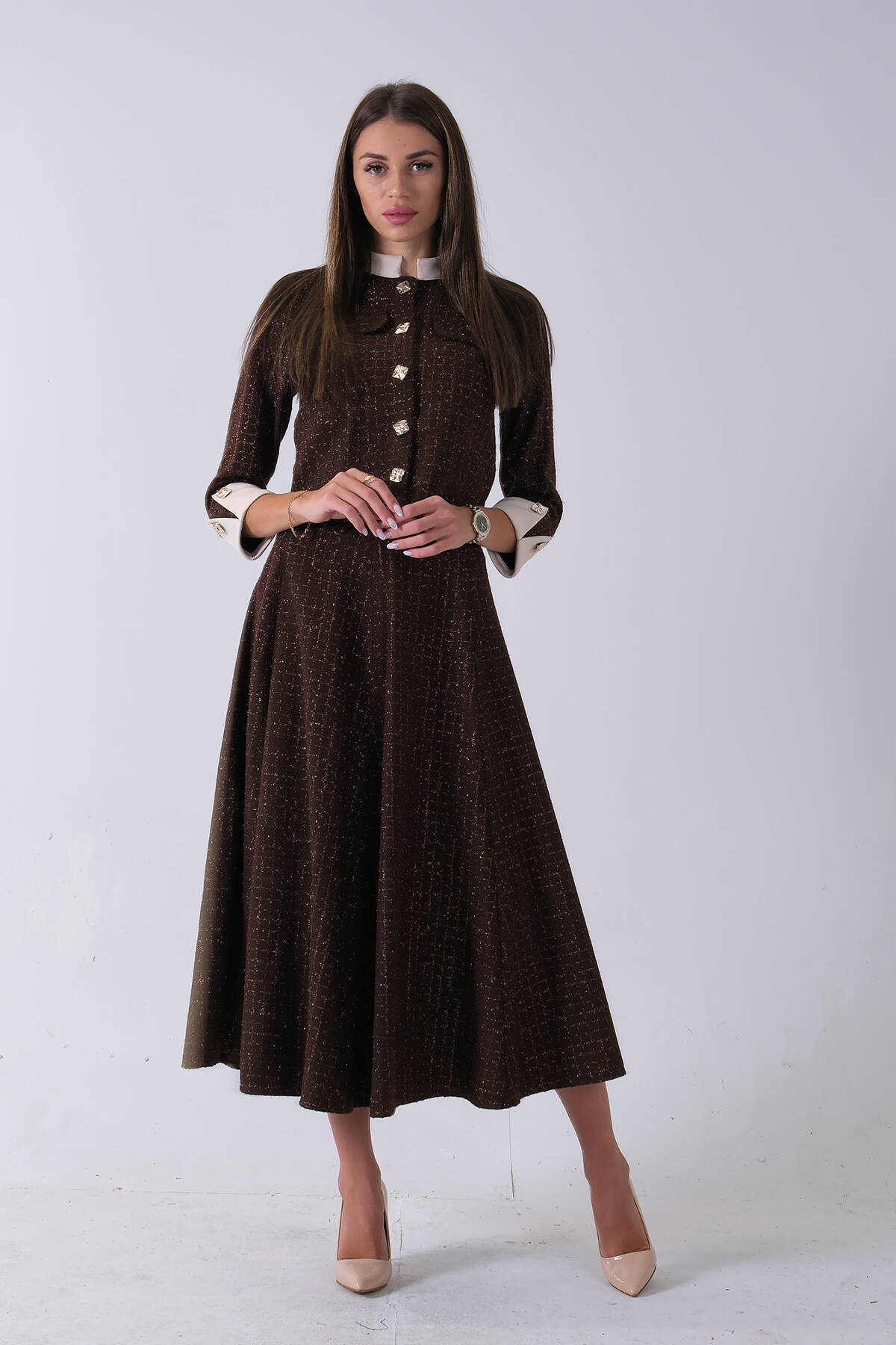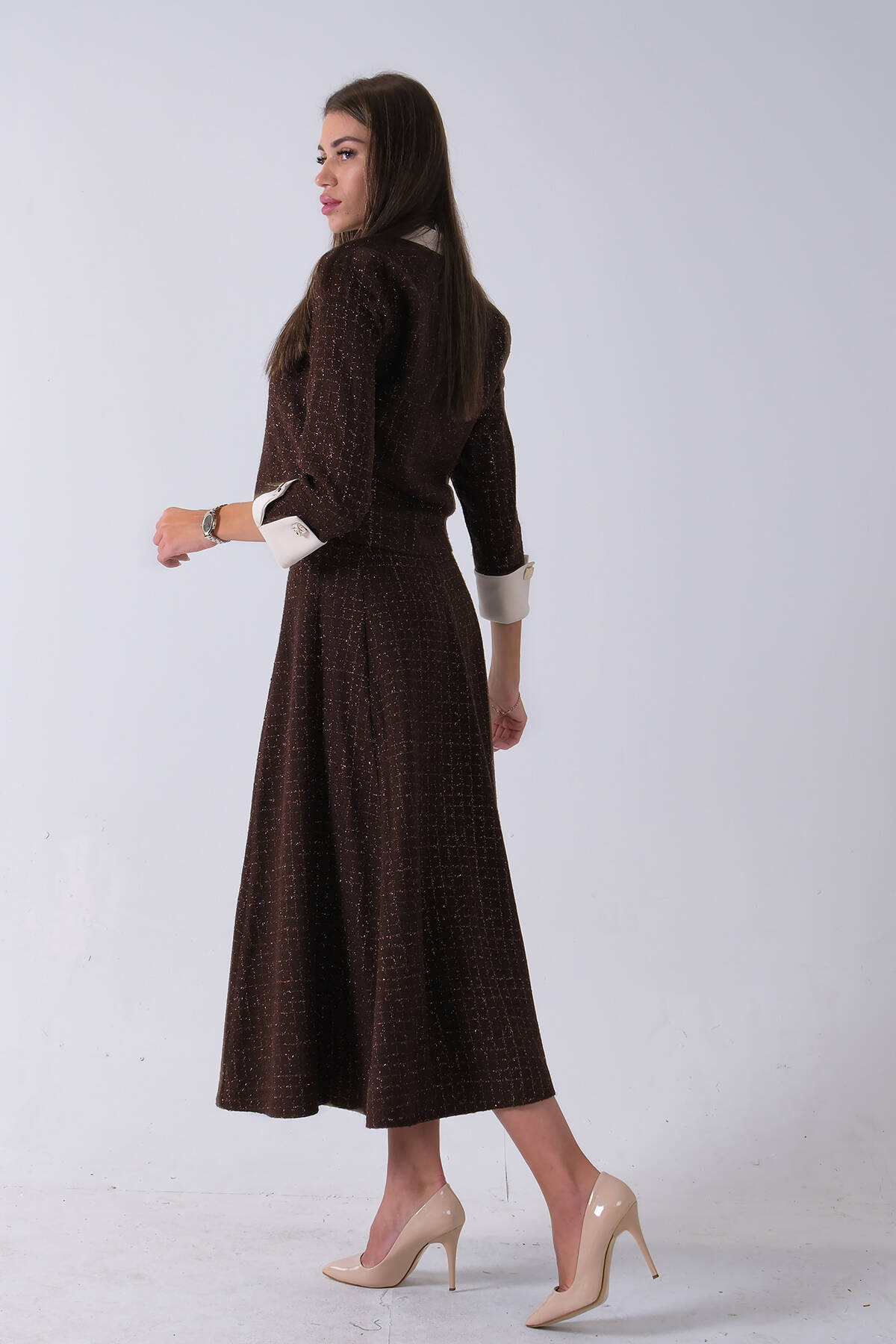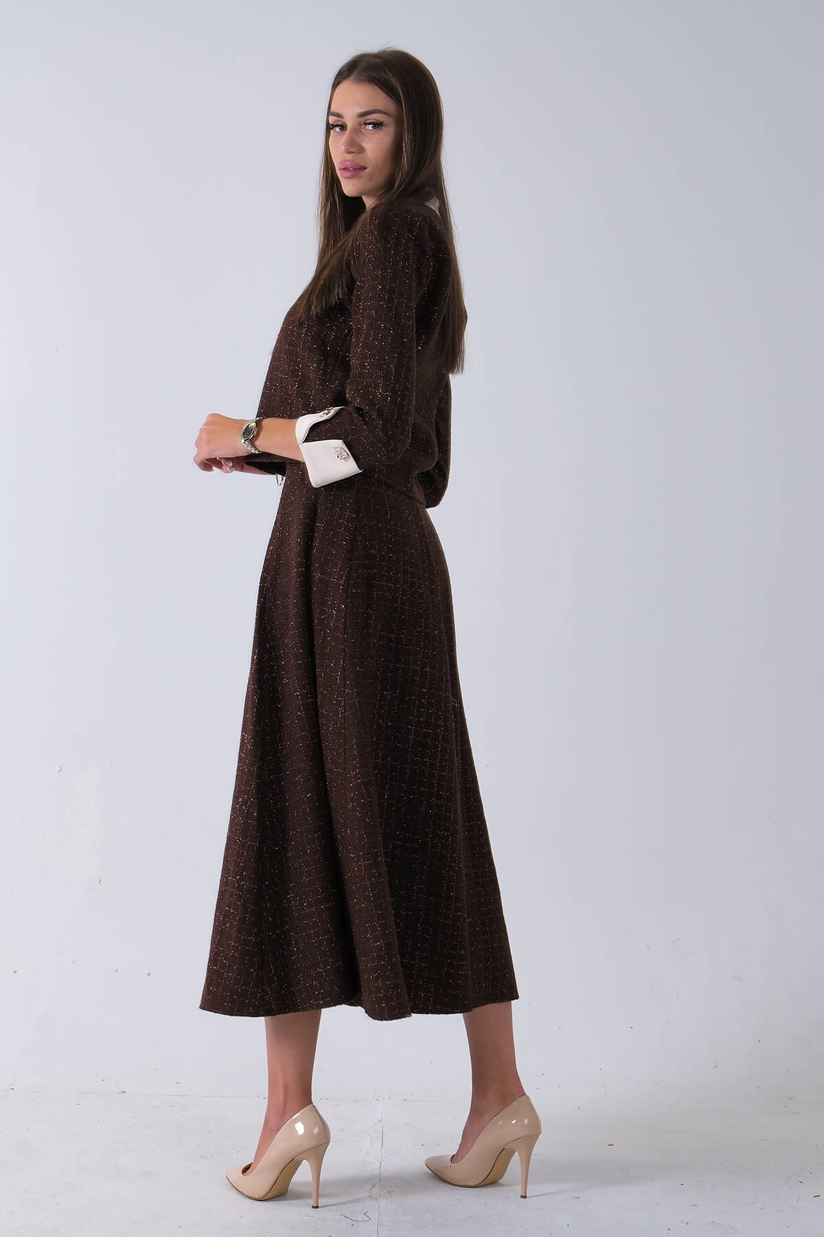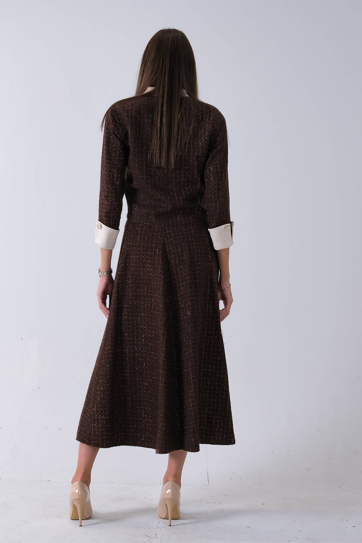 Kahve Önü Düğme Kapamalı Crop Ceket Etekli Tüvid Takım 45950601.05