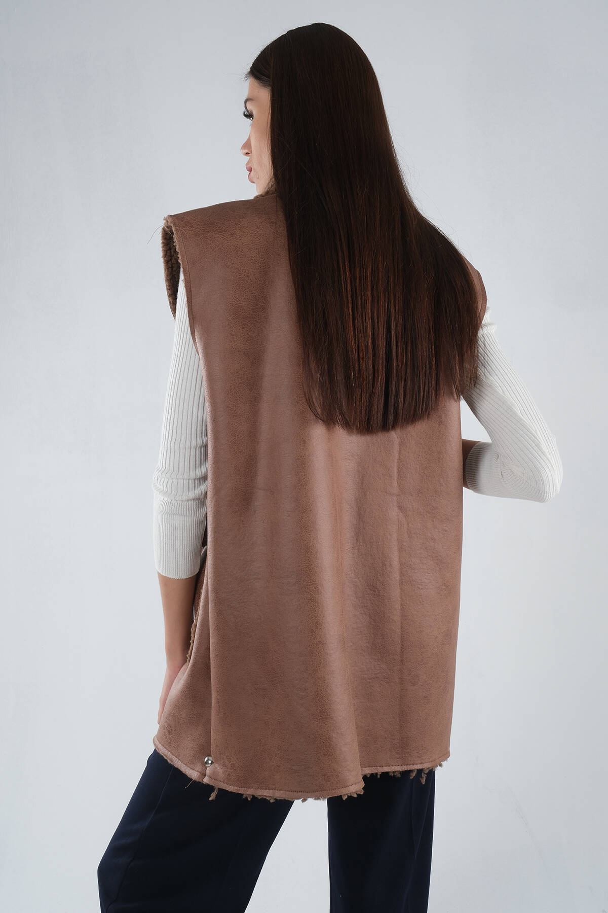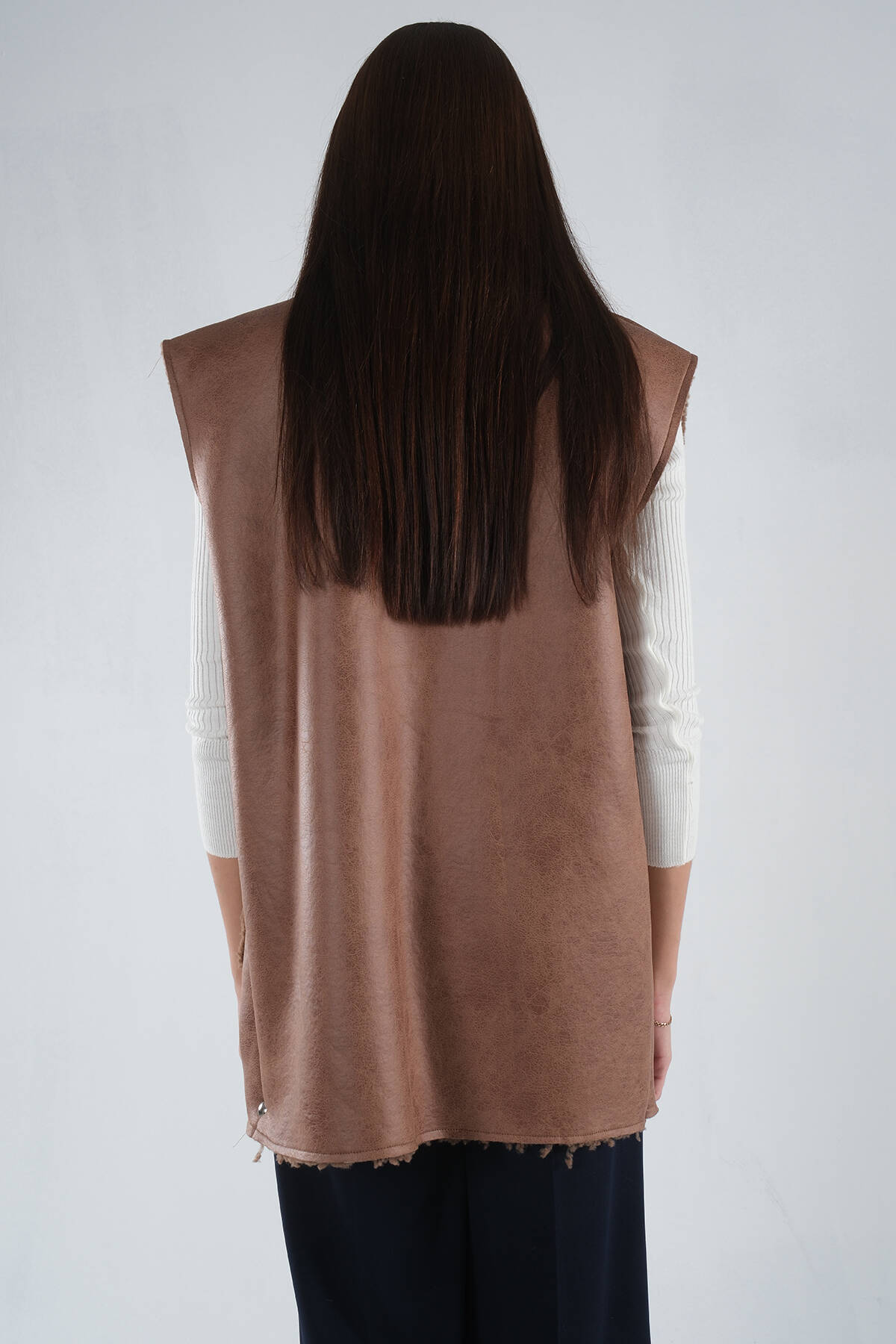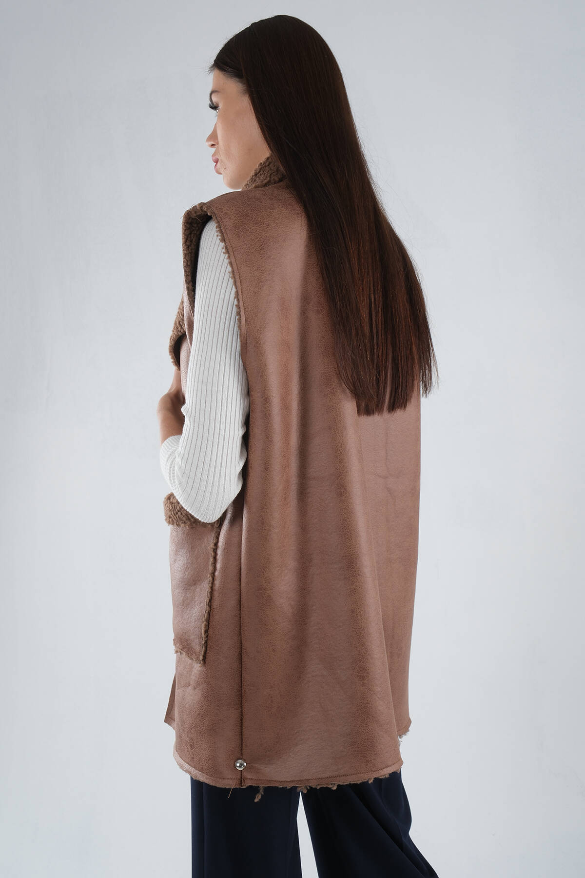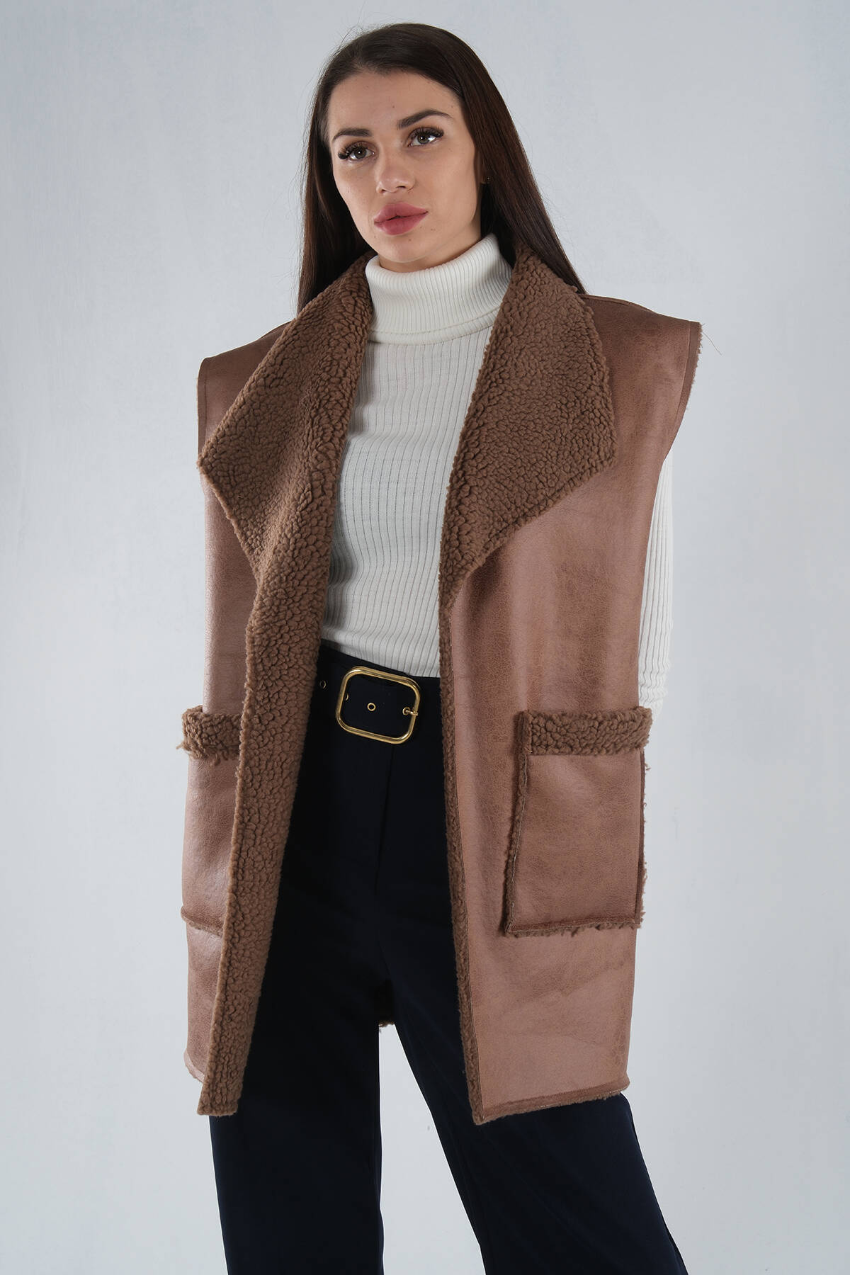 Kahve Yakalı Cepli 2 Düğmeli Kemer Bağlamalı Kaşe Yelek 5307107.05