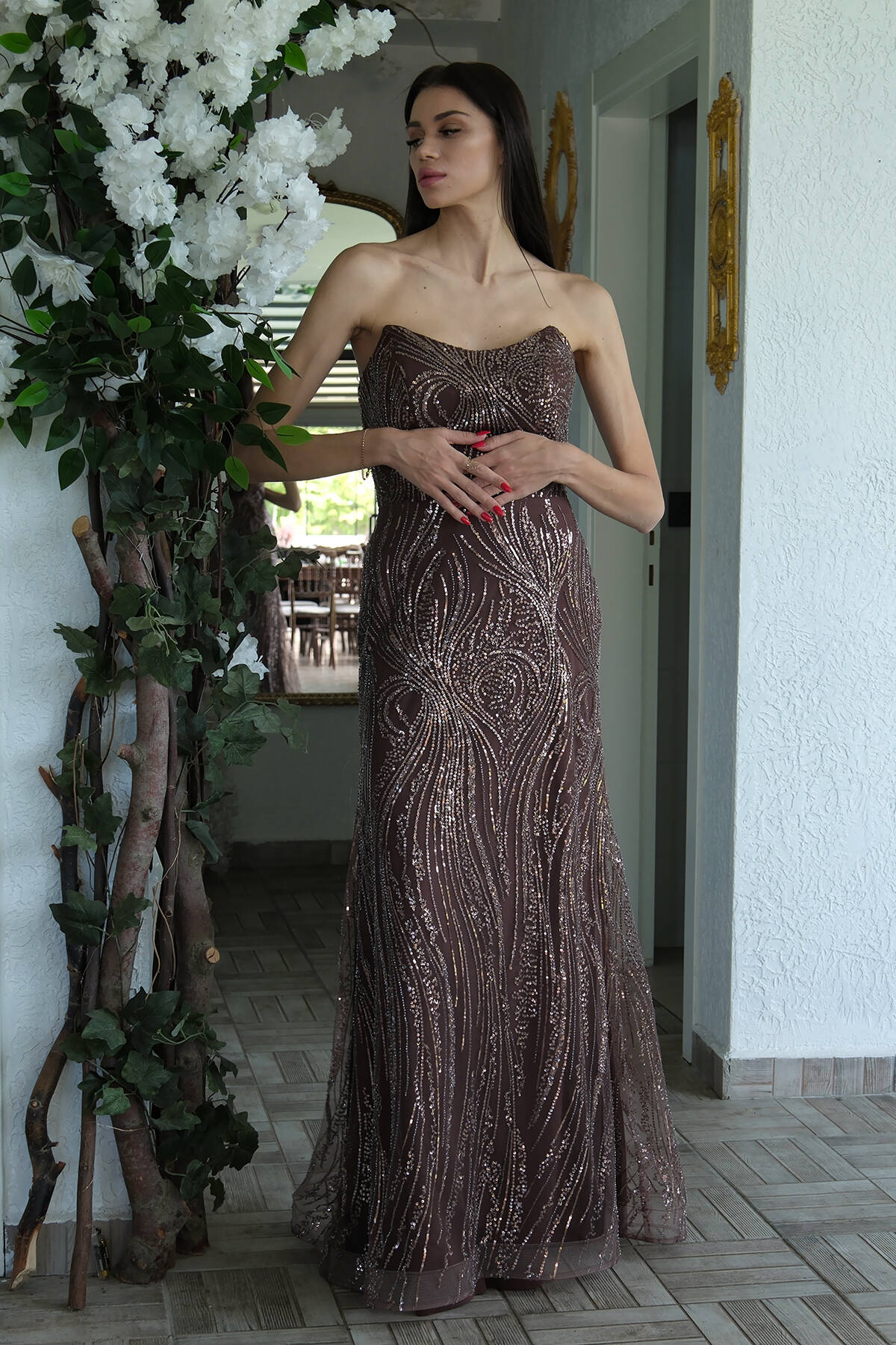 Kahve Taş İşlemeli Uzun Balık Abiye 0801056.05