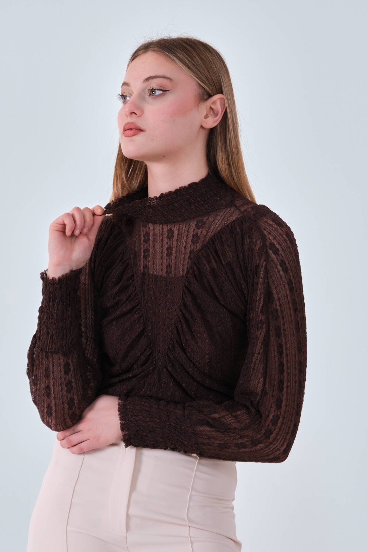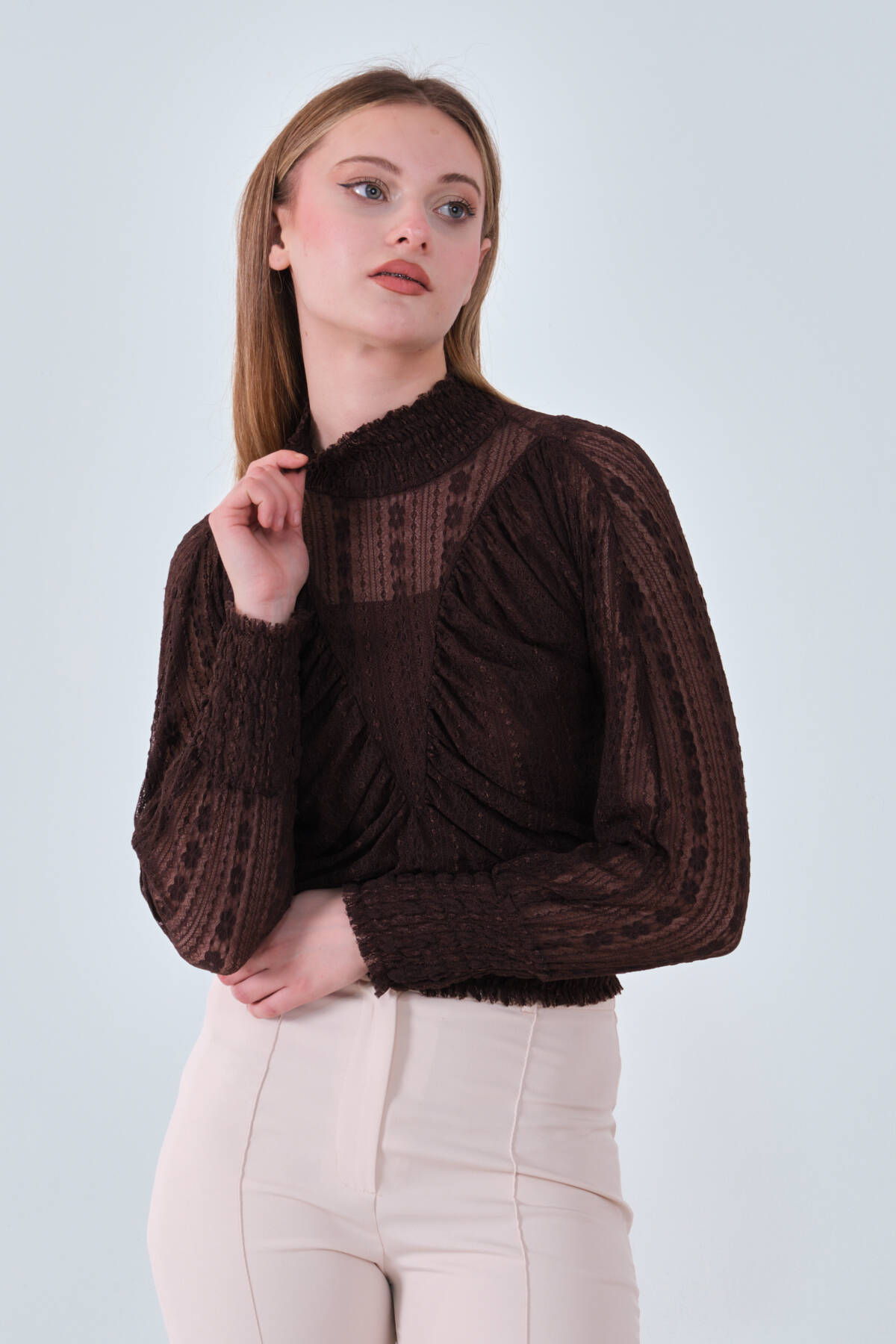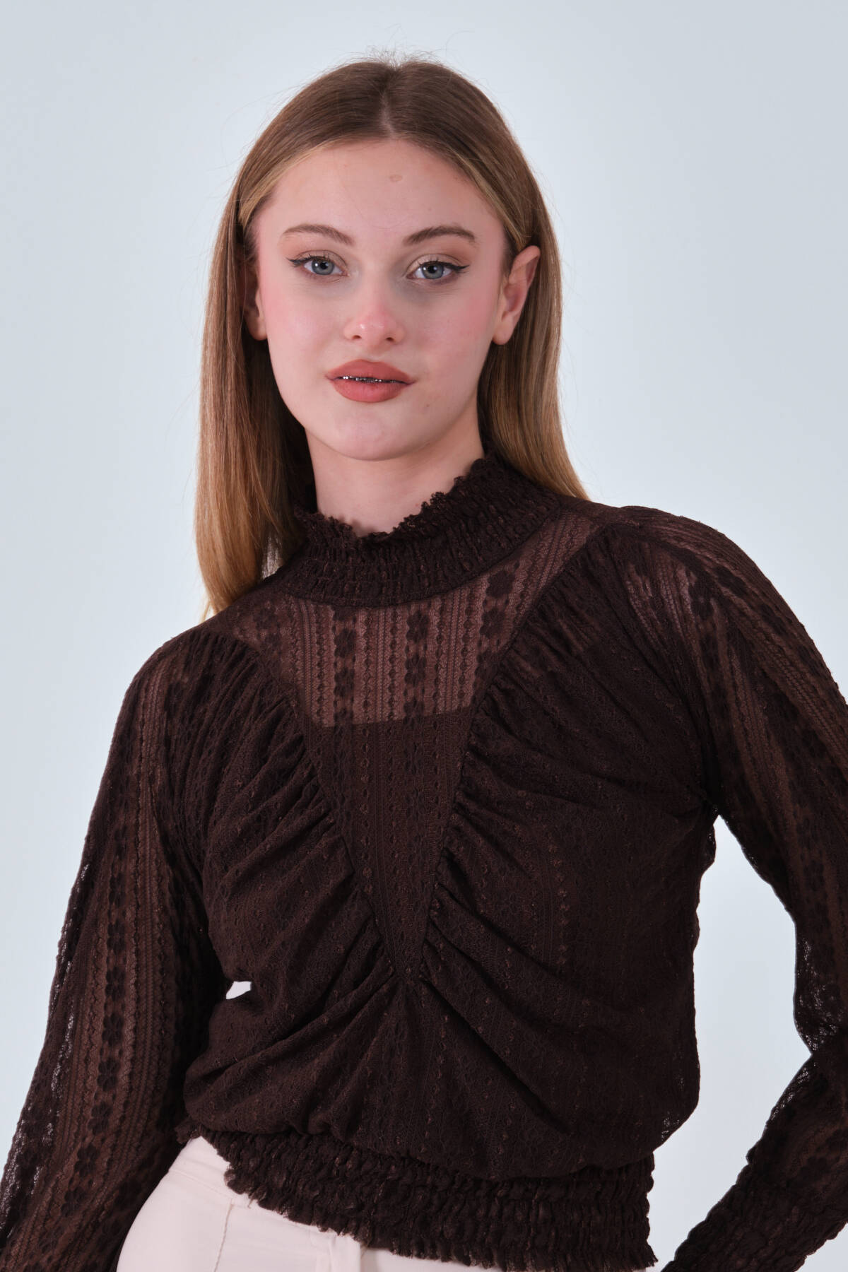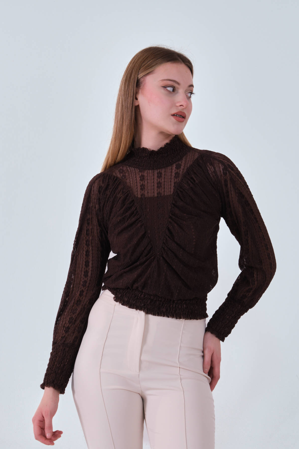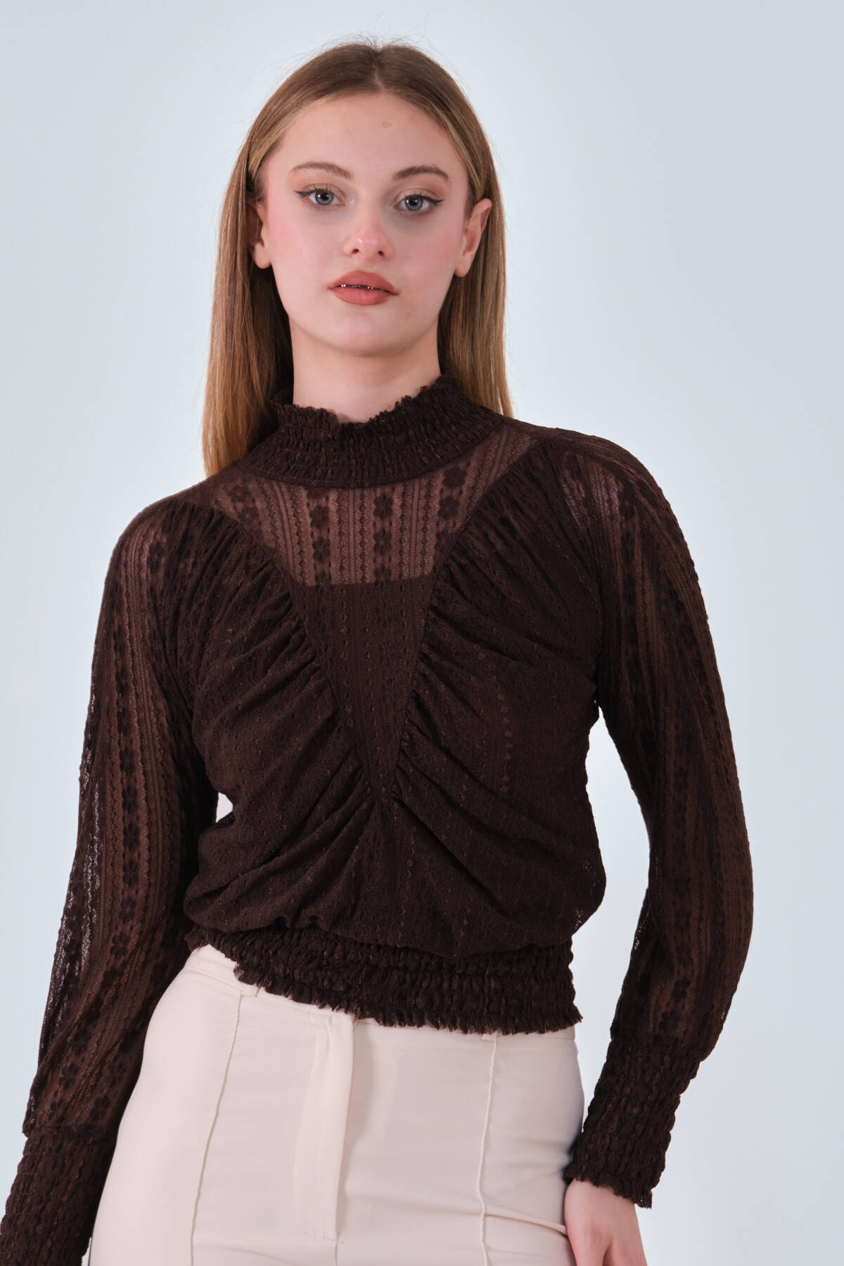 Modelin Ölçüleri : Boy: 1.80 cm / Göğüs: 88 cm / Bel: 69 cm /Basen : 94 cm Mankenin Üzerindeki Ürün 38/M Bedendir %100 Polyester Büzgü Ve Fırfır Detaylı Transparan Bluz Ürün Boyu : 58 cm Stüdyo Çekimlerinde Renkler Işık Farklılıgından Dolayı Değişiklik Gösterebilir