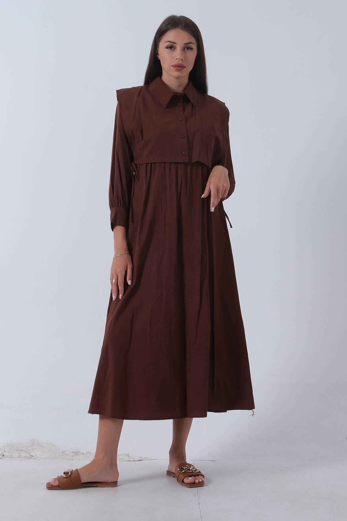 Kahve Üzeri Kendinden Gömlek Detaylı Tesettür Elbise 4593306.05
