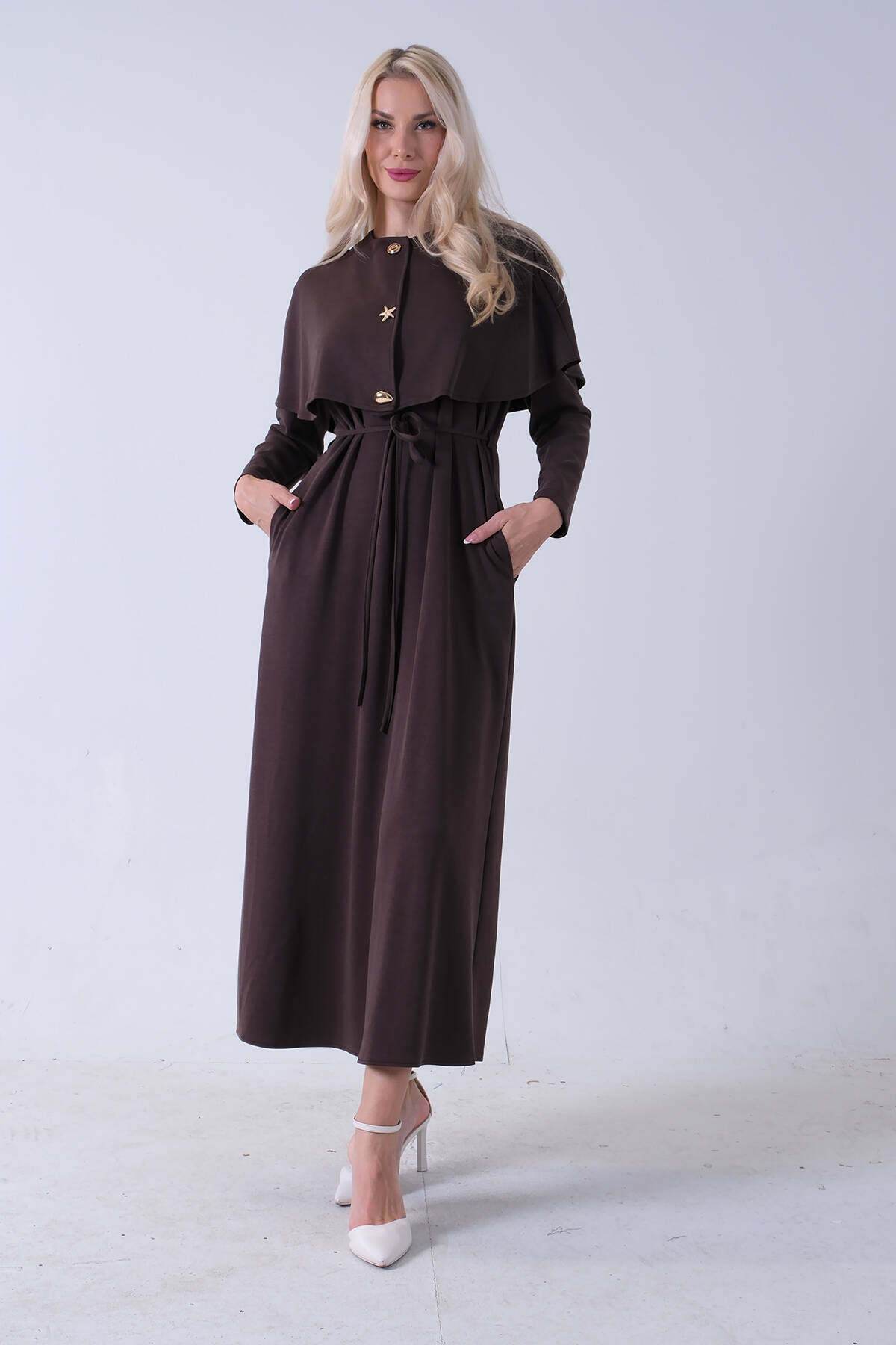 Kahve Üzeri Kendinden Şallı Kemer Bağlamalı Tesettür Elbise 4571581.05