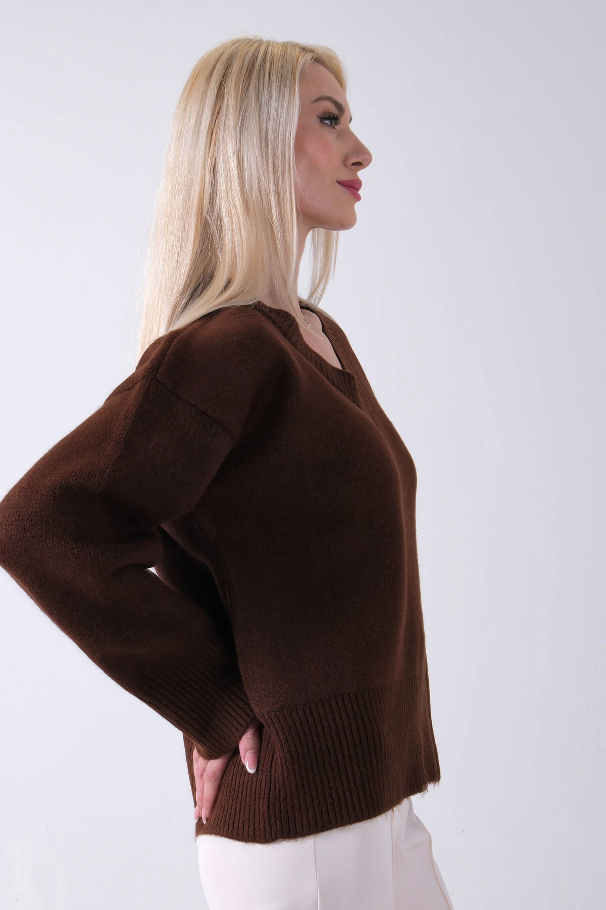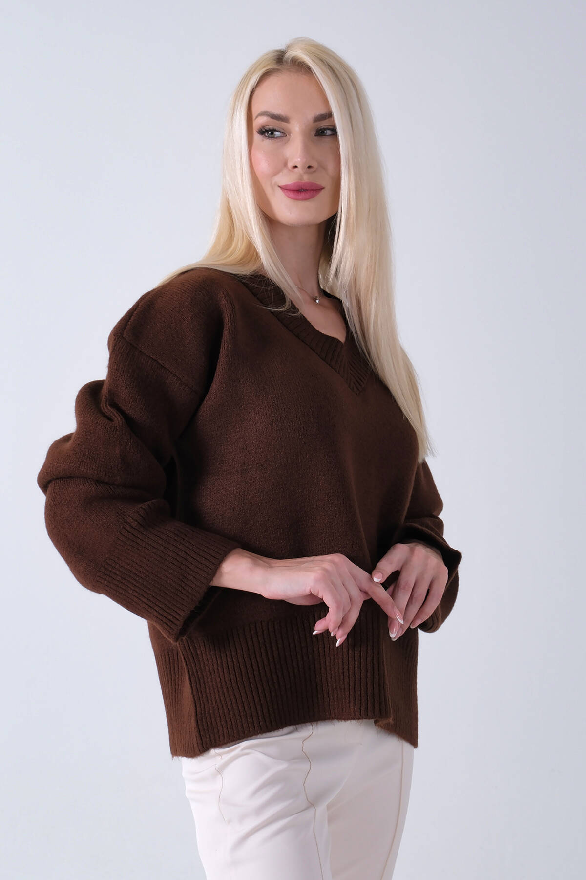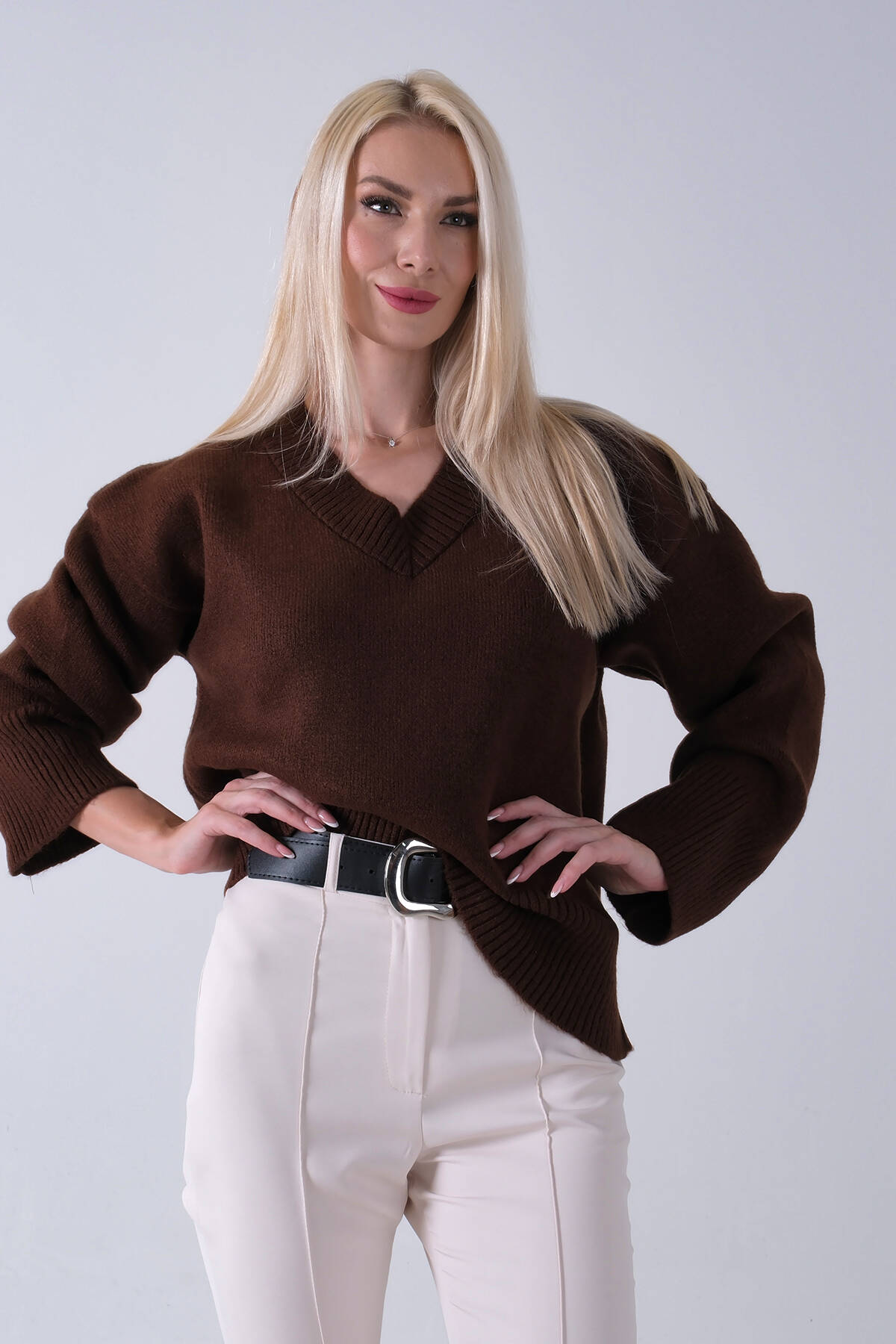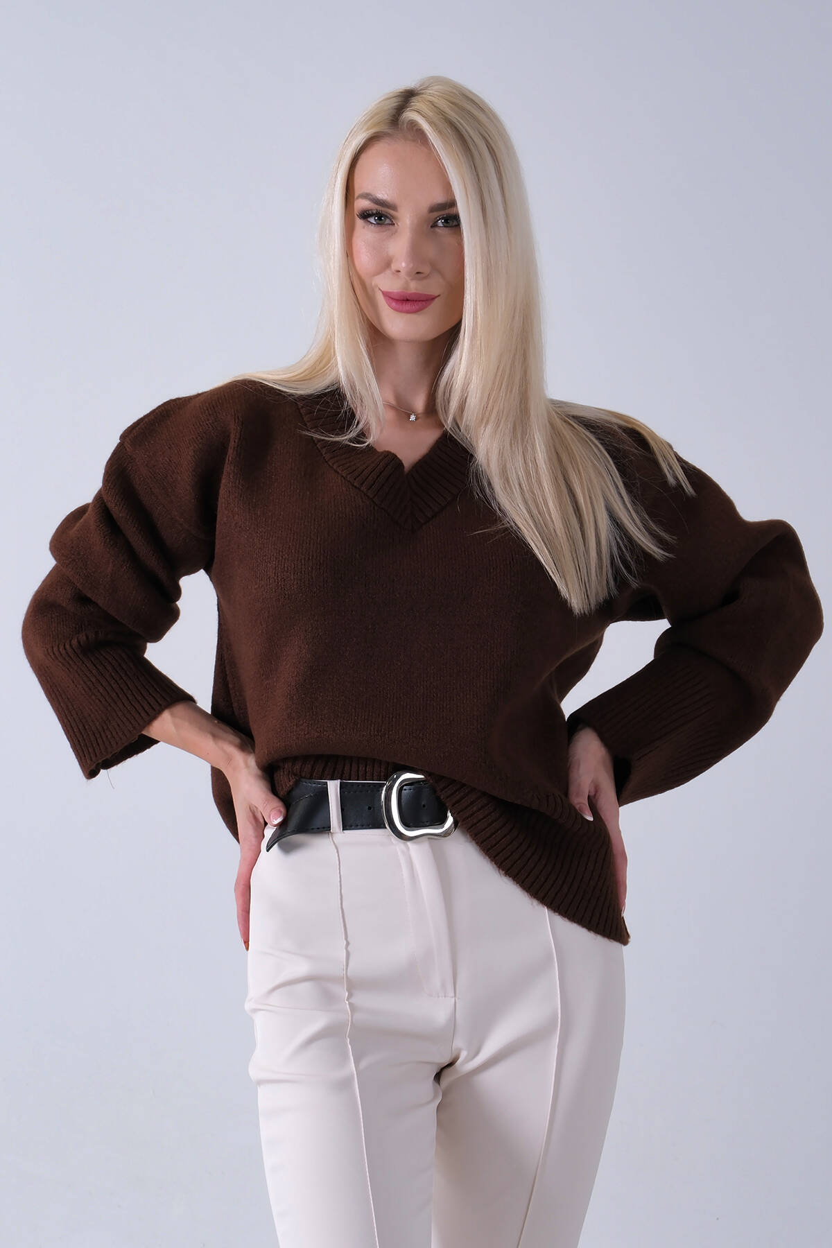 Kahve V Yaka Beli Lastikli Triko Kazak 46892623.05