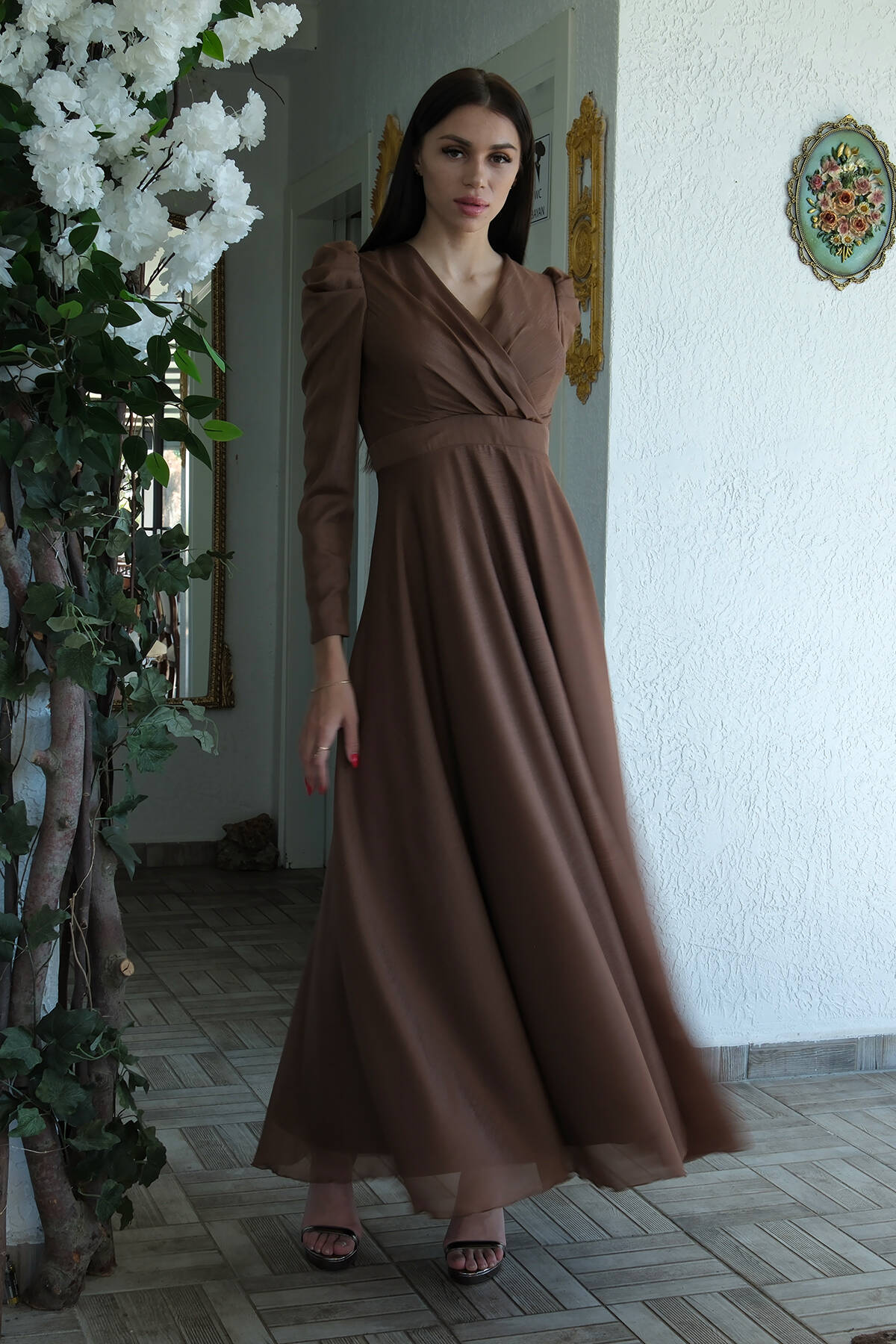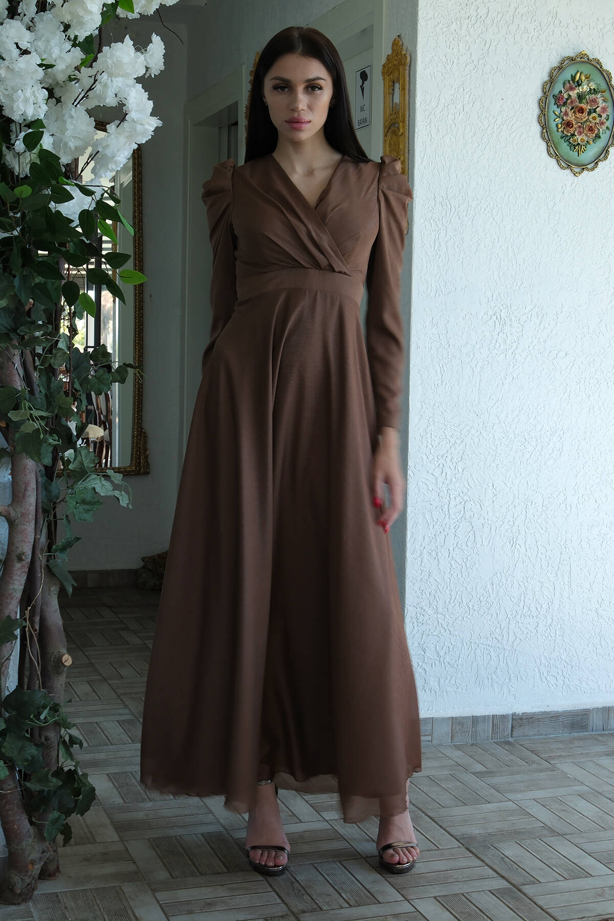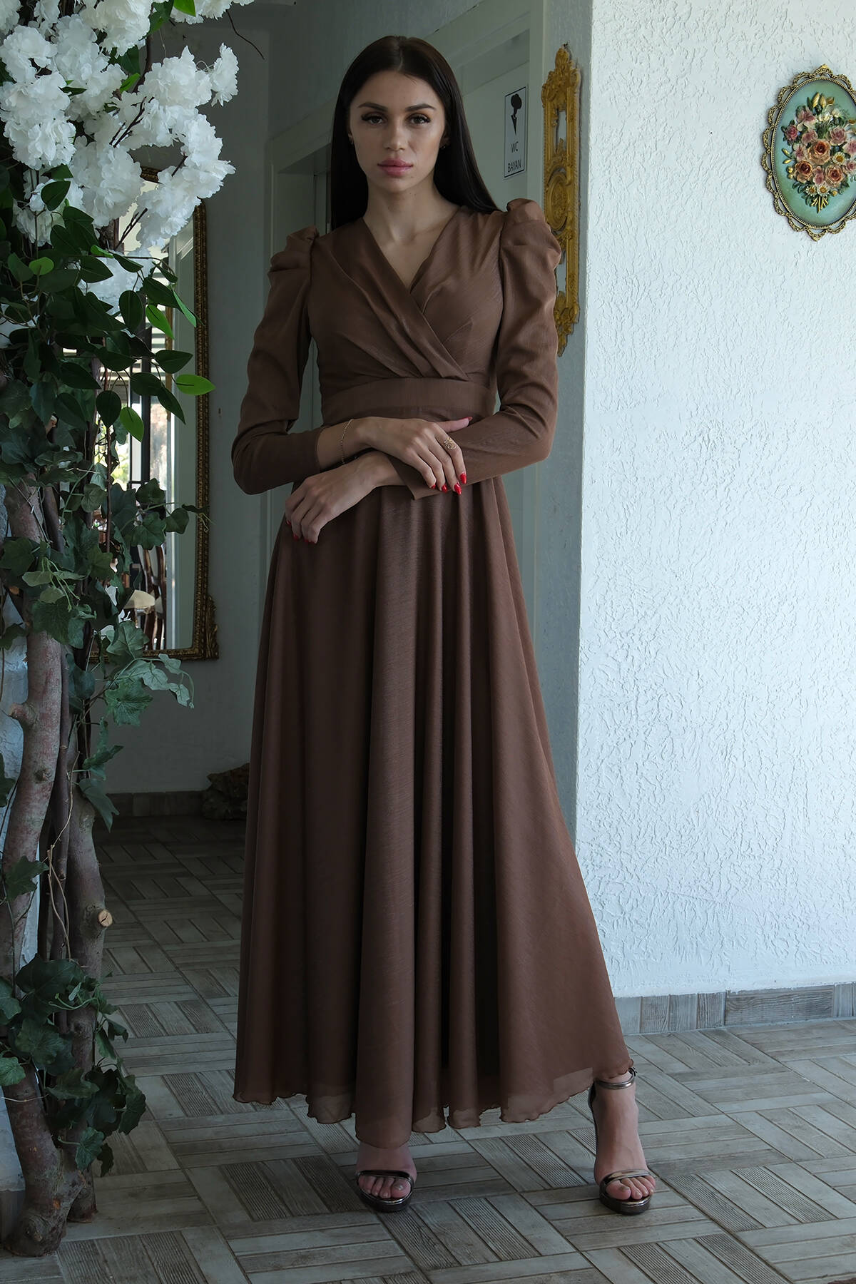 Kahve V Yaka Parıltılı Uzun Kollu Abiye 6502514.05