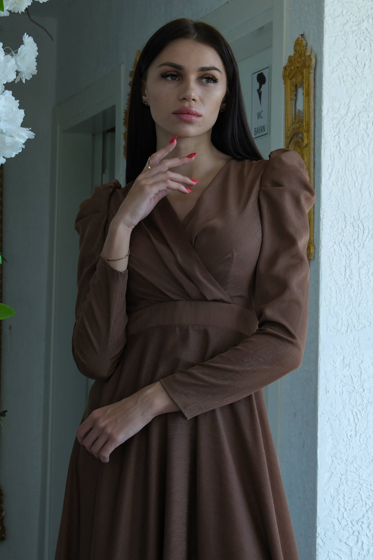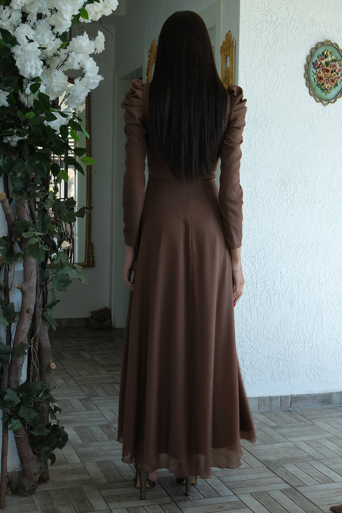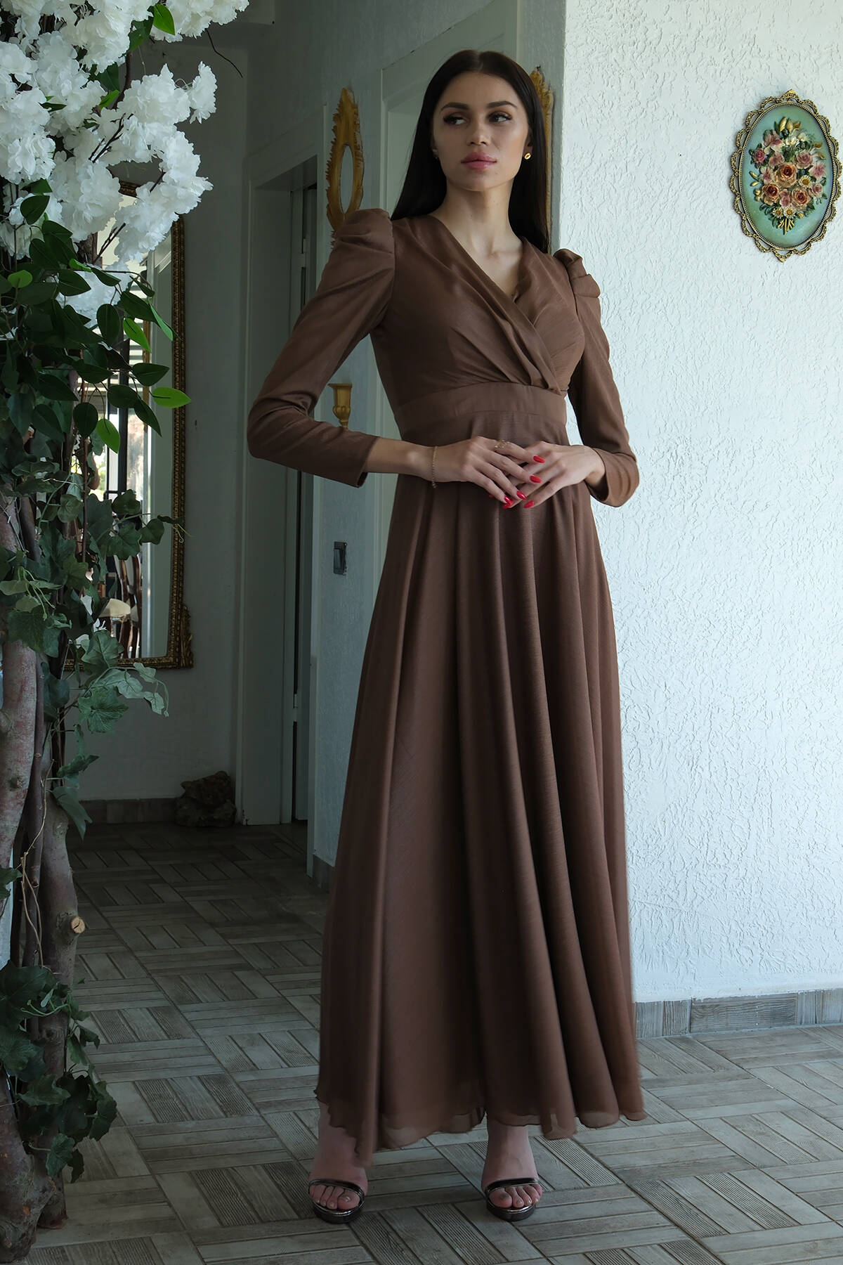 Kahve V Yaka Parıltılı Uzun Kollu Abiye 6502514.05