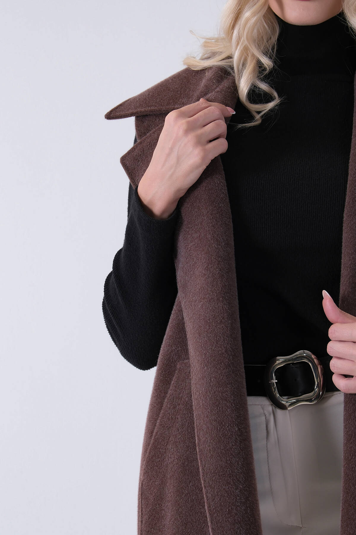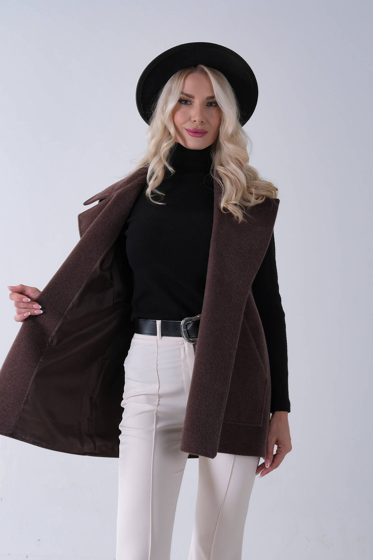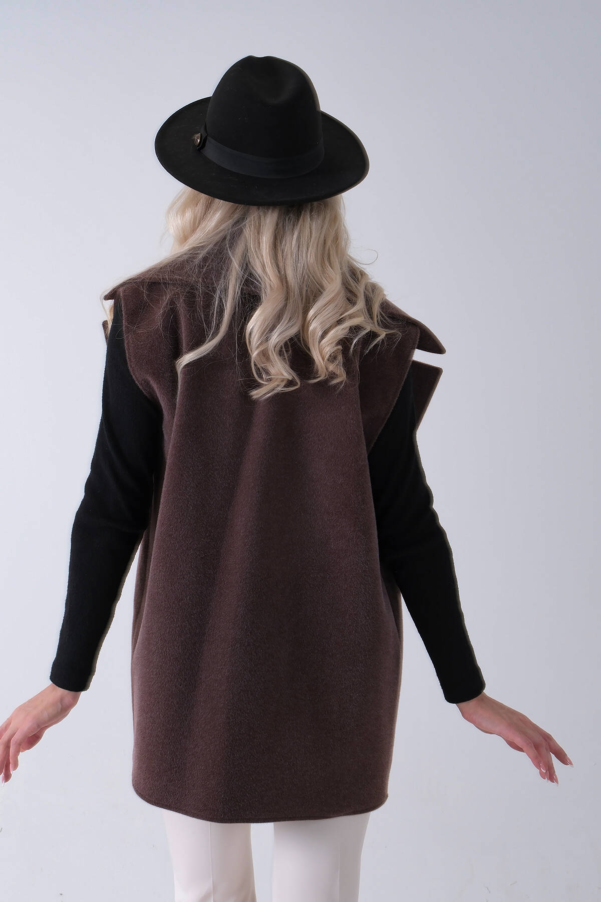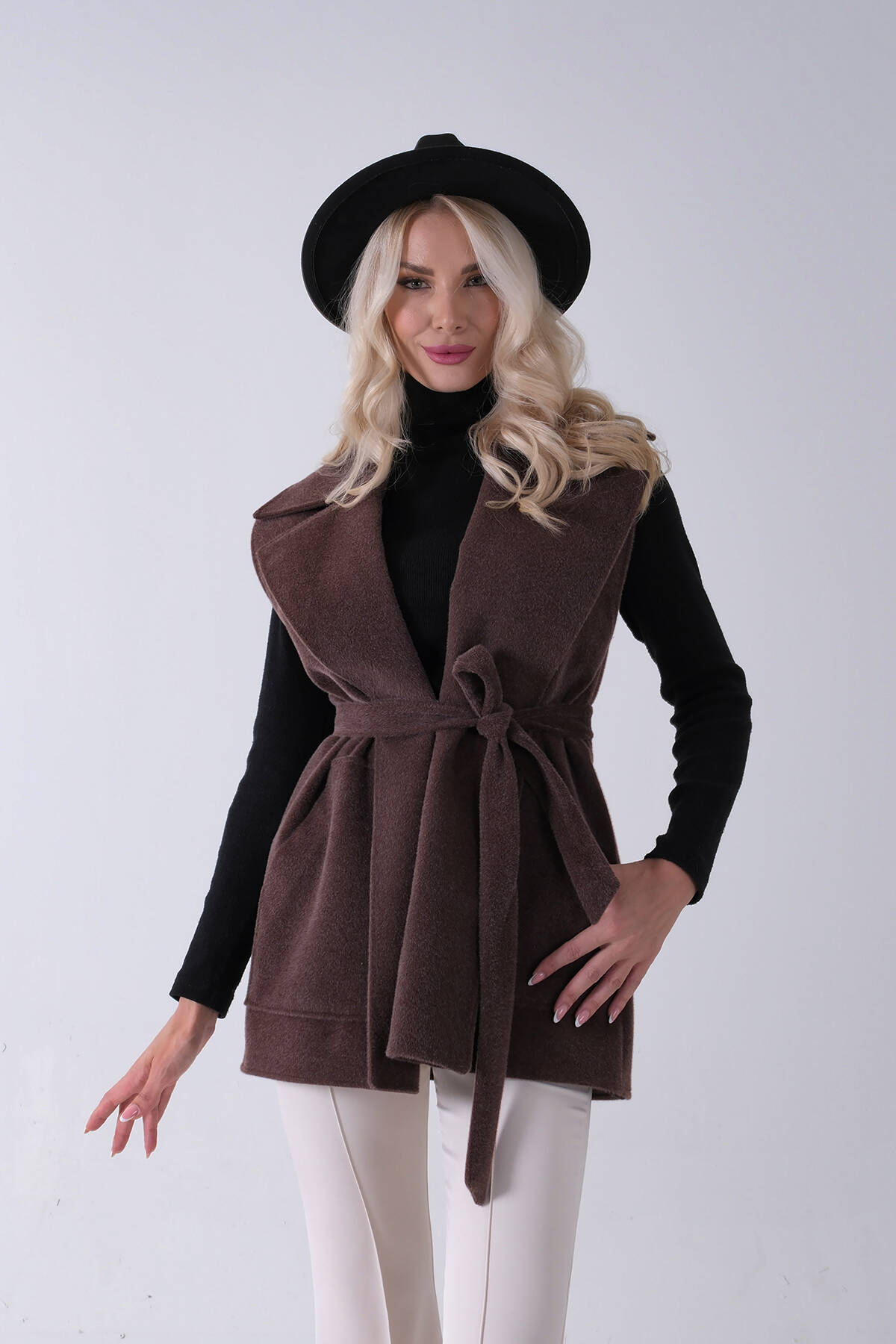 Kahve Yakalı Cepli 2 Düğmeli Kemer Bağlamalı Kaşe Yelek 5307107.05
