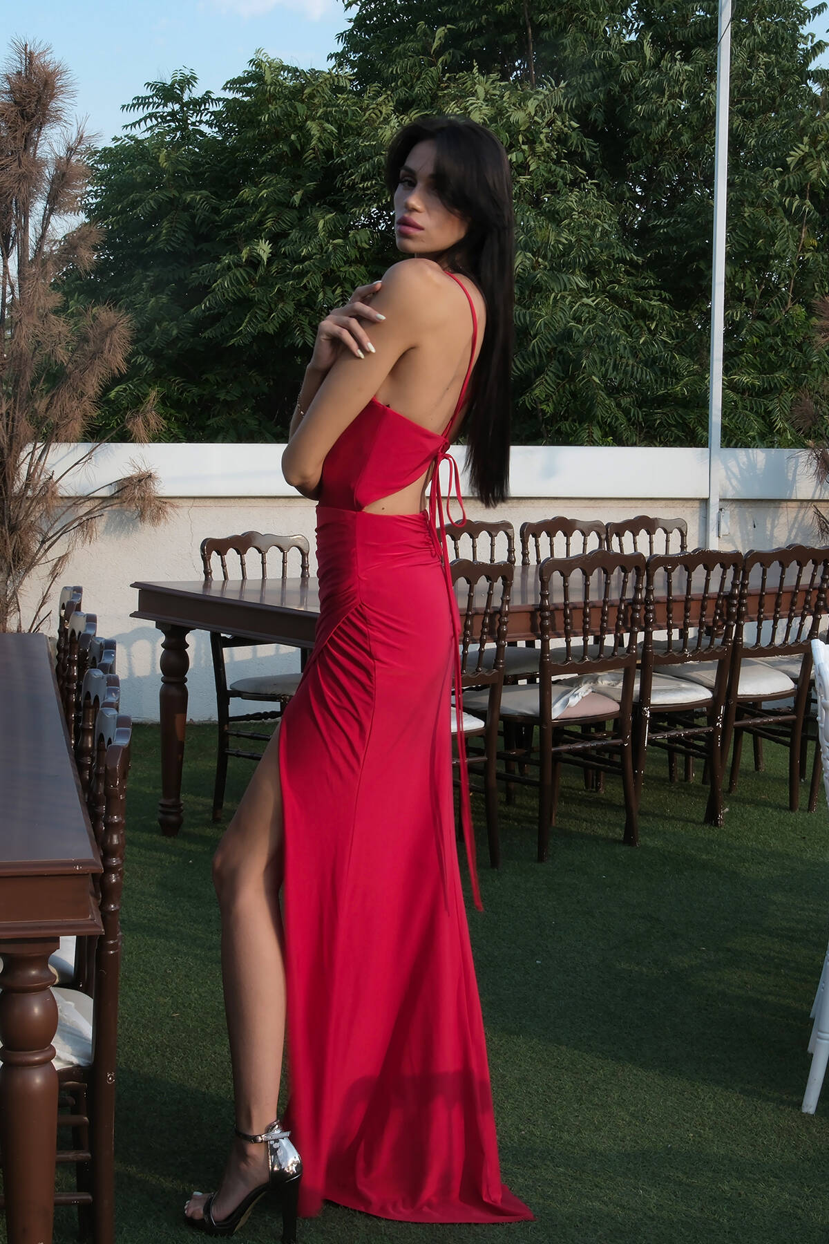 Kırmızı Askılı Yırtmaç Detaylı Drapeli Abiye 9705289.08