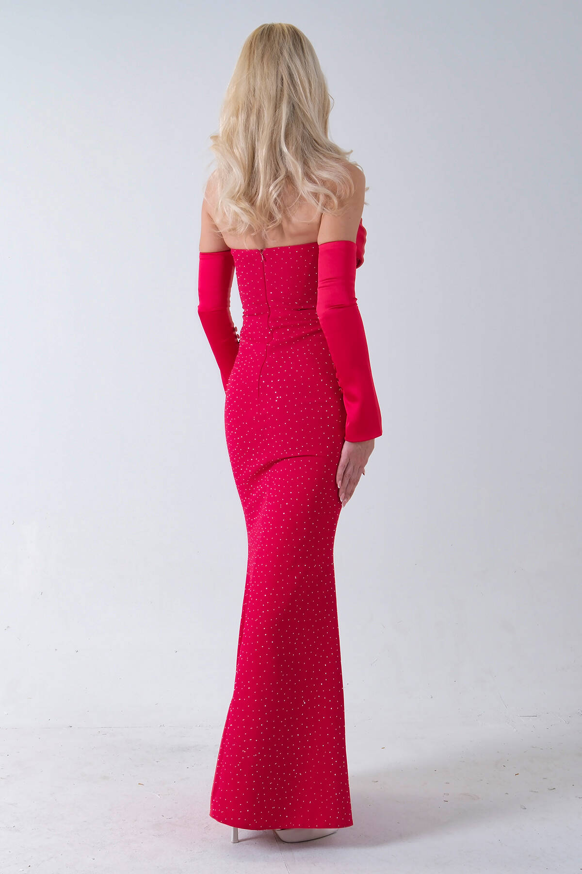 Kırmızı Drapeli Üzeri Işıltı Nokta Detaylı Kollu Abiye 0802502.08