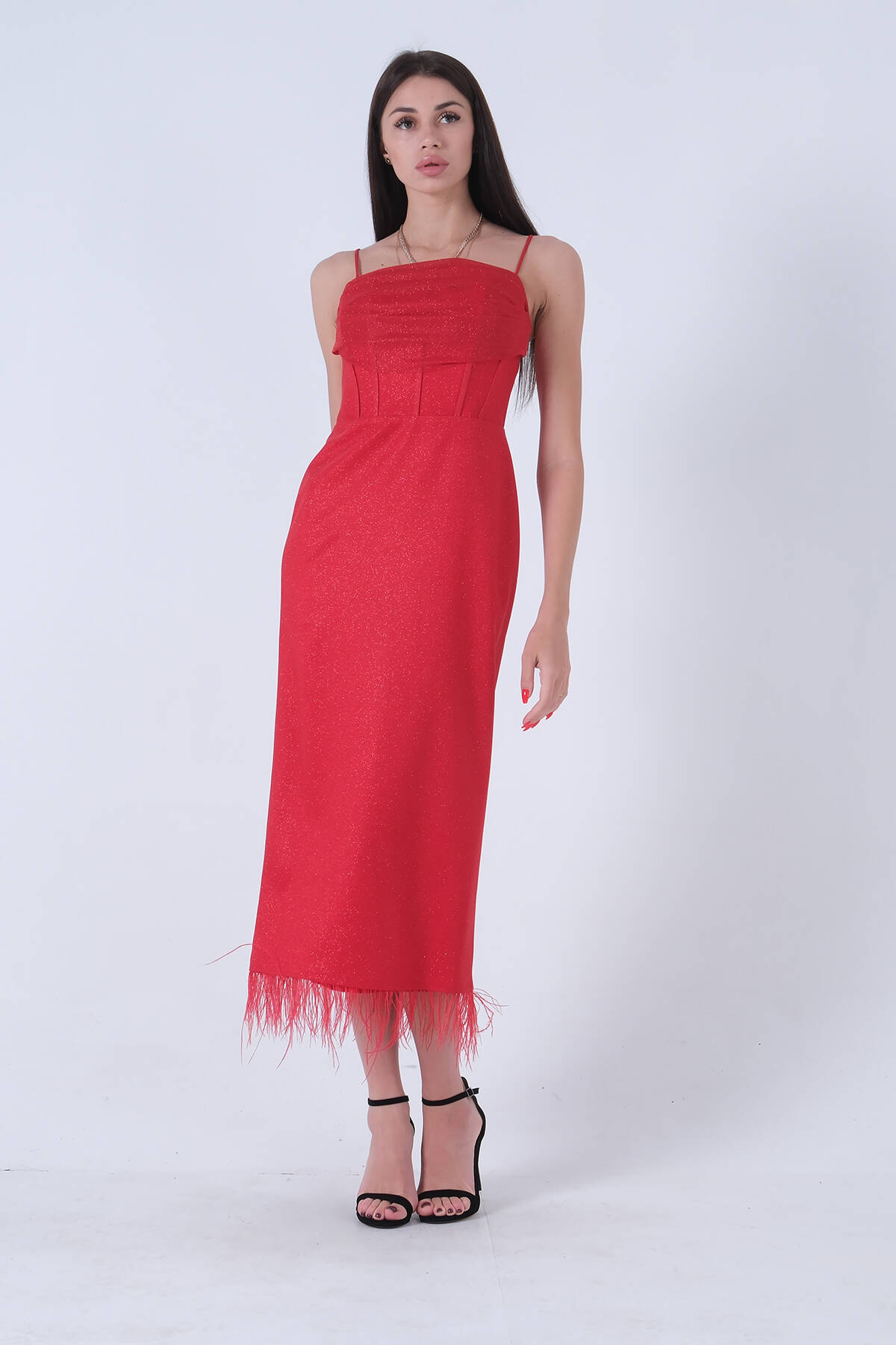 Kırmızı Etek Ucu Tüylü Simli Tül Şanel Abiye Elbise 1302245.08
