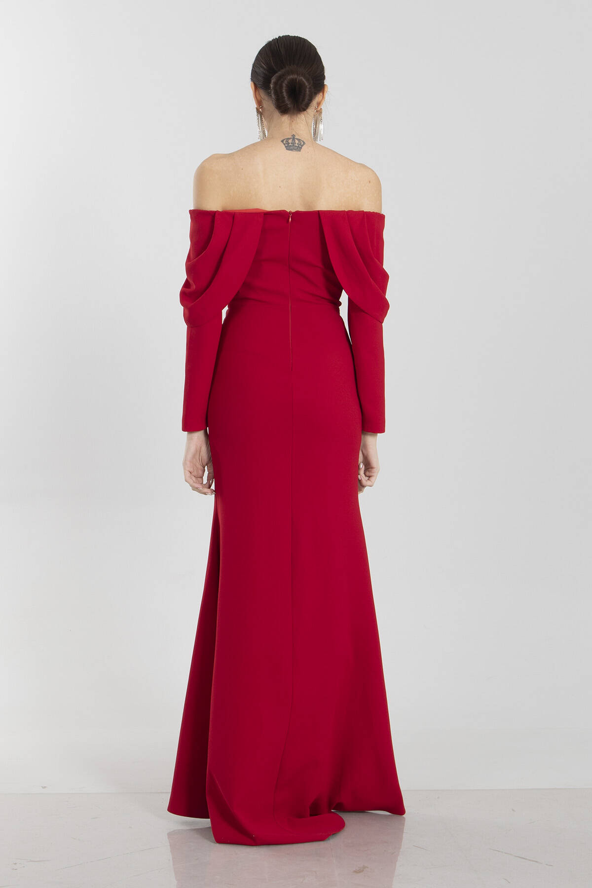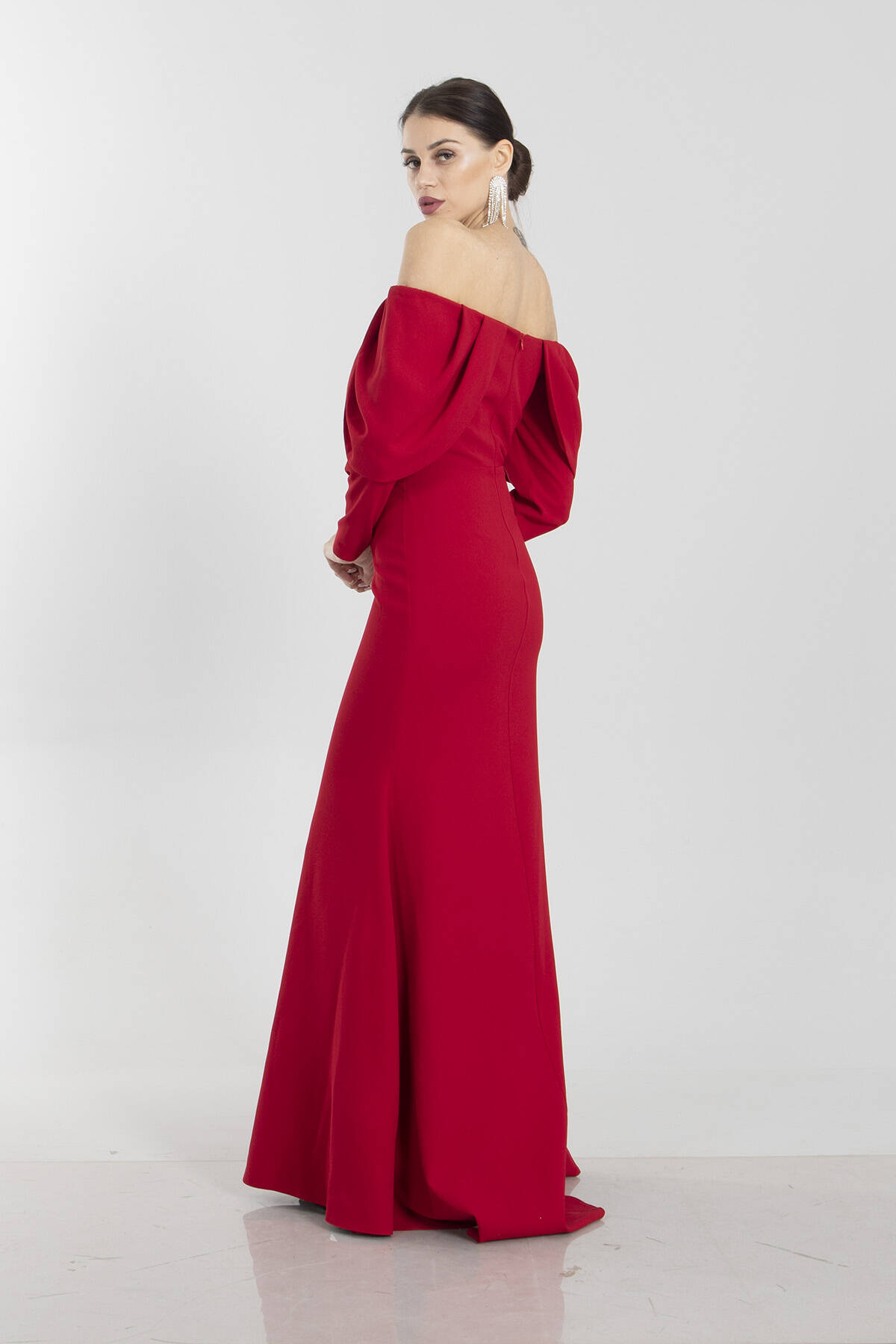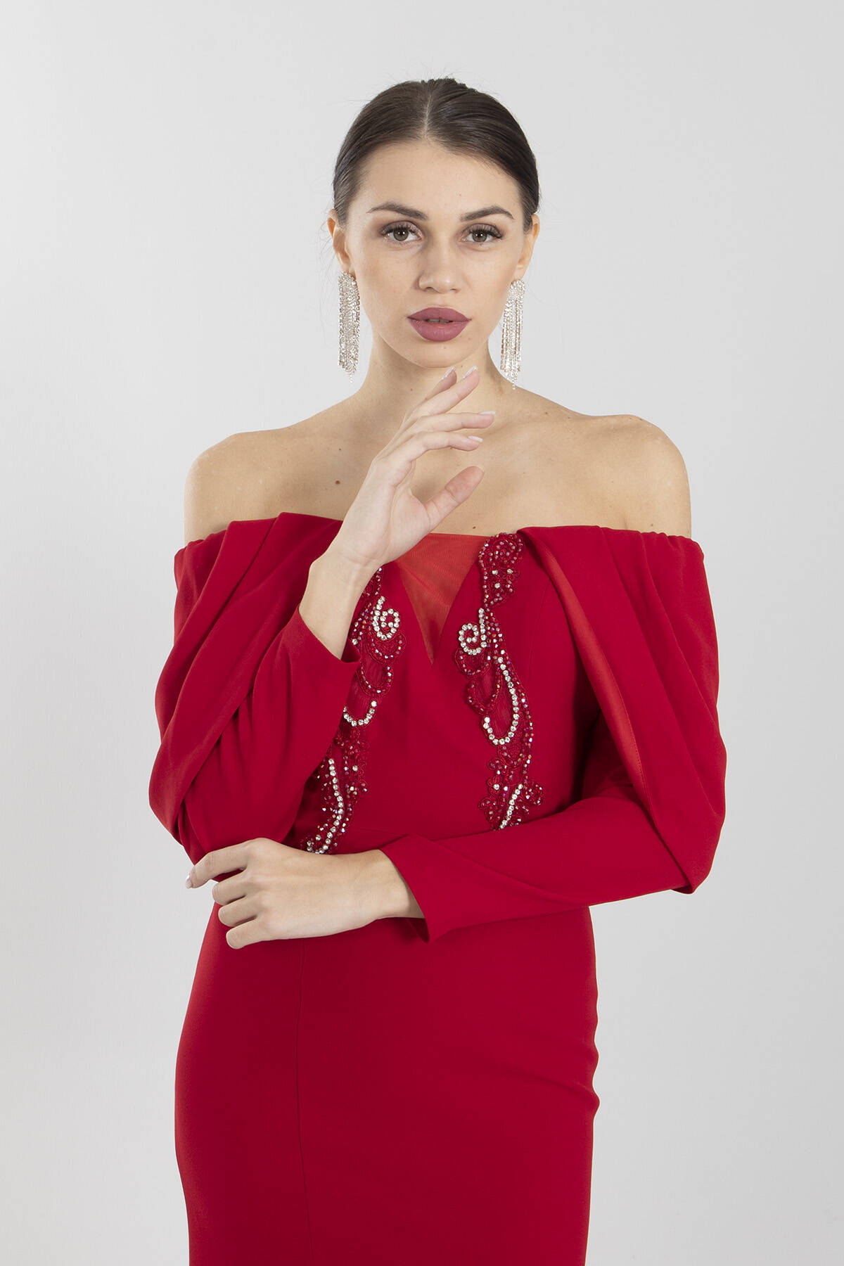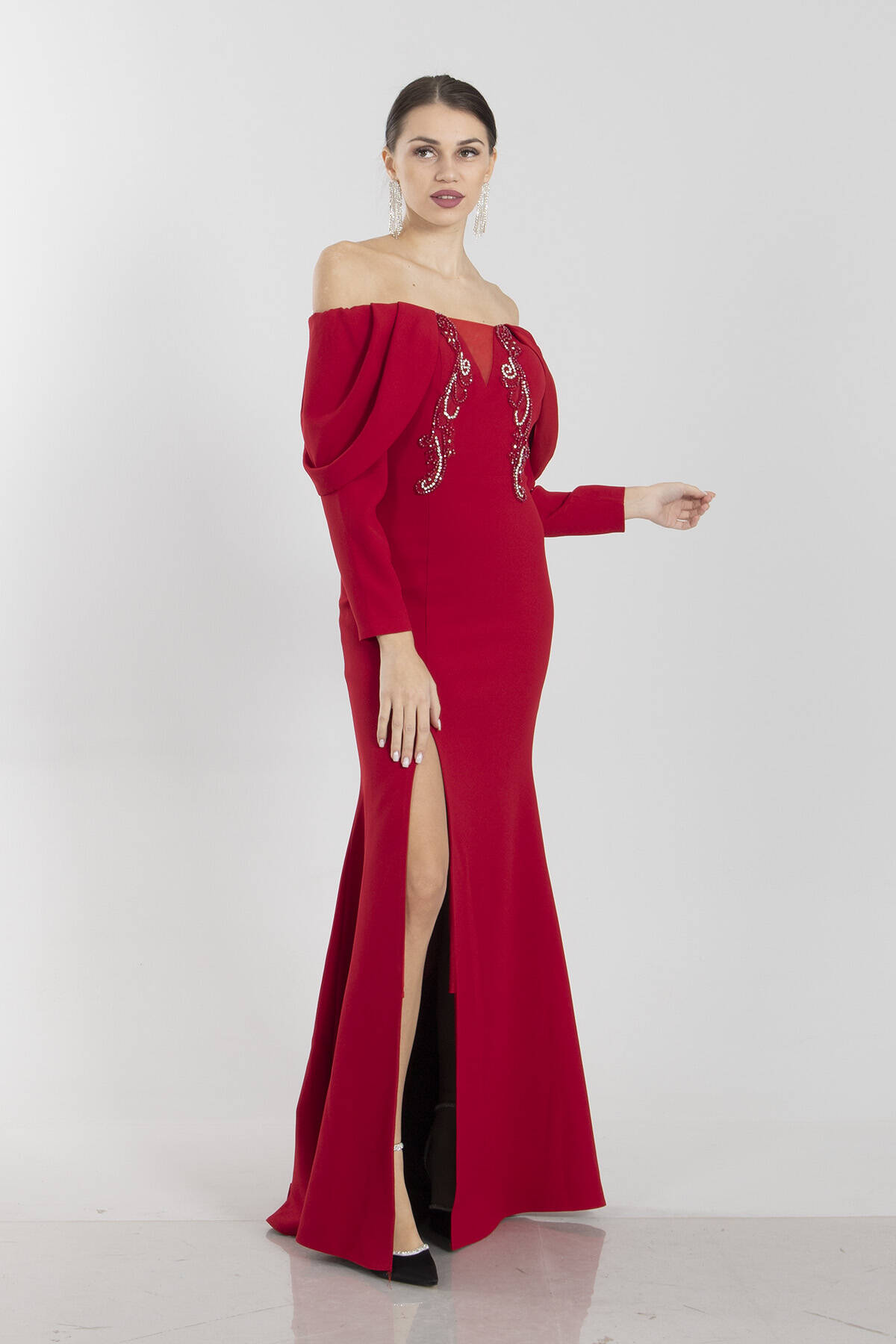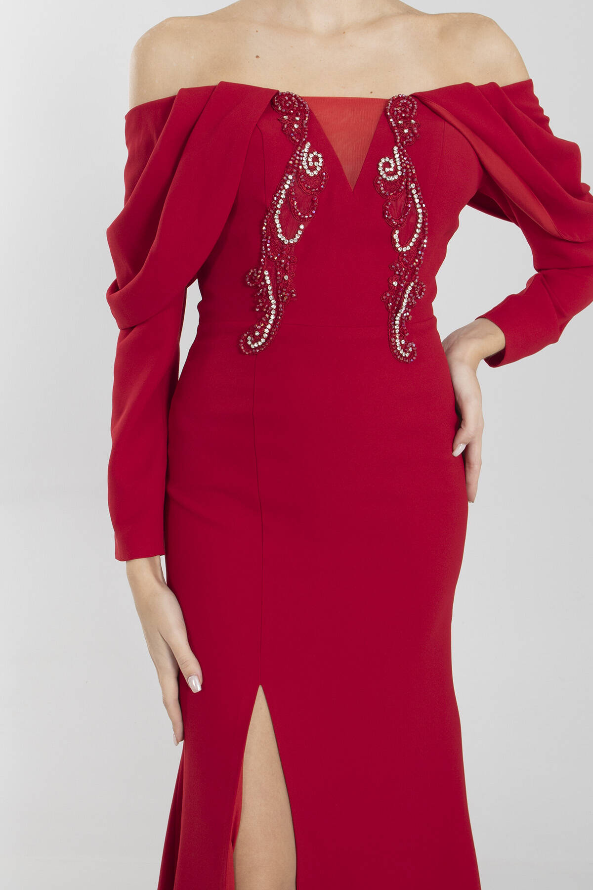 Modelin Ölçüleri : Boy: 1.80 cm / Göğüs: 88 cm / Bel: 69 cm /Basen : 94 cm Mankenin Üzerindeki Ürün 38/M Bedendir %100 Polyester Uzun Kol Kayık Yaka Önü Taşlı Tül Detaylı Yırtmaçlı Astarlı Krep Abiye Elbise Ürün Boyu : 145 cm Stüdyo Çekimlerinde Renkler Işık Farklılıgından Dolayı Değişiklik Gösterebilir (Dikkat! Ürünlerimiz güvenlik bandı ile gönderilmektedir . Güvenlik bandı olmayan ürünlerin iadesi kabul edilmeyecektir)