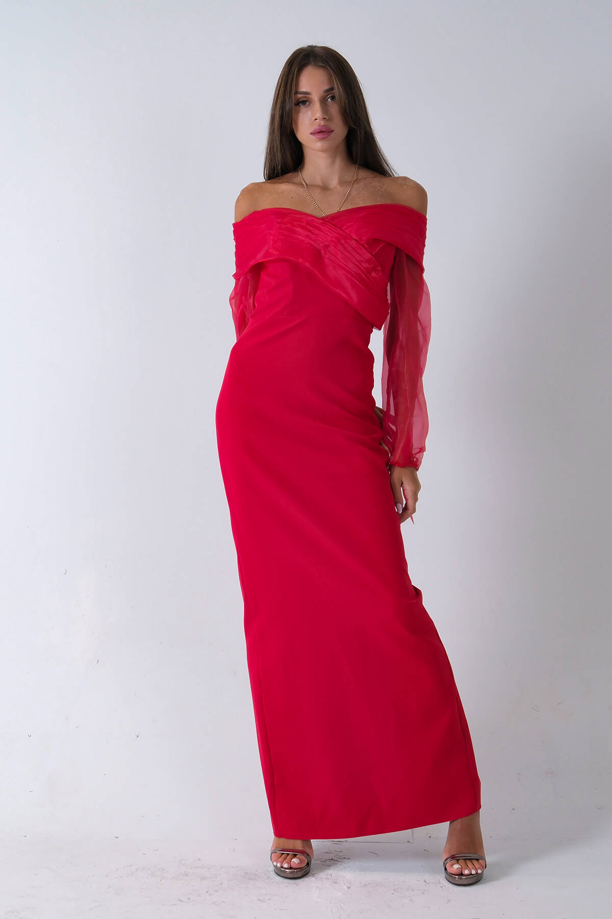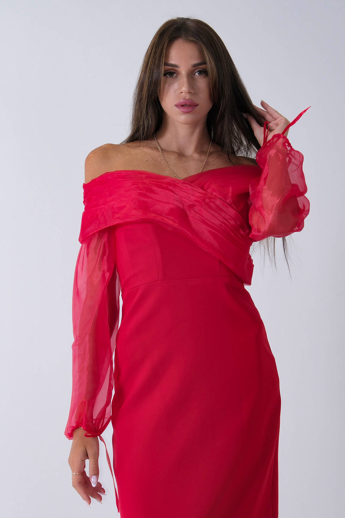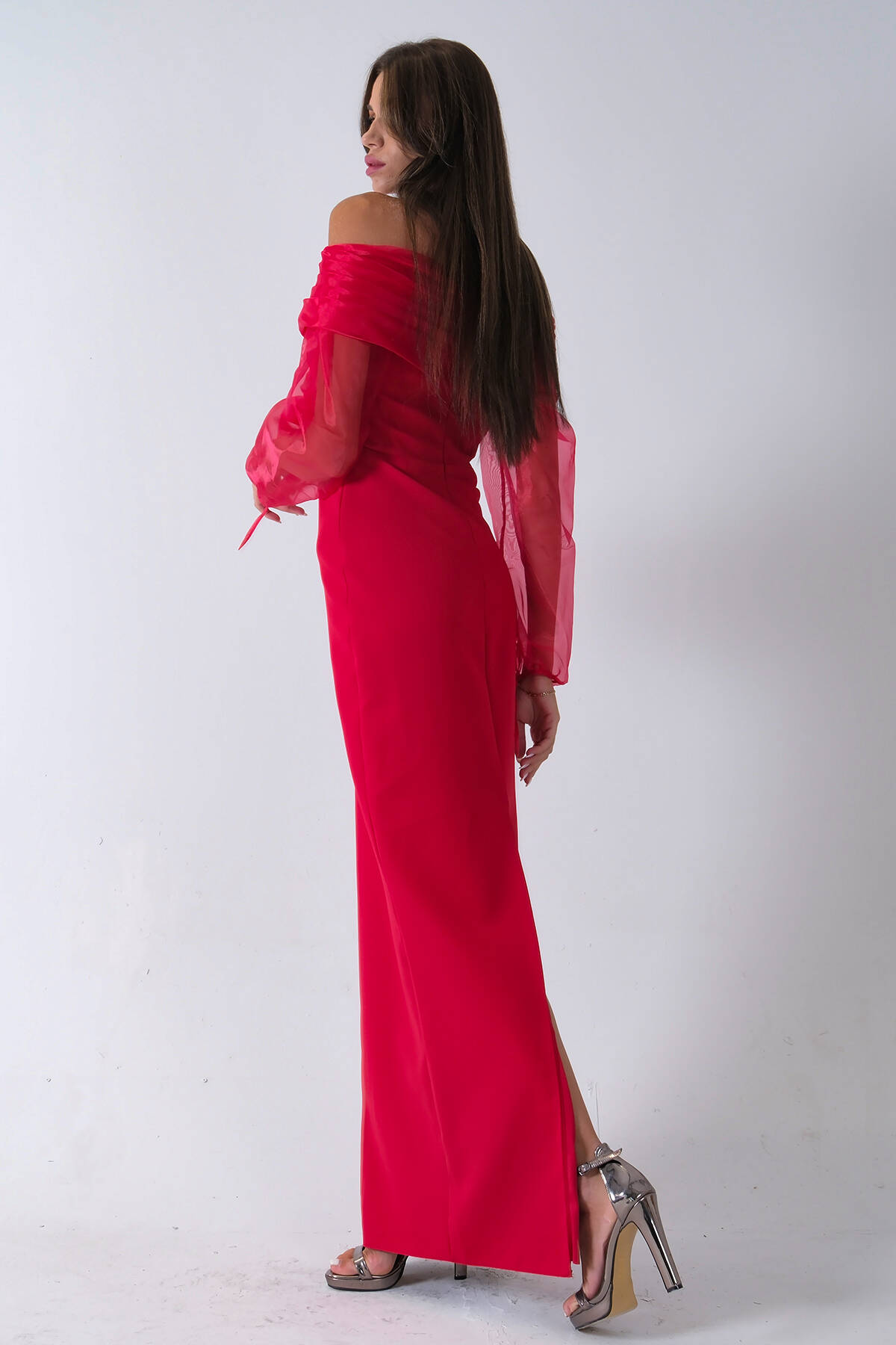 Kırmızı Organze Kol Detaylı Kayık Yaka Abiye 0801086.08