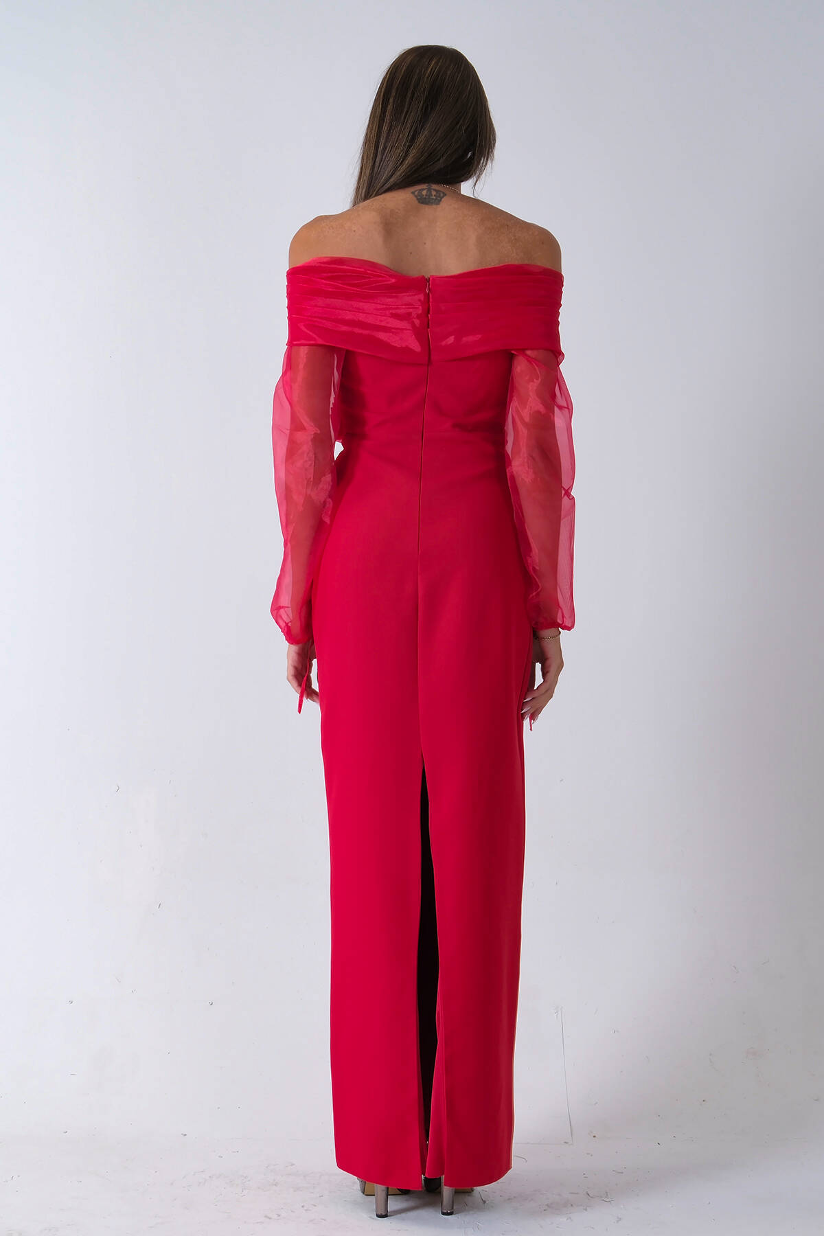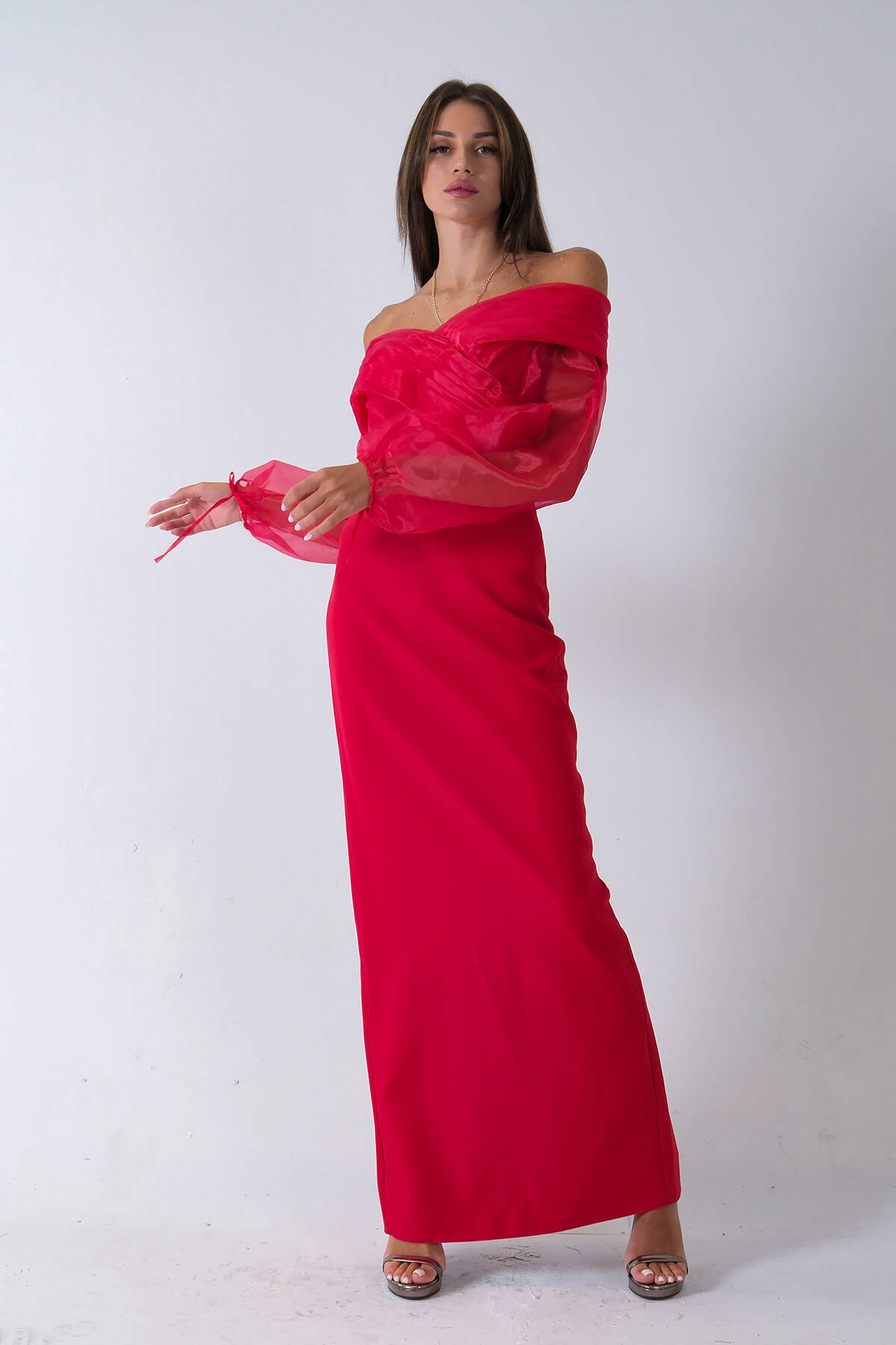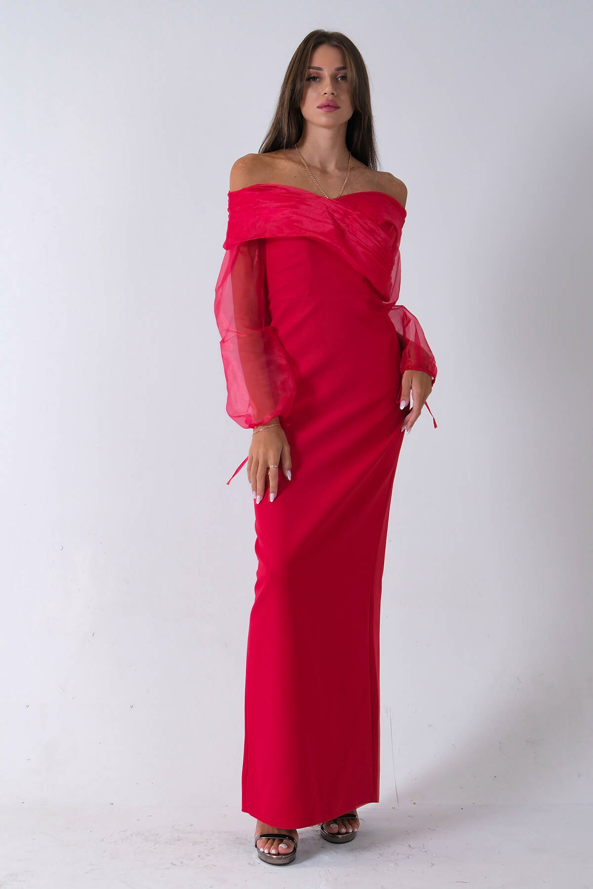 Kırmızı Organze Kol Detaylı Kayık Yaka Abiye 0801086.08