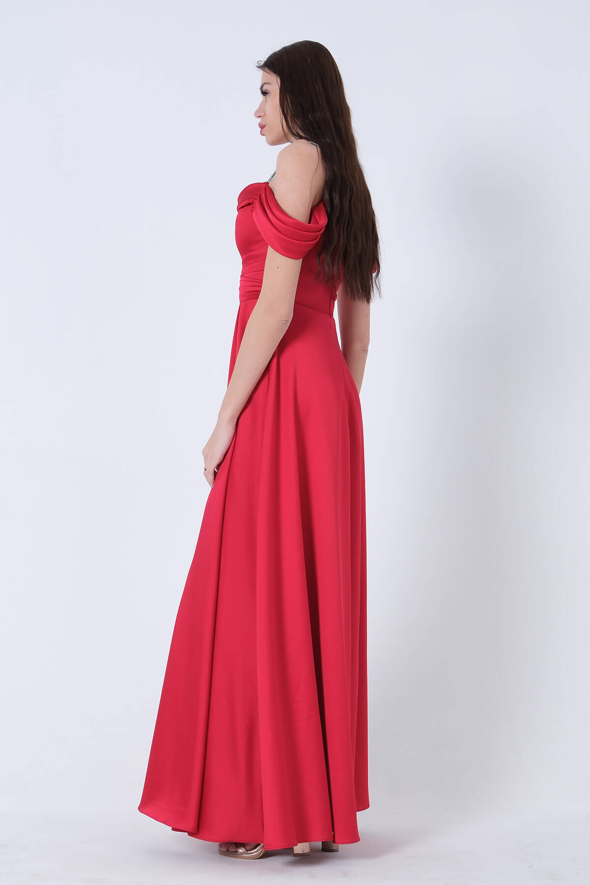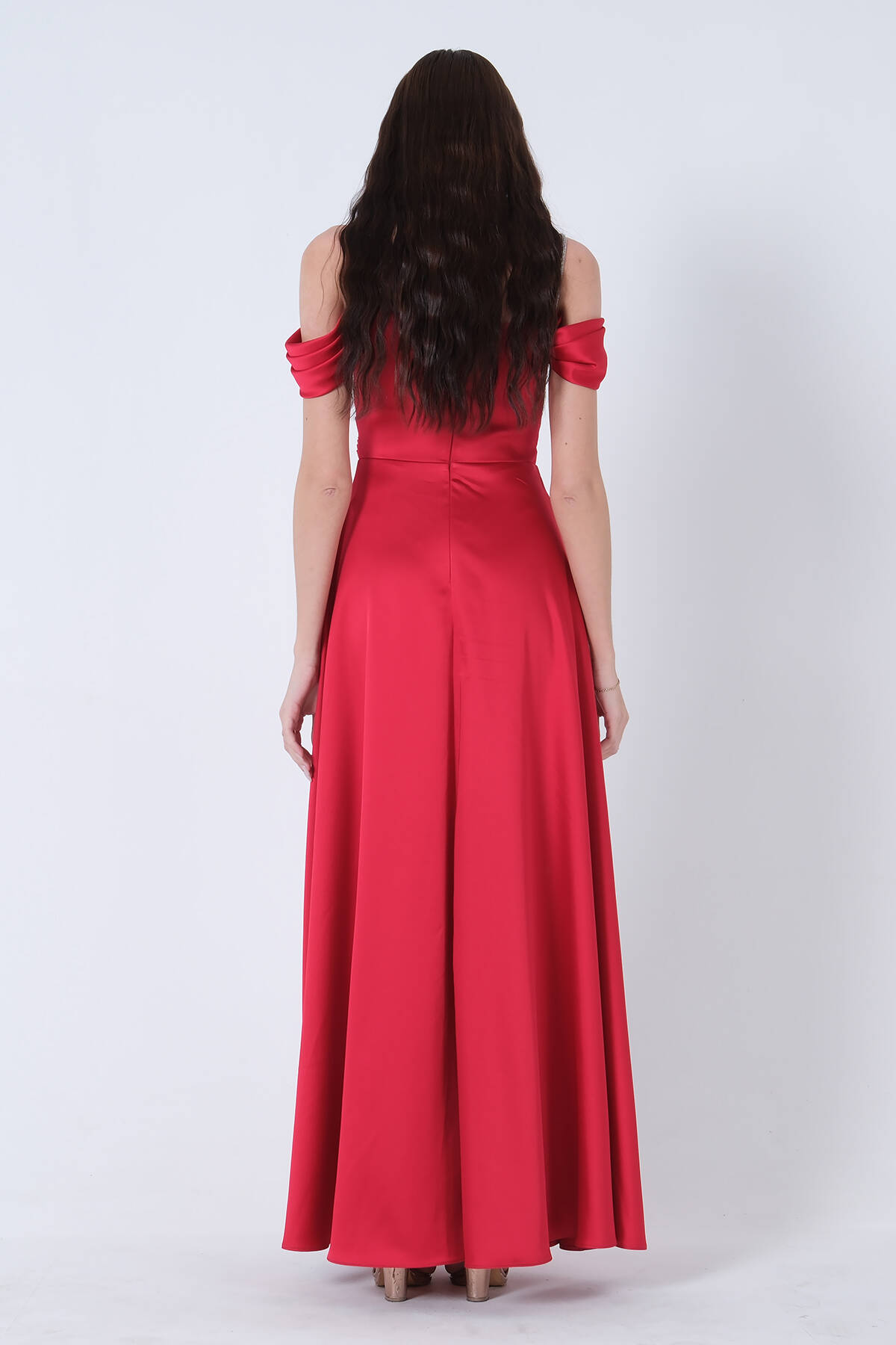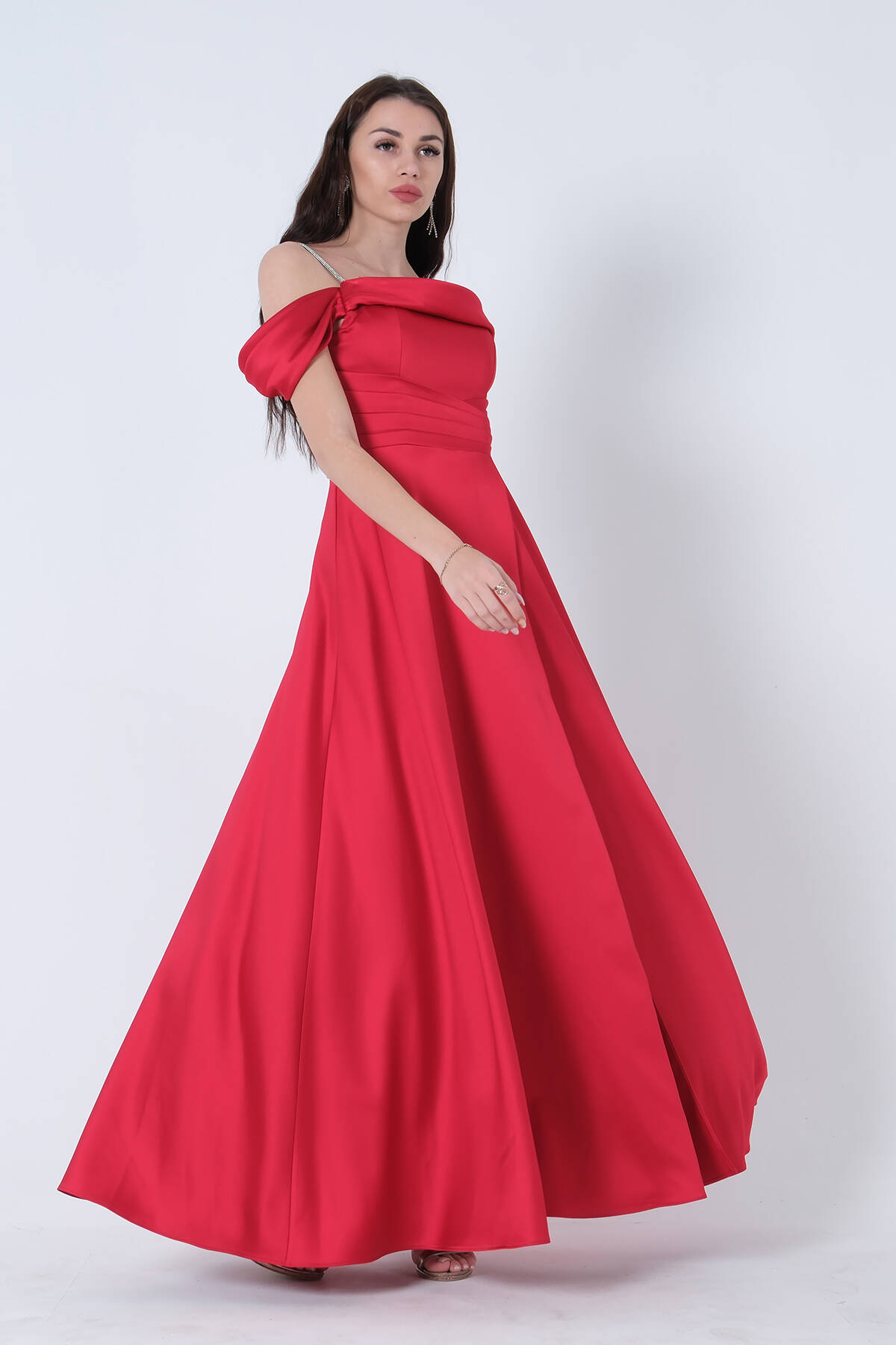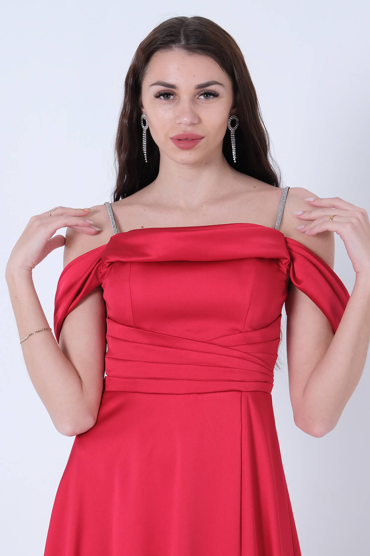 Kırmızı Taş Askılı Düşük Kol Saten Abiye 0806118.08