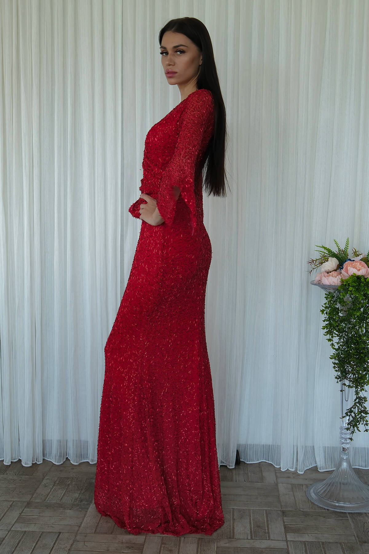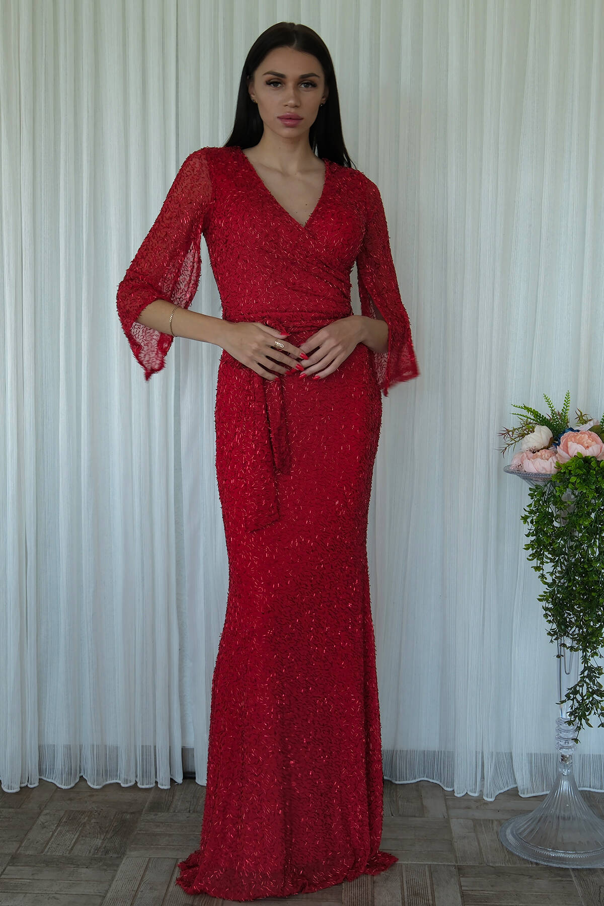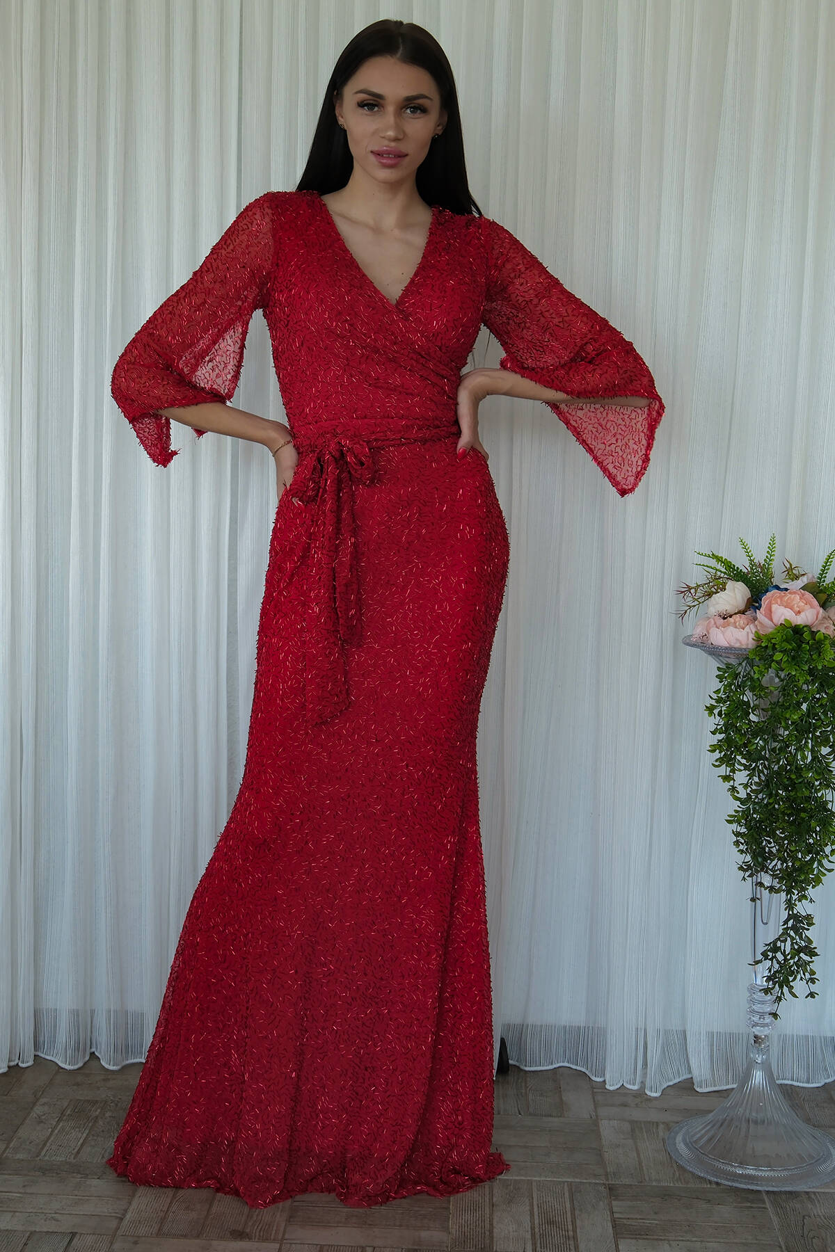 Kırmızı V Yaka Pul Payetli Uzun Kol Abiye 1106014.08